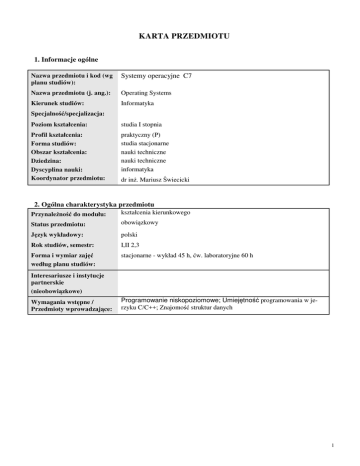 KARTA PRZEDMIOTU 1. Informacje ogólne Nazwa przedmiotu i kod (wg planu studiów): Systemy operacyjne C7 Nazwa przedmiotu (j. ang.): Operating Systems Kierunek studiów: Informatyka Specjalność/specjalizacja: Poziom kształcenia: studia I stopnia Profil kształcenia: Forma studiów: Obszar kształcenia: Dziedzina: Dyscyplina nauki: Koordynator przedmiotu: praktyczny (P) studia stacjonarne nauki techniczne nauki techniczne informatyka dr inż. Mariusz Świecicki 2. Ogólna charakterystyka przedmiotu Przynależność do modułu: kształcenia kierunkowego Status przedmiotu: obowiązkowy Język wykładowy: polski Rok studiów, semestr: I,II 2,3 Forma i wymiar zajęć według planu studiów: stacjonarne - wykład 45 h, ćw. laboratoryjne 60 h Interesariusze i instytucje partnerskie (nieobowiązkowe) Wymagania wstępne / Przedmioty wprowadzające: Programowanie niskopoziomowe; Umiejętność programowania w jerzyku C/C++; Znajomość struktur danych 1 3. Bilans punktów ECTS 9 (A+B) A. Liczba godzin wymagających bezpośredniego udziału nauczyciela (kontaktowych, w czasie rzeczywistym, w tym testy, egzaminy etc) z podziałem na typy zajęć oraz całkowita liczba punktów ECTS osiąganych na tych zajęciach wykład laboratorium egzamin konsultacje 45 60 2 10 W sumie: ECTS przygotowanie do kolokwium przygotowanie do laboratorium przygotowanie sprawozdań praca w sieci praca na platformie e-learningowej przygotowanie do egzaminu przygotowanie do konsultacji uzupełnienie/studiowanie notatek studiowanie zalecanej literatury 117 5 10 45 5 5 10 10 5 5 5 w sumie: ECTS 100 4 laboratorium praca na platformie e-learningowej przygotowanie do kolokwium egzamin 15 10 10 2 B. Poszczególne typy zadań do samokształcenia studenta (niewymagających bezpośredniego udziału nauczyciela) wraz z planowaną średnią liczbą godzin na każde i sumaryczną liczbą ECTS (np. praca w bibliotece, w sieci, na platformie e-learningowej, w laboratorium, praca nad projektem końcowym, przygotowanie ogólne; suma poszczególnych godzin powinna zgadzać się z liczbą ogólną) C. Liczba godzin praktycznych/laboratoryjnych w ramach przedmiotu oraz związana z tym liczba punktów ECTS (ta liczba nie musi być powiązana z liczbą godzin kontaktowych, niektóre zajęcia praktyczne/laboratoryjne mogą odbywać się bez udziału nauczyciela): ECTS stacjonarne Całkowita liczba punktów ECTS (wg planu studiów; 1 punkt =25-30 godzin pracy studenta, w tym praca na zajęciach i poza zajęciami): 1,48 4. Opis przedmiotu Cel przedmiotu: 1. Zapoznanie studentów z budowa i struktura systemu operacyjnego oraz funkcjonalnością wszystkich jego modułów 2. Zaznajomienie studentów z zasadami działania systemów operacyjnych: Unix, Linux i Windows 3. Zaznajomienie studentów z wybranymi funkcjami systemowymi systemu linux i praktyczne ich wykorzystanie. 4. Implementacja problemów synchronizacji i komunikacji procesów z wykorzystaniem systemowych mechanizmów IPC 5. Umiejętność posługiwania się językiem powłoki, przy rozhisteryzowaniu elementarnych problemów z zakresu administrowania systemem komputerowym Metody dydaktyczne: np. podające (wykład), problemowe (konwersatorium, seminarium), aktywizujące (symulacja, metoda przypadków itp. ), eksponujace (pokaz, film), praktyczne (ćwiczenia, metoda projektów itp) – pełniejszy wykaz poniżej (prosimy wybrać najstosowniejsze - jedną lub więcej, można dodać 2 własne metody) wykład informacyjny, wykład problemowy, pokaz, ćwiczenia laboratoryjne Treści kształcenia (w rozbiciu na formę zajęć (jeśli są różne formy) i najlepiej w punktach): Wykłady: 1. Wprowadzenie. Rozwój i przeglad systemów operacyjnych. Zadania i właściwości systemu operacyjnego. 2. Struktury systemów operacyjnych. Jadro systemu, podstawowe udogodnienia sprzetowe (mechanizm przerwań, ochrona pamięci operacyjnej, zbiór rozkazów uprzywilejowanych, zegar czasu rzeczywistego) 3. Hierarchia pamięci. Organizacja pamięci pomocniczej. Podsystem plików 4. Organizacja systemu plików, katalogi plików, współużytkowanie i ochrona informacji, integralnosc systemu plików. Zarządzanie wolna przestrzenią na dysku. 5. System plików EXT3 (UNIX, LINUX) oraz system plików FAT, NTFS (WINDOWS NT). 6. Podstawowe wiadomości o procesach i watkach, zarządzanie procesami, stany procesu, atrybuty procesu. 7. Planowanie przydziału procesora - przegląd algorytmów przydziału procesora. 8. Zagadnienia związane z szeregowaniem zadań dobór właściwego algorytmu do specyfiki aplikacji. 9. Współbieżność procesów i synchronizacja. Gniazda, Semafory, operacje semaforowe (czekaj i sygnalizuj) 10. Rozwiązywanie klasycznych problemów synchronizacji (producent-konsument, piszacy-czytajacy, pięciu filozofów). 11. Komunikacja miedzy procesami (pliki, sygnały, łącza nienazwane, kolejki FIFO, semafory, kolejki komunikatów, pamięć dzielona). 12. Zakleszczenia graf przydziału zasobów, algorytm piekarniany. Metody obsługi zakleszczeń. 13. Zarządzanie pamięcią operacyjna. Strategie przydziału pamięci, segmentacja, stronicowanie, stronicowanie wielopoziomowe, segmentacja ze stronicowaniem 14. Pamięć wirtualna, stronicowanie na zadanie, sprawność stronicowania na zadanie. Algorytmy zastępowania stron. Przydział ramek. Szamotanie zapobieganie szamotaniu. 15. System wejscia/wyjscia. Interfejs programowy we/wy. Podsystem we/wy w jadrze. Wydajność systemu we/wy. 16. Bezpieczeństwo i ochrona Ćwiczenia laboratoryjne: 1. Omówienie tematyki zajęć, warunki zaliczenia. Polecenia systemu Linux 2. System plikowy - prawa dostępu, linki, przeszukiwanie systemu plików 3. Powłoka Bash - zmienne, aliasy, pliki konfiguracyjne, jerzyk skryptowy powłoki 4. Skrypty powłoki. AWK 5. Procesy - funkcje systemowe fork, exec, wait,exit. 3 6. Funkcje systemowe związane z plikami, czasem, potoki, kolejki FIFO. 7. Szeregowanie zadań. Watki. 8. Synchronizacja procesów przy pomocy semaforów