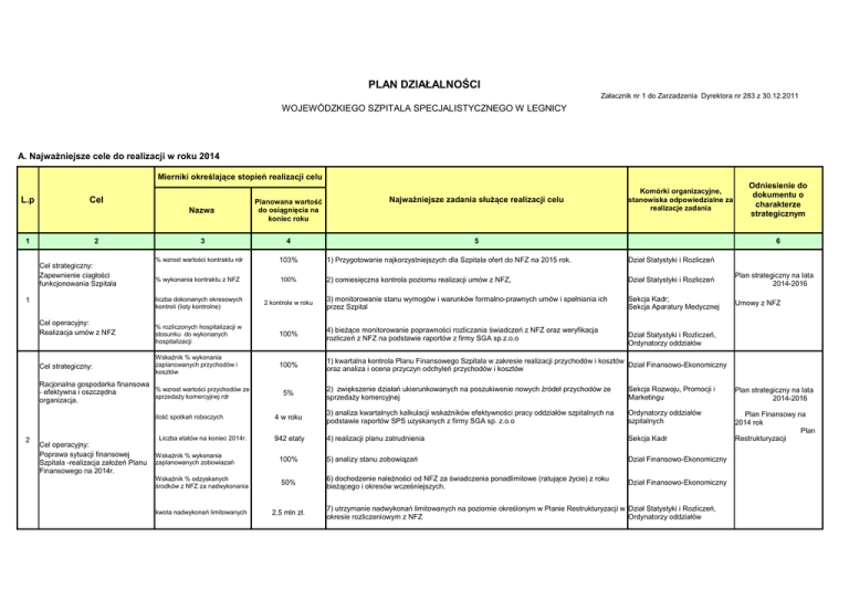 PLAN DZIAŁALNOŚCI Załacznik nr 1 do Zarzadzenia Dyrektora nr 283 z 30.12.2011 WOJEWÓDZKIEGO SZPITALA SPECJALISTYCZNEGO W LEGNICY A. Najważniejsze cele do realizacji w roku 2014 Mierniki określające stopień realizacji celu L.p Cel 1 2 Cel strategiczny: Zapewnienie ciagłości funkcjonowania Szpitala 1 Cel operacyjny: Realizacja umów z NFZ Cel strategiczny: Planowana wartość do osiągnięcia na koniec roku Najważniejsze zadania służące realizacji celu Nazwa 3 4 5 6 103% 1) Przygotowanie najkorzystniejszych dla Szpitala ofert do NFZ na 2015 rok. Dział Statystyki i Rozliczeń % wykonania kontraktu z NFZ 100% 2) comiesięczna kontrola poziomu realizacji umów z NFZ, Dział Statystyki i Rozliczeń Plan strategiczny na lata 2014-2016 liczba dokonanych okresowych kontroli (listy kontrolne) 2 kontrole w roku 3) monitorowanie stanu wymogów i warunków formalno-prawnych umów i spełniania ich przez Szpital Sekcja Kadr; Sekcja Aparatury Medycznej Umowy z NFZ % rozliczonych hospitalizacji w stosunku do wykonanych hospitalizacji 100% 4) bieżące monitorowanie poprawności rozliczania świadczeń z NFZ oraz weryfikacja rozliczeń z NFZ na podstawie raportów z firmy SGA sp.z.o.o Wskażnik % wykonania zaplanowanych przychodów i kosztów 100% 1) kwartalna kontrola Planu Finansowego Szpitala w zakresie realizacji przychodów i kosztów Dział Finansowo-Ekonomiczny oraz analiza i ocena przyczyn odchyleń przychodów i kosztów Dział Statystyki i Rozliczeń, Ordynatorzy oddziałów 5% 2) zwiększenie działań ukierunkowanych na poszukiwenie nowych źródeł przychodów ze sprzedaży komercyjnej Sekcja Rozwoju, Promocji i Marketingu Plan strategiczny na lata 2014-2016 4 w roku 3) analiza kwartalnych kalkulacji wskaźników efektywności pracy oddziałów szpitalnych na podstawie raportów SPS uzyskanych z firmy SGA sp. z.o.o Ordynatorzy oddziałów szpitalnych 942 etaty 4) realizacji planu zatrudnienia Sekcja Kadr Plan Finansowy na 2014 rok Plan Restrukturyzacji 100% 5) analizy stanu zobowiązań Dział Finansowo-Ekonomiczny Wskaźnik % odzyskanych środków z NFZ za nadwykonania 50% 6) dochodzenie należności od NFZ za świadczenia ponadlimitowe (ratujące życie) z roku bieżącego i okresów wcześniejszych. Dział Finansowo-Ekonomiczny kwota nadwykonań limitowanych 2,5 mln zł. ilość spotkań roboczych Cel operacyjny: Poprawa sytuacji finansowej Szpitala -realizacja założeń Planu Finansowego na 2014r. Odniesienie do dokumentu o charakterze strategicznym % wzrost wartości kontraktu rdr Racjonalna gospodarka finansowa % wzrost wartości przychodów ze - efektywna i oszczędna sprzedaży komercyjnej rdr organizacja. 2 Komórki organizacyjne, stanowiska odpowiedzialne za realizacje zadania Liczba etatów na koniec 2014r. Wskażnik % wykonania zaplanowanych zobowiazań 7) utrzymanie nadwykonań limitowanych na poziomie określonym w Planie Restrukturyzacji w Dział Statystyki i Rozliczeń, okresie rozliczeniowym z NFZ Ordynatorzy oddziałów PLAN DZIAŁALNOŚCI Załacznik nr 1 do Zarzadzenia Dyrektora nr 283 z 30.12.2011 WOJEWÓDZKIEGO SZPITALA SPECJALISTYCZNEGO W LEGNICY Mierniki określające stopień realizacji celu Cel L.p 1 2 Nazwa Planowana wartość do osiągnięcia na koniec roku 3 4 Akredytacja Certyfikat Najważniejsze zadania służące realizacji celu Komórki organizacyjne, stanowiska odpowiedzialne za realizacje zadania 5 1) uzyskanie Certyfikatu Akredytacyjnego Odniesienie do dokumentu o charakterze strategicznym 6 Pełnomocnik ds. Jakości Cel strategiczny: 3 Profesjonalizm w działalności Szpitala liczba skarg zgłaszanych przez pacjentów 2) monitorowanie ilości składanych skarg i uwag przez pacjentów do Rzecznika Praw Pacjenta. 1. Plan strategiczny na Pełnomocnik ds. Praw Pacjenta lata 2013 -2016 Rejestry skarg i uwag Cel operacyjny: 3) monitorowanie ilości skarg i uwag w oddziałach szpitalnych i poradniach, Wskaźnik zadowolenia pacjenta leczonego w WSS Podniesienie jakości usług Cel operacyjny: Realizacja zadań inwestycyjnych ujętych w planie finansowym na 2014 r. wzrost pozytywnych opinii ze strony ankietowanych rdr. 4) badanie zadowolenia pacjenta z udzielanych świadczeń medycznych 2 razy do roku i ocena uzyskanych z ankiet danych. Cel strategiczny: Umacnianie pozycji Szpitala 4 spadek skarg rdr Wskażnik % wykonania zaplanowanej wartości całego zadania Pełnomocnik ds. Praw Pacjenta 2. 3. Księga jakości Pełnomocnik ds. Jakości 100% 1) Modernizacja sieci ciepłowniczej oraz instalacja systemu fotowoltaicznego. Dział AdministracyjnoTechniczny 100% 2) E-Zdrowie etap II – elektroniczna dokumentacja medyczna Sekcja Informatyki 33% 3) Kompleksowa modernizacja urządzeń dźwigowych (wind) Dział AdministracyjnoTechniczny 100% 4) Przebudowa wejścia głównego do Szpitala Dział AdministracyjnoTechniczny 52% 5) Przebudowa, modernizacja i doposażenie oddziału Ginekologiczno-Położniczego oraz Bloku Porodowego Dział AdministracyjnoTechniczny Plan strategiczny na lata 2014-2016 100% 6) Remont instalacji wody zapasowej o pojemności 500 m3 Dział AdministracyjnoTechniczny Plan Finansowy na 2014 rok 76% 7) Program „Mały Dolnoślązak” – zakup sprzętu medycznego na neonatologię i oddział położniczy. Sekcja Aparatury Medycznej 8) Zakończenie budowy instalacji do wytwarzania energii elektrycznej i ciepła w wysokosprawnej kogeneracji. Dział AdministracyjnoTechniczny 100% PLAN DZIAŁALNOŚCI Załacznik nr 1 do Zarzadzenia Dyrektora nr 283 z 30.12.2011 WOJEWÓDZKIEGO SZPITALA SPECJALISTYCZNEGO W LEGNICY Mierniki określające stopień realizacji celu L.p Cel 1 2 Planowana wartość do osiągnięcia na koniec roku Najważniejsze zadania służące realizacji celu Nazwa 3 4 5 Komórki organizacyjne, stanowiska odpowiedzialne za realizacje zadania Odniesienie do dokumentu o charakterze strategicznym 6 Cel strategiczny: Zwiekszenie potencjału w zakresie dostarczania usług medycznych 5 Cel operacyjny: Wskaźnik % wartości zrealizowanyc