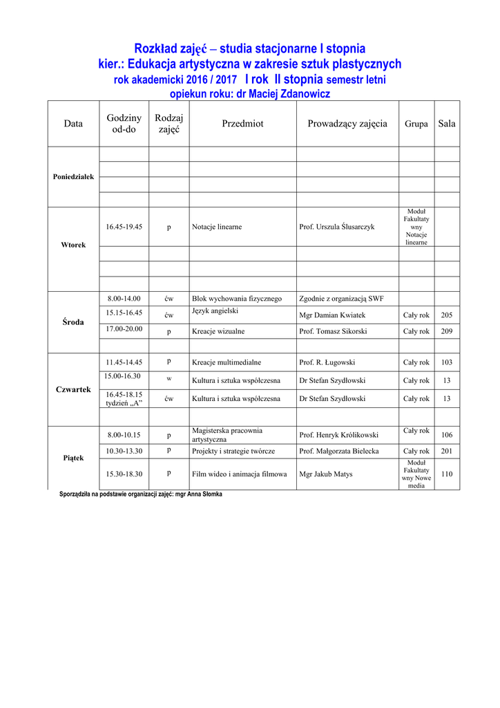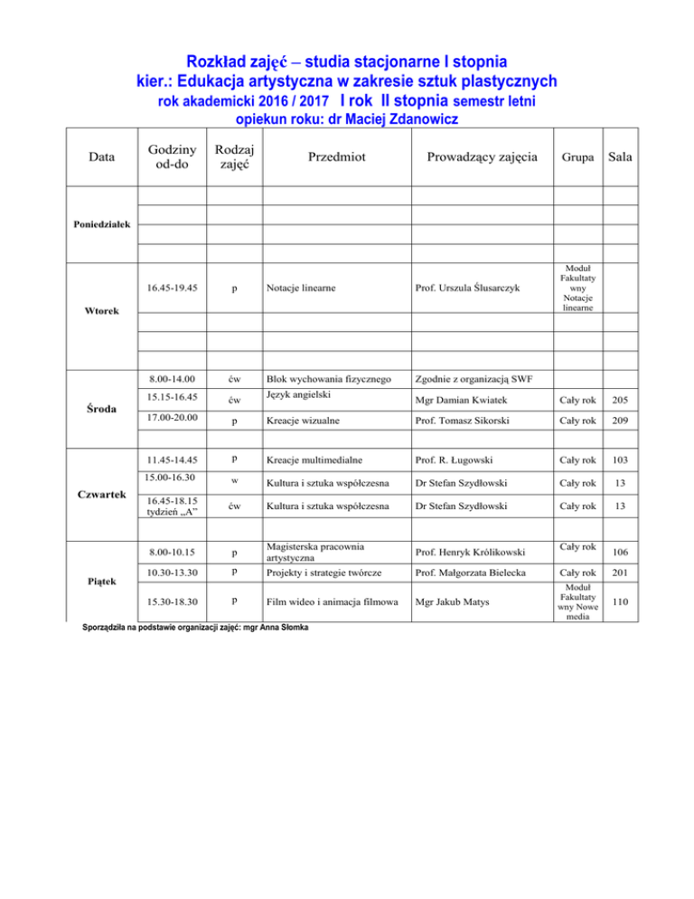 Rozkład zajęć – studia stacjonarne I stopnia kier.: Edukacja artystyczna w zakresie sztuk plastycznych rok akademicki 2016 / 2017 I rok II stopnia semestr letni opiekun roku: dr Maciej Zdanowicz Data Godziny od-do Rodzaj zajęć Przedmiot Prowadzący zajęcia Grupa Sala Poniedziałek 16.45-19.45 p 8.00-14.00 ćw 15.15-16.45 ćw 17.00-20.00 p 11.45-14.45 Notacje linearne Prof. Urszula Ślusarczyk Blok wychowania fizycznego Zgodnie z organizacją SWF Wtorek Środa Czwartek Piątek Język angielski Moduł Fakultaty wny Notacje linearne Mgr Damian Kwiatek Cały rok 205 Kreacje wizualne Prof. Tomasz Sikorski Cały rok 209 p Kreacje multimedialne Prof. R. Ługowski Cały rok 103 15.00-16.30 w Kultura i sztuka współczesna Dr Stefan Szydłowski Cały rok 13 16.45-18.15 tydzień „A” ćw Kultura i sztuka współczesna Dr Stefan Szydłowski Cały rok 13 8.00-10.15 p Magisterska pracownia artystyczna Prof. Henryk Królikowski 10.30-13.30 p Projekty i strategie twórcze Prof. Małgorzata Bielecka Cały rok 201 15.30-18.30 p Film wideo i animacja filmowa Mgr Jakub Matys Moduł Fakultaty wny Nowe media 110 Sporządziła na podstawie organizacji zajęć: mgr Anna Słomka Cały rok 106