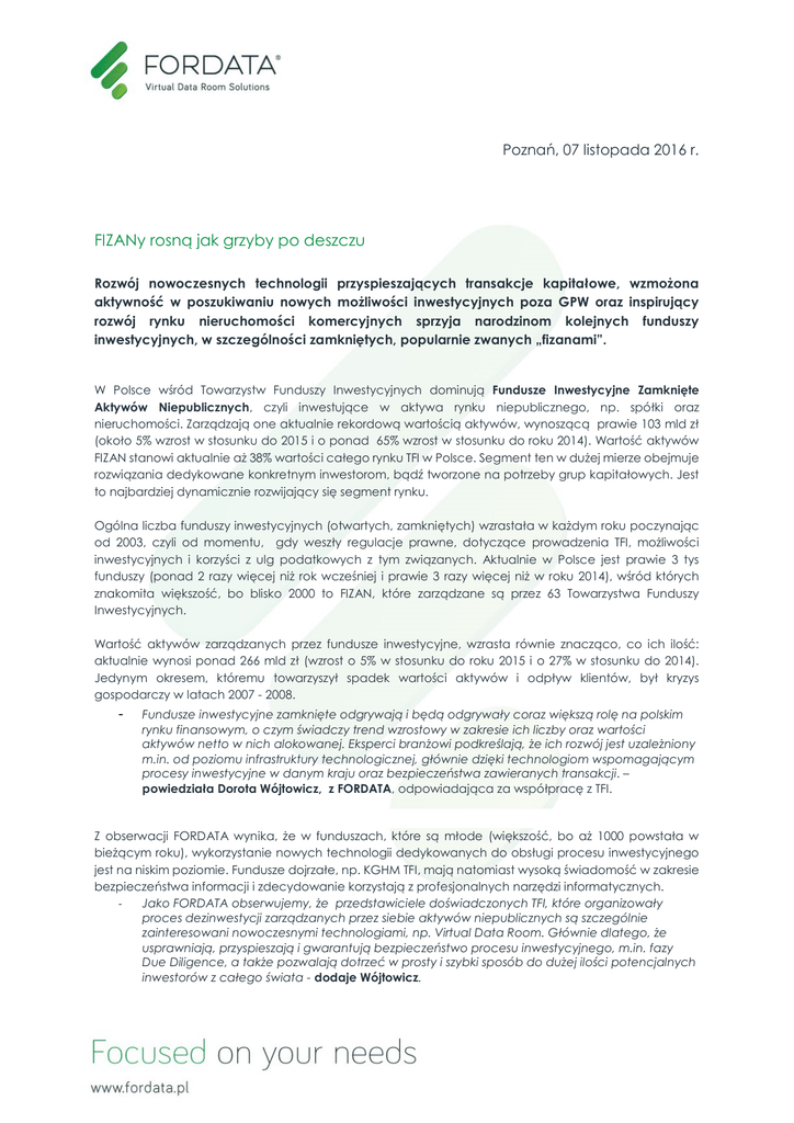 Poznań, 07 listopada 2016 r. FIZANy rosną jak grzyby po deszczu Rozwój nowoczesnych technologii przyspieszających transakcje kapitałowe, wzmożona aktywność w poszukiwaniu nowych możliwości inwestycyjnych poza GPW oraz inspirujący rozwój rynku nieruchomości komercyjnych sprzyja narodzinom kolejnych funduszy inwestycyjnych, w szczególności zamkniętych, popularnie zwanych „fizanami”. W Polsce wśród Towarzystw Funduszy Inwestycyjnych dominują Fundusze Inwestycyjne Zamknięte Aktywów Niepublicznych, czyli inwestujące w aktywa rynku niepublicznego, np. spółki oraz nieruchomości. Zarządzają one aktualnie rekordową wartością aktywów, wynoszącą prawie 103 mld zł (około 5% wzrost w stosunku do 2015 i o ponad 65% wzrost w stosunku do roku 2014). Wartość aktywów FIZAN stanowi aktualnie aż 38% wartości całego rynku TFI w Polsce. Segment ten w dużej mierze obejmuje rozwiązania dedykowane konkretnym inwestorom, bądź tworzone na potrzeby grup kapitałowych. Jest to najbardziej dynamicznie rozwijający się segment rynku. Ogólna liczba funduszy inwestycyjnych (otwartych, zamkniętych) wzrastała w każdym roku poczynając od 2003, czyli od momentu, gdy weszły regulacje prawne, dotyczące prowadzenia TFI, możliwości inwestycyjnych i korzyści z ulg podatkowych z tym związanych. Aktualnie w Polsce jest prawie 3 tys funduszy (ponad 2 razy więcej niż rok wcześniej i prawie 3 razy więcej niż w roku 2014), wśród których znakomita większość, bo blisko 2000 to FIZAN, które zarządzane są przez 63 Towarzystwa Funduszy Inwestycyjnych. Wartość aktywów zarządzanych przez fundusze inwestycyjne, wzrasta równie znacząco, co ich ilość: aktualnie wynosi ponad 266 mld zł (wzrost o 5% w stosunku do roku 2015 i o 27% w stosunku do 2014). Jedynym okresem, któremu towarzyszył spadek wartości aktywów i odpływ klientów, był kryzys gospodarczy w latach 2007 - 2008. - Fundusze inwestycyjne zamknięte odgrywają i będą odgrywały coraz większą rolę na polskim rynku finansowym, o czym świadczy trend wzrostowy w zakresie ich liczby oraz wartości aktywów netto w nich alokowanej. Eksperci branżowi podkreślają, że ich rozwój jest uzależniony m.in. od poziomu infrastruktury technologicznej, głównie dzięki technologiom wspomagającym procesy inwestycyjne w danym kraju oraz bezpieczeństwa zawieranych transakcji. – powiedziała Dorota Wójtowicz, z FORDATA, odpowiadająca za współpracę z TFI. Z obserwacji FORDATA wynika, że w funduszach, które są młode (większość, bo aż 1000 powstała w bieżącym roku), wykorzystanie nowych technologii dedykowanych do obsługi procesu inwestycyjnego jest na niskim poziomie. Fundusze dojrzałe, np. KGHM TFI, mają natomiast wysoką świadomość w zakresie bezpieczeństwa informacji i zdecydowanie korzystają z profesjonalnych narzędzi informatycznych. Jako FORDATA obserwujemy, że przedstawiciele doświadczonych TFI, które organizowały proces dezinwestycji zarządzanych przez siebie aktywów niepublicznych są szczególnie zainteresowani nowoczesnymi technologiami, np. Virtual Data Room. Głównie dlatego, że usprawniają, przyspieszają i gwarantują bezpieczeństwo procesu inwestycyjnego, m.in. fazy Due Diligence, a także pozwalają dotrzeć w prosty i szybki sposób do dużej ilości potencjalnych inwestorów z całego świata - dodaje Wójtowicz. - Jak potwierdza Robert Rozmus, Wiceprezes KGHM TFI S.A. „Oferowany przez FORDATA system Virtual Data Room został wykorzystany przez jedną ze spółek portfelowych KGHM TFI, w celu wymiany poufnej dokumentacji z jej partnerami biznesowymi. System wpłynął na efektowność i ułatwił zarządzanie procesem. Pozwolił nie tylko w sposób bezpieczny i kontrolowany udostępnić poufne informacje zewnętrznym firmom, ale uprościł także proces komunikacji.” Źródła: http://inime.org/wp-content/uploads/2014/12/Fundusze1.pdf http://www.izfa.pl/pl/21,dane-statystyczne.html -FORDATA jest pionierem na polskim rynku kapitałowym. W oparciu o autorskie systemy informatyczne, bazujące na technologii Virtual Data Room usprawniamy zarządzanie dokumentami i komunikacją podczas złożonych procesów transakcyjnych. Wspieramy największe transakcje M&A, restrukturyzacje, inwestycje Private Equity, projekty związane z pozyskiwaniem finansowania (emisje akcji, obligacji, negocjowanie kredytów), projekty z branży nieruchomości komercyjnych, procesy sprzedaży pakietów wierzytelności w Polsce oraz w innych krajach Europy Środkowej i Wschodniej. Nasze systemy podniosły bezpieczeństwo i efektywność kilkuset transakcji różnego typu, o łącznej wartości ponad 32 mld PLN. Z usług FORDATA korzystają liderzy branż w Polsce i za granicą: fundusz Private Equity Enterprise Investors, Enea SA, Home.pl, Grupa LOTOS, PZU SA, Grant Thornton, NFI Empik, ZELMER, Bank DNB, BOŚ Bank, Polimex Mostostal, Budimex, DM PKO Banku Polskiego, Deloitte Advisory, EY, KPMG Advisory, JSW, HAITONG oraz wiele innych. Kontakt dla mediów: Aleksandra Prusator, e-mail: [email protected], tel: 506 044 056 Beata Milewicz, e-mail: [email protected], tel: 508 051 138