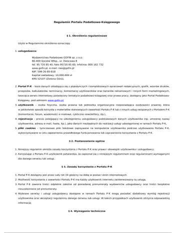 Regulamin Portalu Podatkowo-Księgowego § 1. Określenia regulaminowe Użyte w Regulaminie określenia oznaczają: 1. usługodawca: Wydawnictwo Podatkowe GOFIN sp. z o.o. 66-400 Gorzów Wlkp., ul. Owocowa 8 tel. 95 720 85 40, faks 95720 85 60, infolinia: 800 162 732 www.gofin.pl, e-mail: [email protected] NIP: 599-26-85-818 Kapitał zakładowy: 10.000.000 zł KRS 52107 (Zielona Góra), 2. Portal P-K – baza danych składająca się z pojedynczych i kompleksowych opracowań redakcyjnych, grafik, wzorów druków, przepisów, kalkulatorów, terminarzy, komentarzy użytkowników oraz banerów reklamowych i innych form marketingowych, tworząca serwis internetowy poświęcony tematyce podatkowo-księgowej oraz prawa pracy, dostępny jako Portal PodatkowoKsięgowy, pod adresem www.gofin.pl, 3. użytkownik – osoba fizyczna, osoba prawna lub jednostka organizacyjna nieposiadająca osobowości prawnej, która w jakikolwiek sposób korzysta z materiałów stanowiących zawartość Portalu P-K lub z innych usług związanych z Portalem P-K (komentarze, forum, wiadomości e-mailowe, cykliczne newslettery, itp.), 4. rejestracja – proces polegający na udostępnieniu usługodawcy podstawowych danych użytkownika (np. umownej nazwy użytkownika, adresu e-mail, hasła, itp.), jako danych niezbędnych do realizacji usługi udostępnionej w ramach Portalu P-K, 5. pliki cookies – tymczasowe pliki tekstowe zapisywane na komputerze użytkownika podczas użytkowania Portalu P-K, wykorzystywane w celu zapewnienia prawidłowego funkcjonowania lub usprawnienia korzystania z Portalu P-K. § 2. Postanowienia ogólne 1. Niniejszy regulamin określa zasady korzystania z Portalu P-K oraz prawa i obowiązki użytkownika i usługodawcy. 2. Korzystając z Portalu P-K użytkownik potwierdza, że zapoznał się z niniejszym regulaminem oraz regulaminami wymaganymi dla danego serwisu lub usługi. § 3. Zasady korzystania z Portalu P-K 1. Portal P-K dostępny jest przez cały rok 24 godziny na dobę w postaci stron internetowych. 2. Możliwość korzystania z zawartości Portalu P-K ma każdy użytkownik internetu zainteresowany tą usługą. 3. Portal P-K zawiera treści odpłatne zależne od posiadanej prenumeraty wydawnictw usługodawcy oraz treści bezpłatne nieuzależnione od prenumeraty. 4. Wybrane serwisy i usługi usługodawcy dostępne w ramach Portalu P-K mogą posiadać dodatkowy wymóg rejestracji użytkownika oraz akceptacji regulaminu danego serwisu lub usługi. W takich przypadkach użytkownik otrzyma odpowiednią informację. § 4. Wymagania techniczne 1. Usługodawca zapewnia prawidłowe funkcjonowanie Portalu P-K po spełnieniu przez użytkownika następujących wymagań: zestaw komputerowy z zainstalowanym systemem MS Windows, minimalna rozdzielczość ekranu: 1024 x 768 px, podłączenie do sieci Internet, przeglądarka internetowa z włączoną obsługą JavaScript, przeglądarka internetowa: Chrome w wersji 15 lub wyższej, Firefox w wersji 16 lub wyższej, Internet Explorer w wersji 8 lub wyższej, Opera w wersji 15 lub wyższej, Edge 20 lub wyższej, z włączoną obsługą plików cookie (ciasteczka) dla wszystkich domen internetowych*. *Każda przeglądarka internetowa umożliwia użytkownikom konfigurację ustawień odpowiedzialnych za zarządzanie plikami cookies. Szczegóły na temat konfiguracji ustawień przeglądarki można znaleźć w pomocy przeglądarki internetowej, używanej do przeglądania zawartości zasobów lub na stronie internetowej producenta przeglądarki. 2. Usługodawca zastrzega sobie prawo do przerw technicznych w celu wykonania prac modernizacyjnych lub przeglądów konserwacyjnych urządzeń odpowiedzialnych za dostarczanie informacji zawartych w Portalu P-K, trwających nie dłużej niż 1% czasu całkowitej liczby godzin w danym miesiącu. § 5. Prawa i obowiązki użytkownika 1. Majątkowe prawa autorskie do treści publikowanych w Portalu P-K należą do usługodawcy. Prawa autorskie podlegają ochronie przewidzianej w ustawie z dnia 4 lutego 1994 roku o prawie autorskim i prawach pokrewnych (Dz. U. z 2016 r., poz. 666, z późn. zm.). 2. Korzystanie z treści publikowanych w Portalu P-K nie oznacza nabycia przez użytkownika jakichkolwiek praw autorskich. Użytkownik może korzystać z tych treści jedynie w zakresie dozwolonym w Ustawie o prawie autorskim i prawach pokrewnych. 3. Żadna część, jak i całość treści, z których użytkownik korzystał, nie może być powielana i rozpowszechniana, w jakiejkolwiek formie i w jakikolwiek inny sposób (elektroniczny lub mechaniczny), włącznie z kopiowaniem i zamieszczaniem w internecie. Użycie lub wykorzystanie treści w całości lub w części, bez pisemnej zgody usługodawcy jest zabronione. § 6. Audiowizualne usługi medialne na żądanie 1. Usługodawca w ramach Portalu P-K udostępnia audiowizualne usługi medialne na żądanie w postaci "Wideopomocników Ekspertów Gofinu". 2. Organem właściwym w sprawach audiowizualnych usług medialnych na żądanie jest Krajowa Rada Radiofonii i Telewizji. § 7. Ochrona danych osobowych 1. Na zasadzie art. 18 ust. 2 i 3 w związku z art. 18 ust. 5 oraz art. 19 ust. 2 ustawy z dnia 18 lipca 2002 r. o świadczeniu usług drogą elektroniczną (Dz. U. z 2016 r. poz. 1030, z późn. zm.) usługodawca informuje, że do realizacji usługi udostępniania treści Portalu P-K niezbędne jest przetwarzanie danych eksploatacyjnych obejmujących adres IP urządzenia lub sieci użytkownika. 2. Wszystkie dane osobowe są przechowywane i przetwarzane w sposób zgodny z przepisami ustawy o ochronie danych osobowych z dnia 29 sierpnia 1997 r. (Dz. U. z 2016 r. poz. 922). 3. Portal P-K wykorzystuje technologię plików cookies. Pliki cookies są to tymczasowe pliki tekstowe zapisywane na urządzeniu użytkownika podczas użytkowania Portalu P-K. Pliki cookies zawierają najczęściej nazwę domeny serwisu internetowego, z którego pochodzą, czas "życia", tj. czas przechowywan
