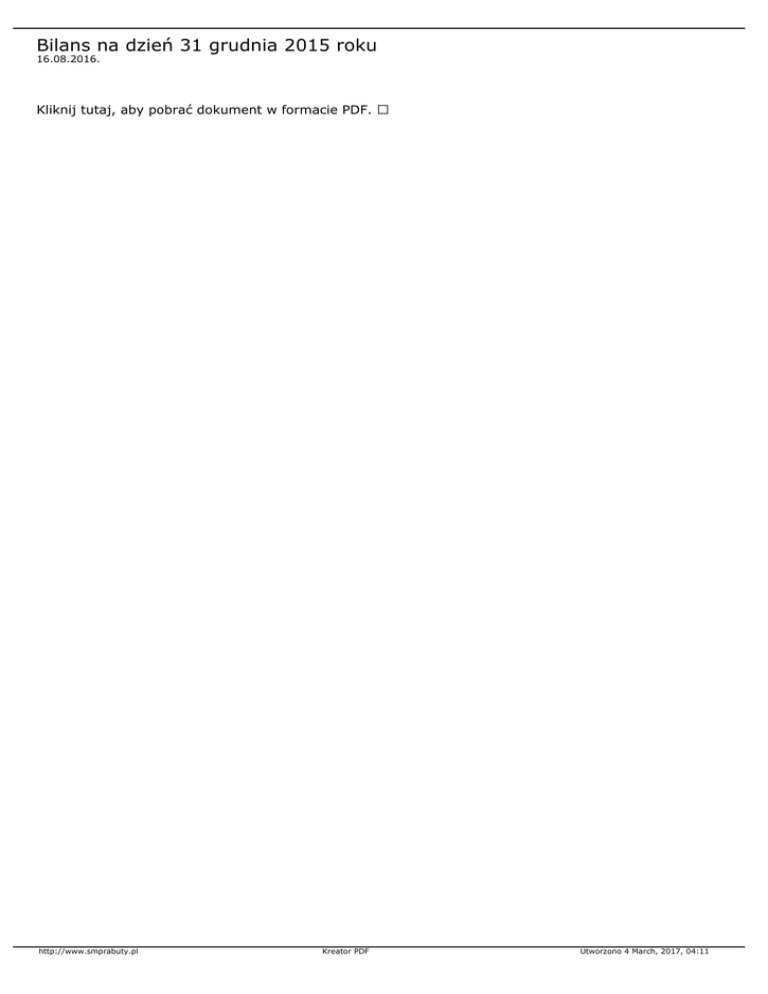 Bilans na dzień 31 grudnia 2015 roku 16.08.2016. Kliknij tutaj, aby pobrać dokument w formacie PDF. http://www.smprabuty.pl Kreator PDF Utworzono 4 March, 2017, 04:11