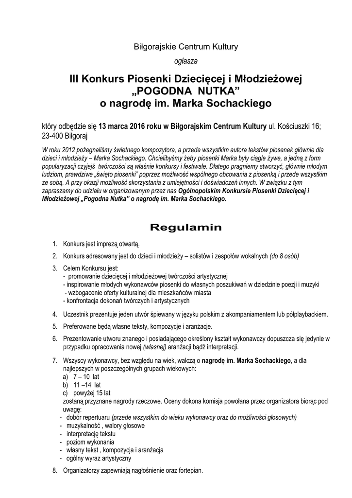 Biłgorajskie Centrum Kultury ogłasza III Konkurs Piosenki Dziecięcej i Młodzieżowej „POGODNA NUTKA” o nagrodę im. Marka Sochackiego który odbędzie się 13 marca 2016 roku w Biłgorajskim Centrum Kultury ul. Kościuszki 16; 23-400 Biłgoraj W roku 2012 pożegnaliśmy świetnego kompozytora, a przede wszystkim autora tekstów piosenek głównie dla dzieci i młodzieży – Marka Sochackiego. Chcielibyśmy żeby piosenki Marka były ciągle żywe, a jedną z form popularyzacji czyjejś twórczości są właśnie konkursy i festiwale. Dlatego pragniemy stworzyć, głównie młodym ludziom, prawdziwe „święto piosenki” poprzez możliwość wspólnego obcowania z piosenką i przede wszystkim ze sobą. A przy okazji możliwość skorzystania z umiejętności i doświadczeń innych. W związku z tym zapraszamy do udziału w organizowanym przez nas Ogólnopolskim Konkursie Piosenki Dziecięcej i Młodzieżowej „Pogodna Nutka” o nagrodę im. Marka Sochackiego. Regulamin 1. Konkurs jest imprezą otwartą. 2. Konkurs adresowany jest do dzieci i młodzieży – solistów i zespołów wokalnych (do 8 osób) 3. Celem Konkursu jest: - promowanie dziecięcej i młodzieżowej twórczości artystycznej - inspirowanie młodych wykonawców piosenki do własnych poszukiwań w dziedzinie poezji i muzyki - wzbogacenie oferty kulturalnej dla mieszkańców miasta - konfrontacja dokonań twórczych i artystycznych 4. Uczestnik prezentuje jeden utwór śpiewany w języku polskim z akompaniamentem lub półplaybackiem. 5. Preferowane będą własne teksty, kompozycje i aranżacje. 6. Prezentowanie utworu znanego i posiadającego określony kształt wykonawczy dopuszcza się jedynie w przypadku opracowania nowej (własnej) aranżacji bądź interpretacji. 7. Wszyscy wykonawcy, bez względu na wiek, walczą o nagrodę im. Marka Sochackiego, a dla najlepszych w poszczególnych grupach wiekowych: a) 7 – 10 lat b) 11 –14 lat c) powyżej 15 lat zostaną przyznane nagrody rzeczowe. Oceny dokona komisja powołana przez organizatora biorąc pod uwagę: - dobór repertuaru (przede wszystkim do wieku wykonawcy oraz do możliwości głosowych) - muzykalność , walory głosowe - interpretację tekstu - poziom wykonania - własny tekst , kompozycja i aranżacja - ogólny wyraz artystyczny 8. Organizatorzy zapewniają nagłośnienie oraz fortepian. 9. Organizatorzy zastrzegają sobie prawo do wykorzystania nieodpłatnie nagrań audio-video dokonanych podczas przesłuchań. 10. Zgłoszenia (wg załączonej karty) prosimy przesyłać pod adresem: Biłgorajskie Centrum Kultury ul. Kościuszki 16 23-400 Biłgoraj lub drogą elektroniczną – e-mail: [email protected] lub [email protected] do 7 marca 2016 roku. 11. Wykonawcy, instruktorzy, nauczyciele pokrywają częściowe koszty pobytu w wysokości 30 zł od osoby. Wpłat należy dokonywać na konto: Bank PKO BP Nr 16 1020 5385 0000 9902 0004 2341 z dopiskiem – Pogodna Nutka (istnieje możliwość wpłaty akredytacji na miejscu po przyjeździe) W ramach tej kwoty z apewniamy wyżywienie. Natomiast uczestnicy przyjeżdżają na własny koszt, 10. Do ostatecznej interpretacji regulaminu powołani są jedynie organizatorzy. 10. Szczegółowych informacje udzielą w BCK, tel. 84 686-04-15, instruktorzy – Sławomir Niemiec i Paweł Stelmach 11. Biuro Konkursu zaczyna pracę 13 marca od godz. 900, a dojechać trzeba najpóźniej do godz. 1100. ZAPRASZAMY KARTA ZGŁOSZENIA do KONKURSU PIOSENKI DZIECIĘCEJ I MŁODZIEŻOWEJ „POGODNA NUTKA” o nagrodę im. MARKA SOCHACKIEGO - do 7 marca 2016 r. 1. Imię i nazwisko lub nazwa zespołu ................................................................... ............................................................................................................................ 2. Adres do korespondencji , nr telefonu .............................................................. ............................................................................................................................ 3. Kategoria wiekowa ............................................................................................ 4. Szkoła lub instytucja delegująca ....................................................................... ........................................................................................................................... 5. Liczba osób .......................................................... 6. Imię i nazwisko nauczyciela , instruktora , opiekuna .............................................. ................................................................................................................................... 7. Repertuar tytuł , autor tekstu , kompozytor - Uwaga; bez podania autorów piosenki zgłoszenie uważane będzie za nieważne a) (do prezentacji) ...................................................................................................... .............................................................................................................................. b) (rezerwowy)............................................................................................................ .............................................................................................................................. 8. Akompaniament ......................................................................................................... ...................................................................................................................................... 9. Potrzeby techniczne : - liczba mikrofonów .............................. - liczba linii ( 2 możliwe ) .................... ......................................................... miejscowość, data ................................................... podpis nauczyciela , instruktora , opiekuna lub własny KARTA AKREDYTACYJNA UCZESTNIKA Konkursu Piosenki Dziecięcej i Młodzieżowej „POGODNA NU