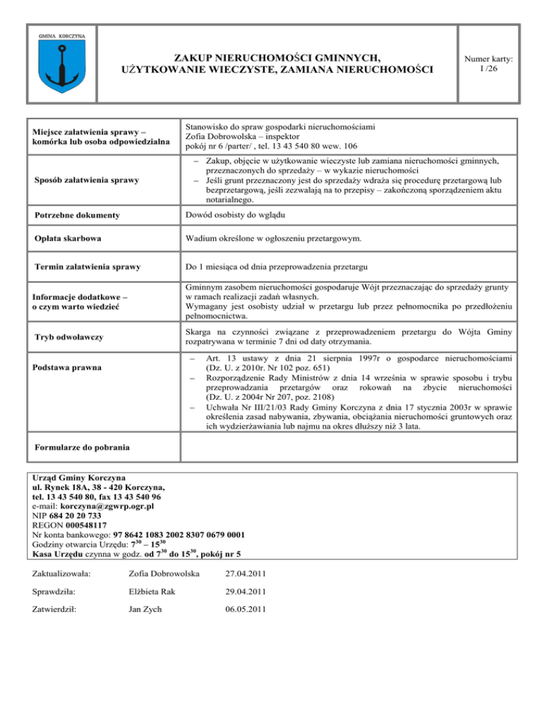 ZAKUP NIERUCHOMOŚCI GMINNYCH, UŻYTKOWANIE WIECZYSTE, ZAMIANA NIERUCHOMOŚCI Miejsce załatwienia sprawy – komórka lub osoba odpowiedzialna Numer karty: I /26 Stanowisko do spraw gospodarki nieruchomościami Zofia Dobrowolska – inspektor pokój nr 6 /parter/ , tel. 13 43 540 80 wew. 106 Zakup, objęcie w użytkowanie wieczyste lub zamiana nieruchomości gminnych, przeznaczonych do sprzedaży – w wykazie nieruchomości Jeśli grunt przeznaczony jest do sprzedaży wdraża się procedurę przetargową lub bezprzetargową, jeśli zezwalają na to przepisy – zakończoną sporządzeniem aktu notarialnego. Sposób załatwienia sprawy Potrzebne dokumenty Dowód osobisty do wglądu Opłata skarbowa Wadium określone w ogłoszeniu przetargowym. Termin załatwienia sprawy Do 1 miesiąca od dnia przeprowadzenia przetargu Informacje dodatkowe – o czym warto wiedzieć Gminnym zasobem nieruchomości gospodaruje Wójt przeznaczając do sprzedaży grunty w ramach realizacji zadań własnych. Wymagany jest osobisty udział w przetargu lub przez pełnomocnika po przedłożeniu pełnomocnictwa. Tryb odwoławczy Skarga na czynności związane z przeprowadzeniem przetargu do Wójta Gminy rozpatrywana w terminie 7 dni od daty otrzymania. Art. 13 ustawy z dnia 21 sierpnia 1997r o gospodarce nieruchomościami (Dz. U. z 2010r. Nr 102 poz. 651) Rozporządzenie Rady Ministrów z dnia 14 września w sprawie sposobu i trybu przeprowadzania przetargów oraz rokowań na zbycie nieruchomości (Dz. U. z 2004r Nr 207, poz. 2108) Uchwała Nr III/21/03 Rady Gminy Korczyna z dnia 17 stycznia 2003r w sprawie określenia zasad nabywania, zbywania, obciążania nieruchomości gruntowych oraz ich wydzierżawiania lub najmu na okres dłuższy niż 3 lata. Podstawa prawna Formularze do pobrania Urząd Gminy Korczyna ul. Rynek 18A, 38 - 420 Korczyna, tel. 13 43 540 80, fax 13 43 540 96 e-mail: [email protected] NIP 684 20 20 733 REGON 000548117 Nr konta bankowego: 97 8642 1083 2002 8307 0679 0001 Godziny otwarcia Urzędu: 730 – 1530 Kasa Urzędu czynna w godz. od 730 do 1530, pokój nr 5 Zaktualizowała: Zofia Dobrowolska 27.04.2011 Sprawdziła: Elżbieta Rak 29.04.2011 Zatwierdził: Jan Zych 06.05.2011