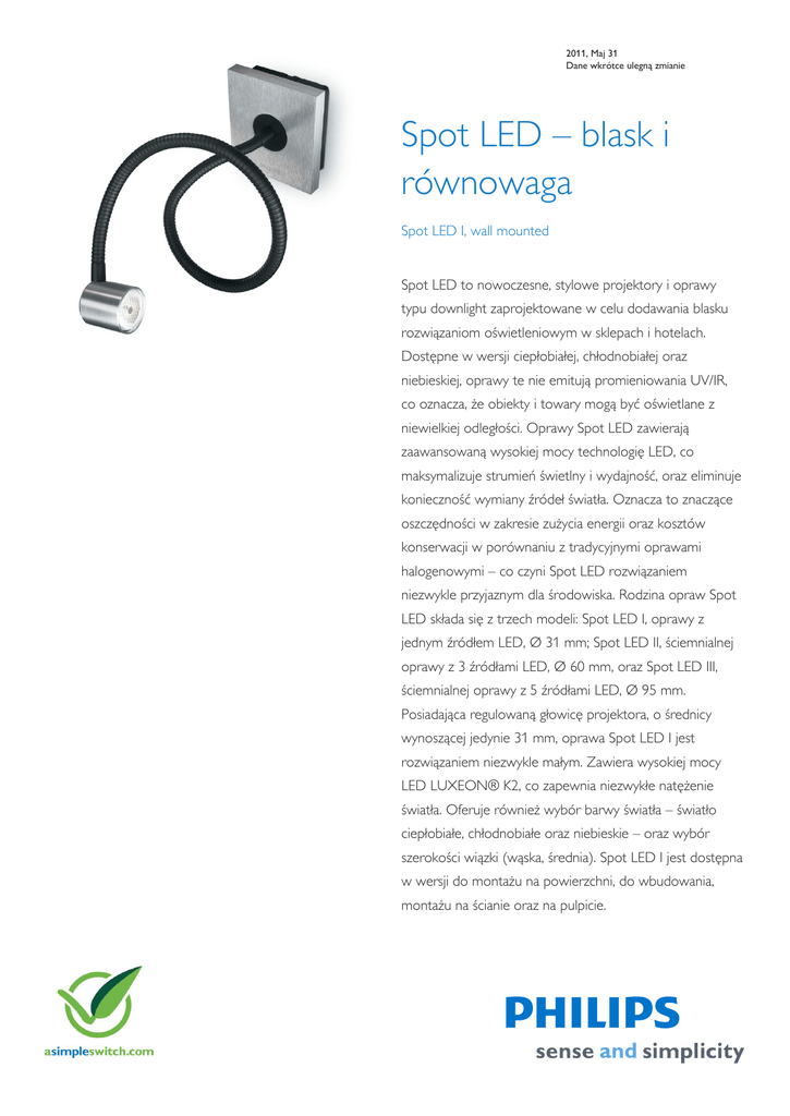 2011, Maj 31 Dane wkrótce ulegną zmianie Spot LED – blask i równowaga Spot LED I, wall mounted Spot LED to nowoczesne, stylowe projektory i oprawy typu downlight zaprojektowane w celu dodawania blasku rozwiązaniom oświetleniowym w sklepach i hotelach. Dostępne w wersji ciepłobiałej, chłodnobiałej oraz niebieskiej, oprawy te nie emitują promieniowania UV/IR, co oznacza, że obiekty i towary mogą być oświetlane z niewielkiej odległości. Oprawy Spot LED zawierają zaawansowaną wysokiej mocy technologię LED, co maksymalizuje strumień świetlny i wydajność, oraz eliminuje konieczność wymiany źródeł światła. Oznacza to znaczące oszczędności w zakresie zużycia energii oraz kosztów konserwacji w porównaniu z tradycyjnymi oprawami halogenowymi – co czyni Spot LED rozwiązaniem niezwykle przyjaznym dla środowiska. Rodzina opraw Spot LED składa się z trzech modeli: Spot LED I, oprawy z jednym źródłem LED, Ø 31 mm; Spot LED II, ściemnialnej oprawy z 3 źródłami LED, Ø 60 mm, oraz Spot LED III, ściemnialnej oprawy z 5 źródłami LED, Ø 95 mm. Posiadająca regulowaną głowicę projektora, o średnicy wynoszącej jedynie 31 mm, oprawa Spot LED I jest rozwiązaniem niezwykle małym. Zawiera wysokiej mocy LED LUXEON® K2, co zapewnia niezwykłe natężenie światła. Oferuje również wybór barwy światła – światło ciepłobiałe, chłodnobiałe oraz niebieskie – oraz wybór szerokości wiązki (wąska, średnia). Spot LED I jest dostępna w wersji do montażu na powierzchni, do wbudowania, montażu na ścianie oraz na pulpicie. Spot LED I, wall mounted 2 Korzyści • Prawdziwa rewolucja w oświetleniu akcentującym – zaskakująco mała oprawa, tylko 31 mm, z regulowaną głowicą projektora • Więcej światła niż kiedykolwiek wcześniej dzięki źródłom LED wysokiej mocy LUXEON® • Brak promieniowania UV lub IR, oprawy świetnie nadają się do oświetlenia delikatnych artykułów lub eksponatów muzealnych Specyfikacje • Typ BWG401 • Źródło światła 1 x LUXEON® K2 • Barwa światła Ciepła biel, zimna biel • Zasilanie 220 - 240 V / 50 - 60 Hz • Zużycie energii 4W • Optyka Wiązka średnia (25°) • Trwałość 50 000 godzin (spadek strumienia świetlnego o max 30% przy Ta= 25°C) • Materiał Obudowa: aluminium polerowane i poliwęglan Optyka: poliwęglan Płytka montażowa: aluminium polerowane i poliwęglan • Uwagi Wraz ze zintegrowanym zasilaczem • Zastosowania główne Sklepy, hotele Produkty powiązane Spot LED BWG401 wersja projektorowa, zawierająca jedną diodę LED, montowana na ścianie oprawa ze zintegrowanym zasilaczem i optyką 10° lub 25° Rysunki techniczne BWG400 2011, Maj 31 Dane wkrótce ulegną zmianie Spot LED I, wall mounted 3 Więcej o produkcie Spot LED wersja montowana na Spot LED wersja montowana na blacie powierzchni Spot LED wersja montowana na ścianie Porównaj tabeli Kod zamó- Rodzina wienia produktów Ilość źródeł światła Kod rodziny źródła światła Barwa światła lampy Kolor Napięcie Kod IP Klasa ochrony Test 850 °C Oznaczenie CE Temperatura barwowa 888870 99 BWG401 1 LED-HB WW BK 220-240 IP20 CLII 850/5 CE 2700 888887 99 BWG401 1 LED-HB WW GR 220-240 IP20 CLII 850/5 CE 2700 © 2011 Koninklijke Philips Electronics N.V. Wszelkie prawa zastrzeżone Dane mogą ulec zmianie bez uprzedniego powiadomienia. Znak towarowy jest własnością Koninklijke Philips Electronics N.V. lub odpowiednich podmiotów . www.philips.com/lighting 2011, Maj 31 Dane wkrótce ulegną zmianie