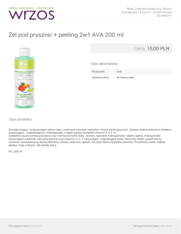 Sklep Zielarsko-Medyczny "Wrzos" Ul.Kolejowa 13 box 51, 10-284 Olsztyn 501490417 Żel pod prysznic + peeling 2w1 AVA 200 ml Cena: 15,00 PLN Opis słownikowy Producent AVA Zastosowanie do mycia ciała Opis produktu Emulsja myjąca i oczyszczająca skórę ciała z martwych komórek naskórka i innych zanieczyszczeń. Zawiera drobne kuleczki o działaniu złuszczająco - wygładzającym, mikrokapsułki z olejem jojoba, kompleks witamin A, E, F, H. Dokładnie usuwa zanieczyszczenia oraz martwe komórki skóry. Zawiera naturalne mikrogranulki z olejem jojoba, mikrogranulki złuszczające naskórek, naturalną betainę oraz witaminy A, E, F odżywiające i regenerujące skórę. Naturalny olejek grapefruitowy orzeźwia i pozostawia na skórze delikatny, świeży, owocowy zapach. Żel optymalnie wygładza naskórek. Pozostawia skórę miękką, gładką i miłą w dotyku. Dla każdej skóry. Poj. 200 ml Plik wygenerowano: 04-03-2017 Powered by TCPDF (www.tcpdf.org) Oprogramowanie sklepu: AptusShop