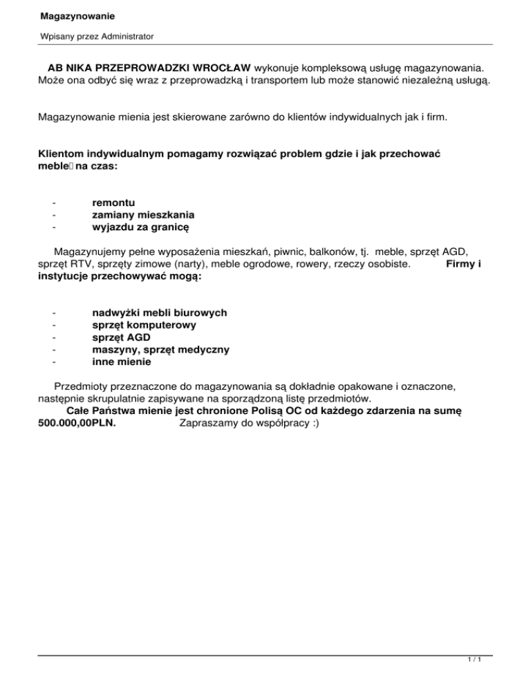 Magazynowanie Wpisany przez Administrator AB NIKA PRZEPROWADZKI WROCŁAW wykonuje kompleksową usługę magazynowania. Może ona odbyć się wraz z przeprowadzką i transportem lub może stanowić niezależną usługą. Magazynowanie mienia jest skierowane zarówno do klientów indywidualnych jak i firm. Klientom indywidualnym pomagamy rozwiązać problem gdzie i jak przechować meble na czas: - remontu zamiany mieszkania wyjazdu za granicę Magazynujemy pełne wyposażenia mieszkań, piwnic, balkonów, tj. meble, sprzęt AGD, sprzęt RTV, sprzęty zimowe (narty), meble ogrodowe, rowery, rzeczy osobiste. Firmy i instytucje przechowywać mogą: - nadwyżki mebli biurowych sprzęt komputerowy sprzęt AGD maszyny, sprzęt medyczny inne mienie Przedmioty przeznaczone do magazynowania są dokładnie opakowane i oznaczone, następnie skrupulatnie zapisywane na sporządzoną listę przedmiotów. Całe Państwa mienie jest chronione Polisą OC od każdego zdarzenia na sumę 500.000,00PLN. Zapraszamy do współpracy :) 1/1