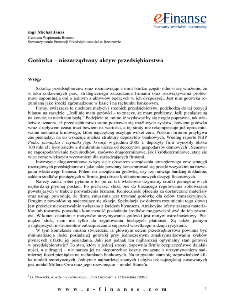 mgr Michał Janas Centrum Wspierania Biznesu Stowarzyszenie Promocji Przedsiębiorczości w Rzeszowie Gotówka – niezarządzany aktyw przedsiębiorstwa Wstęp Szkoląc przedsiębiorców oraz rozmawiając z nimi bardzo często odnosi się wrażenie, że w toku codziennych prac, strategicznego zarządzania firmami oraz rozwiązywania problemów zapominają oni o jednym z aktywów będących w ich dyspozycji. Jest nim gotówka rozumiana jako środki zgromadzone w kasie i na rachunku bankowym. Firmy, zwłaszcza te z sektora małych i średnich przedsiębiorstw, podchodzą do tej pozycji bilansu na zasadzie: „Jeśli nie mam gotówki – to znaczy, że mam problemy. Jeśli pieniądze są na koncie, to niech tam będą.” Podejście to, mimo iż wydawać by się mogło poprawne, tak właściwie oznacza, iż przedsiębiorstwo samo pozbawia się możliwych zysków, bowiem gotówka wraz z upływem czasu traci bowiem na wartości, a tej straty nie rekompensuje już oprocentowanie rachunku firmowego, które najczęściej oscyluje wokół zera. Polskim firmom przybywa zaś pieniędzy, na co wskazuje analiza struktury depozytów bankowych. Według raportu NBP Podaż pieniądza i czynniki jego kreacji w grudniu 2005 r. depozyty firm wynosiły blisko 100 mln zł i były zaledwie dwukrotnie niższe od depozytów gospodarstw domowych1. Sensowne zagospodarowanie tych środków, zarówno długoterminowe, jak i krótkoterminowe, staje się więc coraz większym wyzwaniem dla zarządzających firmami. Inwestycje długoterminowe wiążą się z obszarem zarządzania strategicznego oraz strategii rozwojowych przedsiębiorstw i jako takie powinny koncentrować się przede wszystkim na rozwijaniu właściwego biznesu. Polem do zarządzania gotówką, czy też mówiąc bardziej dokładnie, saldem środków pieniężnych w firmie, jest obszar krótkoterminowych decyzji finansowych. Należy zadać sobie pytanie o to, po co tak właściwie trzymamy środki pieniężne w ich najbardziej płynnej postaci. Po pierwsze, służą one do bieżącego regulowania zobowiązań powstających w trakcie prowadzenia biznesu. Konieczność płacenia za dostarczone materiały oraz usługi powoduje, że firma zmuszona jest trzymać gotówkę dla celów transakcyjnych. Drugim z powodów są nadarzające się okazje. Spekulacja (w dobrym rozumieniu tego słowa) jest przecież nierozerwalnie związana z każdym biznesem. Atrakcyjne oferty zakupu materiałów lub towarów powodują konieczność posiadania środków mogących służyć do ich zawarcia. W końcu ostatnim z motywów utrzymywania gotówki jest motyw ostrożnościowy. Pieniądze służą nam nie tylko do regulowania bieżących płatności. Są także jednym z najlepszych instrumentów zabezpieczania się przed wszelkiego rodzaju ryzykami. W tym kontekście można stwierdzić, iż głównym celem przedsiębiorstwa powinna być minimalizacja ilości posiadanej gotówki przy jednoczesnym zmaksymalizowaniu zysków płynących z faktu jej posiadania. Jaki jest jednak ten najbardziej optymalny stan gotówki w przedsiębiorstwie? To stan, który z jednej strony, zapewnia firmie bezpieczeństwo działalności, a z drugiej – nie naraża jej na niepotrzebne koszty związane z utrzymywaniem nadmiernej ilości pieniądza na rachunkach bankowych. Na to pytanie stara się odpowiedzieć kilka modeli teoretycznych. Jednym z najbardziej znanych i chyba też najczęściej stosowanych jest model Millera-Orra oraz jego rozwinięcie – model Stone’a. 1 G. Nawacki, Koszty nie odstraszają, „Puls Biznesu” z 12 kwietnia 2006 r. w w w . e - f i n a n s e . c o m 1 Model Millera-Orra, czyli jak optymalizować zasoby gotówki Model ten został po raz pierwszy opisany w artykule A Model of the Demand for Money by Firms2. W odróżnieniu od wcześniejszych rozwiązań zakładał on, że kadra zarządzająca w firmach nie jest w stanie przewidywać codziennych zmian gotówki oraz nie ma na nie żadnego wpływu, zatem prawdopodobieństwo wpływu lub odpływu gotówki jest równe 0,5. Autorzy stwierdzili również, że w firmie istnieją zaledwie dwa rodzaje aktywów: gotówka oraz krótkoterminowe papiery wartościowe, które na dodatek są doskonale podzielne oraz płynne. Oznacza to, że transfery mogą być dokonywane wyłącznie pomiędzy tymi instrumentami i odbywają się w tak krótkim okresie czasu, że nie ma potrzeby trzymania gotówki z uwagi na czas dokonywania transferów. Transfer taki (gotówka – papiery wartościowe lub papiery wartościowe – gotówka) jednak kosztuje, przy czym, jak twierdzą M.H. Miller i D. Orr, koszt tej operacji jest stały i niezależny od jej wielkości oraz czasu jaki upłynął od poprzedniej transakcji. Ostateczna wielkość gotówki zależy zatem, według tych autorów, od wspomnianego już kosztu transferu, a także trzech innych czynników, a mianowicie: • kosztu alternatywnego utrzymywania gotówki w przedsiębiorstwie, • wariancji przepływów pieniężnych, obliczonej dla pewnego okresu z przeszłości, • ustalonego dolnego limitu gotówki. Koszt alternatywny utrzymywania gotówki to nic innego jak oprocentowanie krótkoterminowych papierów wartościowych pomniejszone o oprocentowanie rachunku bieżącego. Jest to zatem skala potencjalnie utraconych dochodów pieniężnych z tytułu utrzymywania gotówki na rachunku bankowym i nieinwestowania jej w bardziej dochodowe instrumenty. Z kolei wariancja przepływów pieniężnych, jako miara niepewności, określa poziom wahań salda gotówki. Parametr ten jest obliczany dla pewnego okresu z przeszłości. Podstawą jego wyznaczenia jest saldo netto przepływów pieniężnych, czyli różnica pomiędzy wpływami a wypływami. Wariancja jest obliczana najczęściej w oparciu o dzienne salda netto. Limit dolny (lower limit – LL) jest saldem gotówki określającym najniższy jej poziom, po przekroczeniu którego występuje wysokie niebezpieczeństwo utraty płynności3. Jego wielkość 