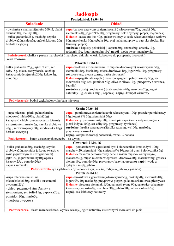 Jadłospis Poniedziałek 18.04.16 Śniadanie Obiad zupa-barszcz czerwony z ziemniakami ( włoszczyzna75g, buraki 60g, ziemniaki 60g, jogurt 9% 10g, przyprawy: sok z cytryny, pieprz, majeranek) II danie- kasza kus kus 40g, gulasz wołowy w sosie własnym (mięso wołowe 80g, marchewka 10g, cebula 10g, olej natka przyprawy: papryka słodka, lisć laurowy, pieprz) surówka-z kapusty pekińskiej ( kapusta50g, ananas30g, orzechy10g, rodzynki10g, jogurt naturalny10g) napój- woda owoc- mandarynka Podwieczorek-chałka z pastą z marchewki ( marchew, daktyle, wiórki kokosowe do posypania, twarożek ) kawa zbożowa - owsianka z malinami(mleko 200ml, platki owsiane30g, maliny 10g) -bułka grahamka35g, masło5g, szynka drobiowa20g, sałata5g, ogórek kiszony 20g herbata z cytryną Wtorek 19.04.16 bułka grahamka 25g, jajko1/2 szt , ser żółty15g, sałata, szczypiorek, ketchup kakao z miodem(mleko200g, kakao 3g, miód 5g) zupa-fasolowa z ziemniakami i z mięsem drobiowym( włoszczyzna 50g, ziemniaki 50g, fasola40g, mięso drobiowe 40g, jogurt 9% 10g, przyprawy: sok z cytryny, pieprz czarny, natka pietruszki) II danie-spagetti ala napoli ( makaron spaghetti pełnoziarnisty 50g, ser mozzarella 40g, sos- pomidor 50g, oliwa z oliwek10g, przyprawy : czosnek, bazylia) surówka z białej rzodkiewki ( biała rzodkiew40g, marchew20g, jogurt naturalny10g, cukinia 40g, , koperek) napój –kompot wisniowy Podwieczorek- budyń czekoladowy, herbata miętowa Środa 20.04.16 - zupa mleczna- płatki pełnoziarniste miodowe( mleko200g, płatki20g) kanapka-( chleb pszenno-żytni Danuty z siemieniem masło 5g, szynka drobiowa 20g, , ser twarogowy 50g, rzodkiewka 10g) herbata z cytryną zupa-–pomidorowa z ziemniakami( włoszczyzna 100g, przecier pomidorowy 15g, jogurt 9% 20g, ziemniaki 50g) II danie- ryż pełnoziarnisty 50g, eskalopki zapiekane z indyka ( mięso z piersi indyka 100g, ser żółty10g, przyprawy: tymianek) surówka- fasolka szparagowa(fasolka szparagowa100g, masło3g, przyprawy: czosnek) napój- kompot z czarnej porzeczki, owoc- ½ banana Podwieczorek- baton z suszonych owoców- na wynos Czwartek 21.04.16 -bułka grahamka50g, masło5g, szynka zupa – pomarańczowa z pestkami dyni i słonecznika( krem z dyni 100g, drobiowa20g,,pomidor jajko na twardo w marchew 20, ziemniaki 40g, smietana9% 10g,pestki dyni i słonecznika 7g) sosie jogurtowym ze szczypiorkiem( II danie- makaron pełnoziarnisty pene z sosem mięsno- warzywnym( jajko1/2, jogurt naturalny10g,ogórek makaron50g, mięso mielone wieprzowo- drobiowe70g, marchew30g, groszek kiszony 25g , pomidor20g) zielony10g, pomidor50g, przyprawy: bazylia, oregano) napój- woda z napar z rumianku cytryna i miętą, jabłko Podwieczorek- ryż z jabłkami i cynamonem( ryż, mleko, rodzynki, jabłko, cynamon) Piątek 22.04.16 -zupa mleczna- muslii na mleku(mleko150g, muslii z suszonymi owocami 25g) - chleb pszenno-żytni Danuty z siemieniem, ser żółty15g, papryka20g, pomidor 20g, maslo5g – herbata owocowa zupa- brokułowa z grzankami(włoszczyzna50g, brokuły70g, ziemniaki10g, jogurt 9% 10g masło 5g, przyprawy: pieprz, gałka muszkatołowa, pieczywo) II danie- pieczone ziemniaki150g, paluszki rybne 90g, surówka- z kapusty kwaszonej(kapusta60g, marchew 30g, jabłko 20g, oliwa z oliwek5g) napój- sok jabłkowy naturalny Podwieczorek- ciasto marchewkowe- wypiek własny, jogurt naturalny z suszonymi morelami do picia Jadłospis Poniedziałek 25.04.16 Śniadanie Obiad - chleb razowy ze słonecznikiem50g, jajecznica na parze50g, szczypiorek, sałatka( sałat5g, papryka żółta20g,papryka czerwona 20g, pomidor 20g, jogurt naturalny20g, przyprawy: oregano, bazylia) -kawa zbożowa( mleko 200g, kawa zbożowa 3g) zupa- ziemniaczana ( włoszczyzna 80g, ziemniaki 80g, jogurt 9% 10g, natka pietruszki 5g, przyprawy: kminek, lubczyk, pieprz) II danie- risotto z mięsem wołowym ( ryz pełnoziarnisty 50g, mięsom wołowe 60g, fasola czerwona 30g, kukurydz 15g, pomidor20g, olej, cebula czerwona 10g, czosnek 2g, przyprawy: zioła prowansalskie) surówka z cykorii( cykoria 40g, jabłko 60g, jogurt naturalny 10g, pomarańcze 50g) napój- woda z pomarańczą i miętą owoc- jabłko Podwieczorek-bulka razowa z serem żółtym, kakao Wtorek 26.04.16 - zupa mleczna- kulki pełnoziarniste miodowe( mleko 200g, kulki 30g) - kanapka –chleb razowy ze słonecznikiem, krakowska drobiowa20g, pomidor20g, papryka20g, sałata5g, masło 5g) - herbata z miodem zupa- koperkowa( włoszczyzna85g, ziemniak 50g, jogurt 9%10g, koper 35,masło 5g, przyprawy: pieprz) II danie- ziemniaki 150g,kotleciki drobiowe panierowane w otrębach( mięso z piersi indyka 80g, bulka 15g, jajko 10g, cebula2g, otręby pszenne 2g, przyprawy: pieprz, tymianek, olej rzepakowy 5g, surówka z kapusty białej (kapusta50g, jabłko40g, marchew 10g, jogurt naturalny10g, szczypiorek, przyprawy: sok z cytryny, pieprz) napój- sok wieloowocowy naturalny Podwieczorek- kasza jaglana z owocami,( kasza, mleko, maliny, gruszka, rodzynki, maslo, cynamon) herbata z cytryną Środa 27.04.16 -kanapka –chleb razowy ze słonecznikiem50g, szynka wieprzowa15g, ser żółty15g, sałata 5g, sałatka jarzynowa( marchew20g, pietruszka20g, ziemniaki20g, jablko20g, groszek zielony10g, seler20g, ogórek kiszony20g ,1/2 jajka, jogurt naturalny20g) - kawa zbożowa( mleko 200g, kawa zbożowa 3g) zupa – flaczki z drobiu(włoszczyzna100g, kurczak50g, natka pietruszki 3g, przyprawy: lubczyk, imbir, majeranek, pieprz) II danie- kopytka z sosem pieczarkowym( ziemniaki100g, jajko10g, mąka pszenna 40g,) sos pieczarkowy( pieczarki 35g, mleko3,2% 20g, jogurt 9% 20g, masło5g, przyprawy: pieprz czarny)surówka- z kapusty białej( kapusta biała60g, marchew 30g, jabłko20g, olej słonecznikowy5g, przyprawy: sok z cytryny, pieprz, natka pietruszki) napój- herbata owocowa, owoc- jabłko Podwieczorek- ciasto drożdżowe- wypiek własny - na wynos Czwartek 28.04.16 -zupa mleczna- muslii naturalne z owocami suszonymi( mleko200g, muslii 25g) -chleb razowy