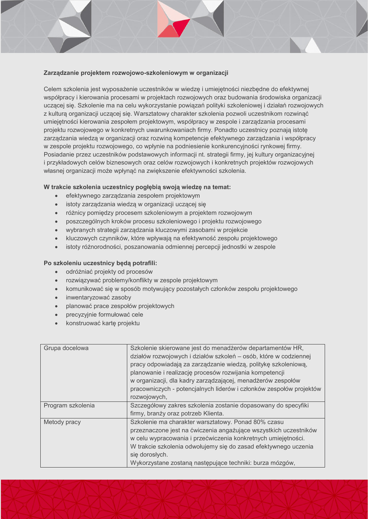 Zarządzanie projektem rozwojowo-szkoleniowym w organizacji Celem szkolenia jest wyposażenie uczestników w wiedzę i umiejętności niezbędne do efektywnej współpracy i kierowania procesami w projektach rozwojowych oraz budowania środowiska organizacji uczącej się. Szkolenie ma na celu wykorzystanie powiązań polityki szkoleniowej i działań rozwojowych z kulturą organizacji uczącej się. Warsztatowy charakter szkolenia pozwoli uczestnikom rozwinąć umiejętności kierowania zespołem projektowym, współpracy w zespole i zarządzania procesami projektu rozwojowego w konkretnych uwarunkowaniach firmy. Ponadto uczestnicy poznają istotę zarządzania wiedzą w organizacji oraz rozwiną kompetencje efektywnego zarządzania i współpracy w zespole projektu rozwojowego, co wpłynie na podniesienie konkurencyjności rynkowej firmy. Posiadanie przez uczestników podstawowych informacji nt. strategii firmy, jej kultury organizacyjnej i przykładowych celów biznesowych oraz celów rozwojowych i konkretnych projektów rozwojowych własnej organizacji może wpłynąć na zwiększenie efektywności szkolenia. W trakcie szkolenia uczestnicy pogłębią swoją wiedzę na temat: efektywnego zarządzania zespołem projektowym istoty zarządzania wiedzą w organizacji uczącej się różnicy pomiędzy procesem szkoleniowym a projektem rozwojowym poszczególnych kroków procesu szkoleniowego i projektu rozwojowego wybranych strategii zarządzania kluczowymi zasobami w projekcie kluczowych czynników, które wpływają na efektywność zespołu projektowego istoty różnorodności, poszanowania odmiennej percepcji jednostki w zespole Po szkoleniu uczestnicy będą potrafili: odróżniać projekty od procesów rozwiązywać problemy/konflikty w zespole projektowym komunikować się w sposób motywujący pozostałych członków zespołu projektowego inwentaryzować zasoby planować prace zespołów projektowych precyzyjnie formułować cele konstruować kartę projektu Grupa docelowa Program szkolenia Metody pracy Szkolenie skierowane jest do menadżerów departamentów HR, działów rozwojowych i działów szkoleń – osób, które w codziennej pracy odpowiadają za zarządzanie wiedzą, politykę szkoleniową, planowanie i realizację procesów rozwijania kompetencji w organizacji, dla kadry zarządzającej, menadżerów zespołów pracowniczych - potencjalnych liderów i członków zespołów projektów rozwojowych, Szczegółowy zakres szkolenia zostanie dopasowany do specyfiki firmy, branży oraz potrzeb Klienta. Szkolenie ma charakter warsztatowy. Ponad 80% czasu przeznaczone jest na ćwiczenia angażujące wszystkich uczestników w celu wypracowania i przećwiczenia konkretnych umiejętności. W trakcie szkolenia odwołujemy się do zasad efektywnego uczenia się dorosłych. Wykorzystane zostaną następujące techniki: burza mózgów, Charakter szkolenia Czas trwania Materiały szkoleniowe Miejsce realizacji szkolenia Raport poszkoleniowy Wsparcie szkoleniowe ćwiczenia indywidualne i grupowe, testy, gry symulacyjne, analizy casestudy, psychodrama. Otwarte lub wewnętrzne realizowane w grupie od 4-16 osób lub według indywidualnych ustaleń. Od 2 do 6 dni. Każdy z modułów szkoleniowych trwa 45 minut. Szkolenie odbywa się w godzinach 9-17 lub w uzgodnionych indywidualnie z Klientem. Materiały szkoleniowe są uzupełnieniem do materiału omawianego w trakcie szkolenia. Uczestnicy otrzymują je w formie drukowanej. W siedzibie Klienta lub w miejscu przez niego wskazanym. Po realizacji szkolenia przygotowywany jest raport zawierający podsumowanie szkolenia, najważniejsze wnioski, rekomendacje dotyczące działań na przyszłość. W ciągi jednego miesiąca po szkoleniu służymy wsparciem. Zapraszamy do kontaktu, zadawania pytania odnośnie zagadnień realizowanych na szkoleniu. Wyślij zapytanie, a przedstawimy Ci szkolenie dostosowane do specyfiki i potrzeb Twojej firmy! Zapraszamy do kontaktu, tel. 22/ 839 55 99 wew. 225 MCS sp. z o.o. sp. k., ul. Czerska 14, 00-732 Warszawa [email protected], www.mcs.edu.pl