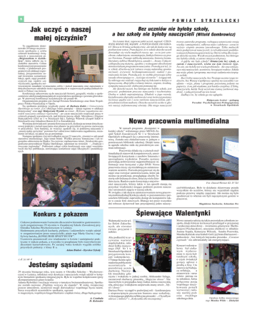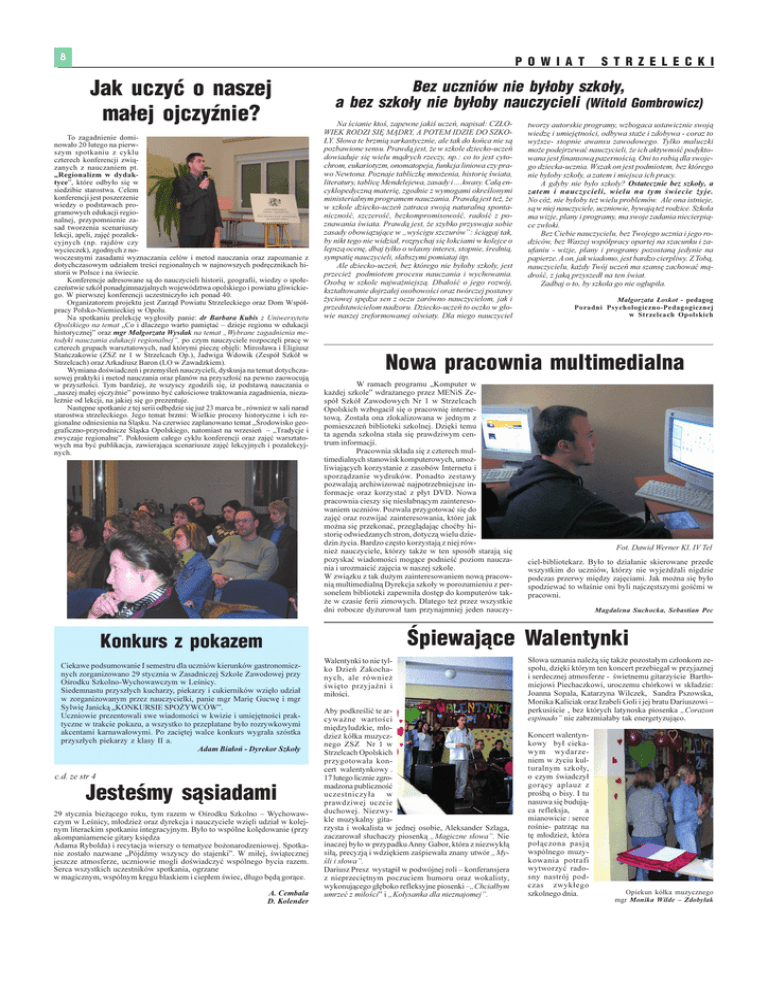 8 P O W I A T Jak uczyæ o naszej ma³ej ojczynie? To zagadnienie dominowa³o 20 lutego na pierwszym spotkaniu z cyklu czterech konferencji zwi¹zanych z nauczaniem pt. Regionalizm w dydaktyce, które odby³o siê w siedzibie starostwa. Celem konferencji jest poszerzenie wiedzy o podstawach programowych edukacji regionalnej, przypomnienie zasad tworzenia scenariuszy lekcji, apeli, zajêæ pozalekcyjnych (np. rajdów czy wycieczek), zgodnych z nowoczesnymi zasadami wyznaczania celów i metod nauczania oraz zapoznanie z dotychczasowym udzia³em treci regionalnych w najnowszych podrêcznikach historii w Polsce i na wiecie. Konferencje adresowane s¹ do nauczycieli historii, geografii, wiedzy o spo³eczeñstwie szkó³ ponadgimnazjalnych województwa opolskiego i powiatu gliwickiego. W pierwszej konferencji uczestniczy³o ich ponad 40. Organizatorem projektu jest Zarz¹d Powiatu Strzeleckiego oraz Dom Wspó³pracy Polsko-Niemieckiej w Opolu. Na spotkaniu prelekcjê wyg³osi³y panie: dr Barbara Kubis z Uniwersytetu Opolskiego na temat Co i dlaczego warto pamiêtaæ dzieje regionu w edukacji historycznej oraz mgr Ma³gorzata Wysdak na temat Wybrane zagadnienia metodyki nauczania edukacji regionalnej, po czym nauczyciele rozpoczêli pracê w czterech grupach warsztatowych, nad którymi pieczê objêli: Miros³awa i Eligiusz Stañczakowie (ZSZ nr 1 w Strzelcach Op.), Jadwiga Wdowik (Zespó³ Szkó³ w Strzelcach) oraz Arkadiusz Baron (LO w Zawadzkiem). Wymiana dowiadczeñ i przemyleñ nauczycieli, dyskusja na temat dotychczasowej praktyki i metod nauczania oraz planów na przysz³oæ na pewno zaowocuj¹ w przysz³oci. Tym bardziej, ¿e wszyscy zgodzili siê, i¿ podstaw¹ nauczania o naszej ma³ej ojczynie powinno byæ ca³ociowe traktowania zagadnienia, niezale¿nie od lekcji, na jakiej siê go prezentuje. Nastêpne spotkanie z tej serii odbêdzie siê ju¿ 23 marca br., równie¿ w sali narad starostwa strzeleckiego. Jego temat brzmi: Wielkie procesy historyczne i ich regionalne odniesienia na l¹sku. Na czerwiec zaplanowano temat rodowisko geograficzno-przyrodnicze l¹ska Opolskiego, natomiast na wrzesieñ Tradycje i zwyczaje regionalne. Pok³osiem ca³ego cyklu konferencji oraz zajêæ warsztatowych ma byæ publikacja, zawieraj¹ca scenariusze zajêæ lekcyjnych i pozalekcyjnych. S T R Z E L E C K I Bez uczniów nie by³oby szko³y, a bez szko³y nie by³oby nauczycieli (Witold Gombrowicz) Na cianie kto, zapewne jaki uczeñ, napisa³: CZ£OWIEK RODZI SIÊ M¥DRY, A POTEM IDZIE DO SZKO£Y. S³owa te brzmi¹ sarkastycznie, ale tak do koñca nie s¹ pozbawione sensu. Prawd¹ jest, ¿e w szkole dziecko-uczeñ dowiaduje siê wielu m¹drych rzeczy, np.: co to jest cytochrom, eukariotyzm, onomatopeja, funkcja liniowa czy prawo Newtona. Poznaje tabliczkê mno¿enia, historiê wiata, literatury, tablicê Mendelejewa, zasady i ....kwasy. Ca³¹ encyklopedyczn¹ materiê, zgodnie z wymogami okrelonymi ministerialnym programem nauczania. Prawd¹ jest te¿, ¿e w szkole dziecko-uczeñ zatraca swoj¹ naturaln¹ spontanicznoæ, szczeroæ, bezkompromisowoæ, radoæ z poznawania wiata. Prawd¹ jest, ¿e szybko przyswaja sobie zasady obowi¹zuj¹ce w wycigu szczurów: ci¹gaj tak, by nikt tego nie widzia³, rozpychaj siê ³okciami w kolejce o lepsz¹ ocenê, dbaj tylko o w³asny interes, stopnie, redni¹, sympatiê nauczycieli, s³abszymi pomiataj itp. Ale dziecko-uczeñ, bez którego nie by³oby szko³y, jest przecie¿ podmiotem procesu nauczania i wychowania. Osob¹ w szkole najwa¿niejsz¹. Dba³oæ o jego rozwój, kszta³towanie dojrza³ej osobowoci oraz twórczej postawy ¿yciowej spêdza sen z oczu zarówno nauczycielom, jak i przedstawicielom nadzoru. Dziecko-uczeñ to oczko w g³owie naszej zreformowanej owiaty. Dla niego nauczyciel tworzy autorskie programy, wzbogaca ustawicznie swoj¹ wiedzê i umiejêtnoci, odbywa sta¿e i zdobywa - coraz to wy¿sze- stopnie awansu zawodowego. Tylko maluczki mo¿e podejrzewaæ nauczycieli, ¿e ich aktywnoæ podyktowana jest finansow¹ pazernoci¹. Oni to robi¹ dla swojego dziecka-ucznia. Wszak on jest podmiotem, bez którego nie by³oby szko³y, a zatem i miejsca ich pracy. A gdyby nie by³o szko³y? Ostatecznie bez szko³y, a zatem i nauczycieli, wielu na tym wiecie ¿yje. No có¿, nie by³oby te¿ wielu problemów. Ale ona istnieje, s¹ w niej nauczyciele, uczniowie, bywaj¹ te¿ rodzice. Szko³a ma wizje, plany i programy, ma swoje zadania niecierpi¹ce zw³oki. Bez Ciebie nauczycielu, bez Twojego ucznia i jego rodziców, bez Waszej wspó³pracy opartej na szacunku i zaufaniu - wizje, plany i programy pozostan¹ jedynie na papierze. A on, jak wiadomo, jest bardzo cierpliwy. Z Tob¹, nauczycielu, ka¿dy Twój uczeñ ma szansê zachowaæ m¹droæ, z jak¹ przyszed³ na ten wiat. Zadbaj o to, by szko³a go nie og³upi³a. Ma³gorzata £oskot - pedagog Poradni Psychologiczno-Pedagogicznej w Strzelcach Opolskich Nowa pracownia multimedialna W ramach programu Komputer w ka¿dej szkole wdra¿anego przez MENiS Zespó³ Szkó³ Zawodowych Nr 1 w Strzelcach Opolskich wzbogaci³ siê o pracowniê internetow¹. Zosta³a ona zlokalizowana w jednym z pomieszczeñ biblioteki szkolnej. Dziêki temu ta agenda szkolna sta³a siê prawdziwym centrum informacji. Pracownia sk³ada siê z czterech multimedialnych stanowisk komputerowych, umo¿liwiaj¹cych korzystanie z zasobów Internetu i sporz¹dzanie wydruków. Ponadto zestawy pozwalaj¹ archiwizowaæ najpotrzebniejsze informacje oraz korzystaæ z p³yt DVD. Nowa pracownia cieszy siê nies³abn¹cym zainteresowaniem uczniów. Pozwala przygotowaæ siê do zajêæ oraz rozwijaæ zainteresowania, które jak mo¿na siê przekonaæ, przegl¹daj¹c choæby historiê odwiedzanych stron, dotycz¹ wielu dziedzin ¿ycia. Bardzo czêsto korzystaj¹ z niej równie¿ nauczyciele, którzy tak¿e w ten sposób staraj¹ siê pozyskaæ wiadomoci mog¹ce podnieæ poziom nauczania i urozmaiciæ zajêcia w naszej szkole. W zwi¹zku z tak du¿ym z