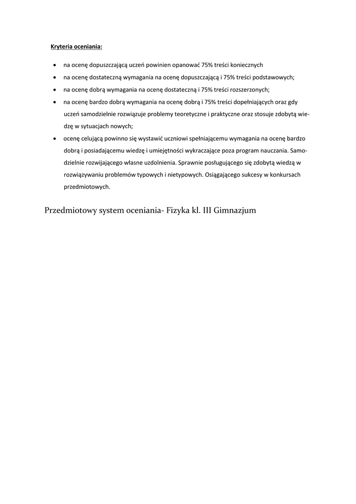 Kryteria oceniania: na ocenę dopuszczającą uczeń powinien opanować 75% treści koniecznych na ocenę dostateczną wymagania na ocenę dopuszczającą i 75% treści podstawowych; na ocenę dobrą wymagania na ocenę dostateczną i 75% treści rozszerzonych; na ocenę bardzo dobrą wymagania na ocenę dobrą i 75% treści dopełniających oraz gdy uczeń samodzielnie rozwiązuje problemy teoretyczne i praktyczne oraz stosuje zdobytą wiedzę w sytuacjach nowych; ocenę celującą powinno się wystawić uczniowi spełniającemu wymagania na ocenę bardzo dobrą i posiadającemu wiedzę i umiejętności wykraczające poza program nauczania. Samodzielnie rozwijającego własne uzdolnienia. Sprawnie posługującego się zdobytą wiedzą w rozwiązywaniu problemów typowych i nietypowych. Osiągającego sukcesy w konkursach przedmiotowych. Przedmiotowy system oceniania- Fizyka kl. III Gimnazjum Liczba godzin Temat lekcji 1 Przykłady ruchów drgających. Podstawowe pojęcia dotyczące ruchu drgającego. Drgania tłumione. Zmiany energii w ruchu drgającym. Ruch harmoniczny. - zna pojęcia: położenie równowagi, wychylenie, amplituda - wie, że drgania mogą być gasnące - potrafi wskazać w otoczeniu ciała drgające - potrafi obliczać okres przy danej częstotliwości - potrafi omówić zmiany szybkości, przyspieszenia i siły w czasie drgań sprężyny - zna i rozumie pojęcia: okres i częstotliwość - zna jednostki okresu i częstotliwości - potrafi obliczyć częstotliwość drgań na podstawie znajomości okresu - wie, że okres drgań zależy od właściwości fizycznych sprężyny - potrafi przedstawić zmiany energii podczas drgań sprężyny - potrafi opisać zmiany prędkości, przyspieszenia i siły w ruchu drgającym sprężyny Demonstracja wahadła matematycznego. Okres wahań wahadła matematycznego. Izochronizm wahań. - wie, jakie wahadło nazywamy matematycznym - wie, że okres wahań wahadła zależy od jego długości - potrafi obliczać okres wahań wahadła z wyrażenia Ruch drgający Dział fizyki Zakres materiału (treść) Wahadło matematyczne Rezonans mechaniczny 1 1 Ruch falowy DRGANIA I FALE MECHANICZNE 1 Drgania własne. Rezonans mechaniczny. Impuls falowy. Promień fali. Fale porzeczne i podłużne. Mechanizm powstawania i rozchodzenia się fali. Szybkość rozchodzenia się fali. Osiągnięcia ucznia konieczne ___________________ podstawowe Uczeń: - wie, że okres wahań wahadła nie zależy od jego masy i dla małych kątów nie zależy od kąta wychylenia - potrafi wskazać w otoczeniu urządzenia, w których znalazły zastosowanie wahadła - wie, co to są drgania własne - wie, że w wyniku rezonansu mechanicznego mogą ulec zniszczeniu różne konstrukcje - wie, co to jest rezonans mechaniczny - potrafi zastosować swoją wiedzę do wyregulowania wahadła w zegarze - wie, co nazywamy impulsem falowym - wie, że fale mogą być poprzeczne i podłużne - wie, jak odróżnić falę poprzeczną od podłużnej - wie, co to jest grzbiet i dolina fali ___________________________ - wie, co nazywamy falą - wie, że fale mechaniczne nie rozchodzą się w próżni - wie, że szybkość rozchodzenia się fal jest w danym ośrodku stała - wie, co to jest okres, częstotliwość i długość fali Osiągnięcia ucznia rozszerzone ________________ dopełniające Uczeń: T 2 l g Procedury osiągania celów _________________ Środki dydaktyczne pokaz, doświadczenia w grupach, pogadanka, praca w grupach kulki metalowe i drewniane o różnych masach, nici, sprężyny o różnych przekrojach z drutu o różnej grubości, podręcznik doświadczenia uczniowskie, rozmowa dydaktyczna, praca w grupach kulki metalowe i drewniane, nici, stopery, podręcznik, zeszyt ćwiczeń - wie, co to jest izochronizm wahań - potrafi obliczać wszystkie wielkości ze wzoru na okres wahań wahadła - wie, że dla podtrzymania wahań i drgań należy dostarczać ciału energię z częstotliwością drgań własnych ____________________________ - potrafi wyjaśnić zjawisko rezonansu mechanicznego wahadeł pokaz, rozmowa dydaktyczna, praca z całą klasą ____________________________ rama do doświadczeń z zakresu mechaniki lub dwa statywy, sznurek, podręcznik, zeszyt ćwiczeń - potrafi stosować poznane wzory do rozwiązywania zadań rachunkowych i problemów - wie, że fale poprzeczne mogą rozchodzić się tylko w ciałach stałych, a fale podłużne w gazach, cieczach i ciałach stałych eksperyment pokazowy, rozmowa dydaktyczna, praca z całą klasą - potrafi objaśnić mechanizm powstawania fali poprzecznej - potrafi obliczać wszystkie wielkości z wyrażenia v f falownica wodna z oprzyrządowaniem, wąż gumowy lub sznur, sprężyna (można kupić w sklepie z zabawkami dla dzieci lub wykonać z drutu stalowego), falownica mechaniczna, podręcznik Prawo odbicia fali. Załamanie i ugięcie fali. Interferencja fal. - wie, że fala, napotykając przeszkodę, ulega odbiciu lub pochłonięciu - wie, że fale mogą załamywać się na granicy dwóch ośrodków ___________________________ - potrafi sformułować prawo dobicia fali - potrafi graficznie zilustrować prawo odbicia fali - wie, że fala może ulegać ugięciu i interferencji - potrafi opisać i wyjaśnić zjawisko ugięcia (dyfrakcji) fal na przeszkodach lub otworach - wie, co to jest fala stojąca ____________________________ - potrafi opisać i wyjaśnić zjawisko interferencji - potrafi wyjaśnić, jak powstaje fala stojąca pokaz, rozmowa dydaktyczna, praca z całą klasą ______________________________ falownica wodna, podręcznik, zeszyt ćwiczeń 1 Dźwięki, infradźwięki i ultradźwięki. Barwa, wysokość i natężenie dźwięku. - potrafi wymienić zastosowanie ultradźwięków w medycynie i technice - wie, że instrumenty muzyczne zbudowane są z wykorzystaniem zjawiska rezonansu akustycznego __________________________ - potrafi objaśnić, dlaczego rozmaite źródła wydają dźwięki różniące się barw