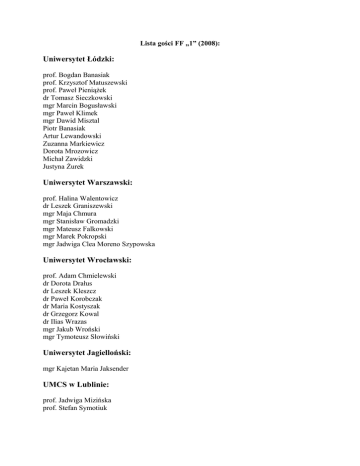 Lista gości FF „1” (2008): Uniwersytet Łódzki: prof. Bogdan Banasiak prof. Krzysztof Matuszewski prof. Paweł Pieniążek dr Tomasz Sieczkowski mgr Marcin Bogusławski mgr Paweł Klimek mgr Dawid Misztal Piotr Banasiak Artur Lewandowski Zuzanna Markiewicz Dorota Mrozowicz Michał Zawidzki Justyna Żurek Uniwersytet Warszawski: prof. Halina Walentowicz dr Leszek Graniszewski mgr Maja Chmura mgr Stanisław Gromadzki mgr Mateusz Falkowski mgr Marek Pokropski mgr Jadwiga Clea Moreno Szypowska Uniwersytet Wrocławski: prof. Adam Chmielewski dr Dorota Drałus dr Leszek Kleszcz dr Paweł Korobczak dr Maria Kostyszak dr Grzegorz Kowal dr Ilias Wrazas mgr Jakub Wroński mgr Tymoteusz Słowiński Uniwersytet Jagielloński: mgr Kajetan Maria Jaksender UMCS w Lublinie: prof. Jadwiga Mizińska prof. Stefan Symotiuk Uniwersytet Szczeciński: prof. Jerzy Kochan Uniwersytet Gdański: prof. Adam Karpiński prof. Aleksandra Pawliszyn dr Anna Łysiak-Łątkowska Uniwersytet Warmińsko-Mazurski w Olsztynie: prof. Lech Ostasz dr Andrzej Kucner Uniwersytet Zielonogórski: dr Artur Pastuszek dr Tomasz Turowski Uniwersytet w Białymstoku: dr Ryszard Gaj dr Zbigniew Kaźmierczak Uniwersytet Opolski: prof. Henryk Benisz UMK w Toruniu: mgr Joanna Kamińska Uniwersytet Śląski: mgr Marzena Dyszy Uniwersytet Adama Mickiewicza w Poznaniu: mgr Anna Jaworska Dolnośląska Szkoła Wyższa we Wrocławiu: dr Michał Kruszelnicki mgr Wojciech Kruszelnicki Collegium Balticum w Szczecinie: prof. Aleksandra Żukrowska WSHE w Łodzi: mgr Konrad Hennig Filia WSHE w Szczecinie: mgr Andrzej Staroń Kolegium Karkonoskie w Jeleniej Górze: prof. Jan Kurowicki Collegium Civitas w Warszawie: dr Barbara Markowska Wyższa Szkoła Menedżerska w Legnicy: dr Michał Markiewicz Akademia Sztuk Plastycznych w Łodzi: dr Tomasz Załuski Akademia Muzyczna w Łodzi: dr Jacek Szerszenowicz Akademia Medyczna we Wrocławiu: dr Jarosław Barański Uniwersytet Medyczny w Łodzi: dr Ewa Hyży Śląski Uniwersytet Medyczny: mgr Agata Sitko Uniwersytet Ekonomiczny we Wrocławiu: dr Marek Zagajewski Politechnika Wrocławska: dr Jan Wadowski Politechnika Białostocka: dr Adam Sawicki Pozostali goście: Magda Barecka dr Gracjan Cimek mgr Marcin Czerwiński („Rita Baum”) Michał Fostowicz mgr Małgorzata Gałach Michał Godziszewski mgr Łukasz Gorczyński Michał ‘Akall’ Iwanowski mgr Elżbieta Jakubowska mgr Mateusz Janik („Recykling Idei”) mgr Krzysztof Jóźwiak mgr Paweł Krzeczkowski mgr Monika Michowicz (Wydawnictwo Naukowe PWN) Paweł Murzicz Bogumiła Radwańska-Zygmunt Joanna Ratajczak-Kurowicka Jędrek Sikora mgr Oskar Szwabowski mgr Joanna Dagmara Szymańska Joanna Zagajewska