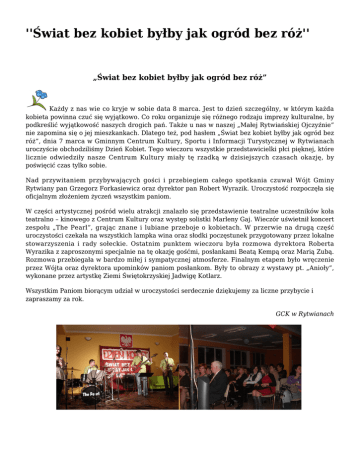 ''Świat bez kobiet byłby jak ogród bez róż'' „Świat bez kobiet byłby jak ogród bez róż” Każdy z nas wie co kryje w sobie data 8 marca. Jest to dzień szczególny, w którym każda kobieta powinna czuć się wyjątkowo. Co roku organizuje się różnego rodzaju imprezy kulturalne, by podkreślić wyjątkowość naszych drogich pań. Także u nas w naszej „Małej Rytwiańskiej Ojczyźnie” nie zapomina się o jej mieszkankach. Dlatego też, pod hasłem „Świat bez kobiet byłby jak ogród bez róż”, dnia 7 marca w Gminnym Centrum Kultury, Sportu i Informacji Turystycznej w Rytwianach uroczyście obchodziliśmy Dzień Kobiet. Tego wieczoru wszystkie przedstawicielki płci pięknej, które licznie odwiedziły nasze Centrum Kultury miały tę rzadką w dzisiejszych czasach okazję, by poświęcić czas tylko sobie. Nad przywitaniem przybywających gości i przebiegiem całego spotkania czuwał Wójt Gminy Rytwiany pan Grzegorz Forkasiewicz oraz dyrektor pan Robert Wyrazik. Uroczystość rozpoczęła się oficjalnym złożeniem życzeń wszystkim paniom. W części artystycznej pośród wielu atrakcji znalazło się przedstawienie teatralne uczestników koła teatralno – kinowego z Centrum Kultury oraz występ solistki Marleny Gaj. Wieczór uświetnił koncert zespołu „The Pearl”, grając znane i lubiane przeboje o kobietach. W przerwie na drugą część uroczystości czekała na wszystkich lampka wina oraz słodki poczęstunek przygotowany przez lokalne stowarzyszenia i rady sołeckie. Ostatnim punktem wieczoru była rozmowa dyrektora Roberta Wyrazika z zaproszonymi specjalnie na tę okazję gośćmi, posłankami Beatą Kempą oraz Marią Zubą. Rozmowa przebiegała w bardzo miłej i sympatycznej atmosferze. Finalnym etapem było wręczenie przez Wójta oraz dyrektora upominków paniom posłankom. Były to obrazy z wystawy pt. „Anioły”, wykonane przez artystkę Ziemi Świętokrzyskiej Jadwigę Kotlarz. Wszystkim Paniom biorącym udział w uroczystości serdecznie dziękujemy za liczne przybycie i zapraszamy za rok. GCK w Rytwianach Gmina Rytwiany - www.rytwiany.com.pl