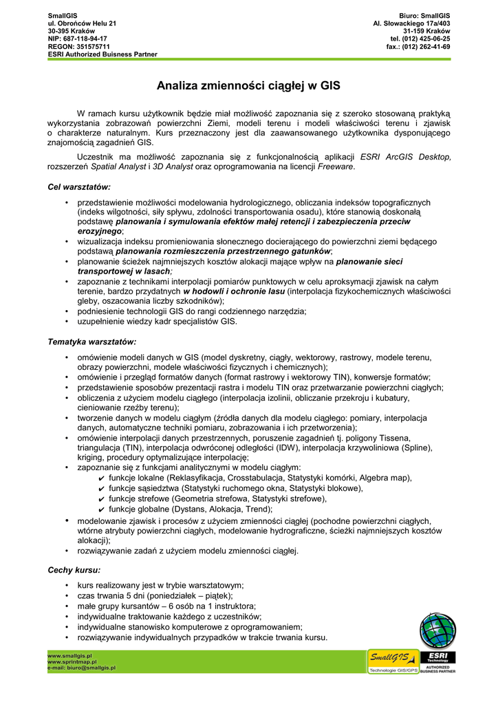 SmallGIS ul. Obrońców Helu 21 30-395 Kraków NIP: 687-118-94-17 REGON: 351575711 ESRI Authorized Buisness Partner Biuro: SmallGIS Al. Słowackiego 17a/403 31-159 Kraków tel. (012) 425-06-25 fax.: (012) 262-41-69 Analiza zmienności ciągłej w GIS W ramach kursu użytkownik będzie miał możliwość zapoznania się z szeroko stosowaną praktyką wykorzystania zobrazowań powierzchni Ziemi, modeli terenu i modeli właściwości terenu i zjawisk o charakterze naturalnym. Kurs przeznaczony jest dla zaawansowanego użytkownika dysponującego znajomością zagadnień GIS. Uczestnik ma możliwość zapoznania się z funkcjonalnością aplikacji ESRI ArcGIS Desktop, rozszerzeń Spatial Analyst i 3D Analyst oraz oprogramowania na licencji Freeware. Cel warsztatów: • • • • • • przedstawienie możliwości modelowania hydrologicznego, obliczania indeksów topograficznych (indeks wilgotności, siły spływu, zdolności transportowania osadu), które stanowią doskonałą podstawę planowania i symulowania efektów małej retencji i zabezpieczenia przeciw erozyjnego; wizualizacja indeksu promieniowania słonecznego docierającego do powierzchni ziemi będącego podstawą planowania rozmieszczenia przestrzennego gatunków; planowanie ścieżek najmniejszych kosztów alokacji mające wpływ na planowanie sieci transportowej w lasach; zapoznanie z technikami interpolacji pomiarów punktowych w celu aproksymacji zjawisk na całym terenie, bardzo przydatnych w hodowli i ochronie lasu (interpolacja fizykochemicznych właściwości gleby, oszacowania liczby szkodników); podniesienie technologii GIS do rangi codziennego narzędzia; uzupełnienie wiedzy kadr specjalistów GIS. Tematyka warsztatów: • • • • • • • • • omówienie modeli danych w GIS (model dyskretny, ciągły, wektorowy, rastrowy, modele terenu, obrazy powierzchni, modele właściwości fizycznych i chemicznych); omówienie i przegląd formatów danych (format rastrowy i wektorowy TIN), konwersje formatów; przedstawienie sposobów prezentacji rastra i modelu TIN oraz przetwarzanie powierzchni ciągłych; obliczenia z użyciem modelu ciągłego (interpolacja izolinii, obliczanie przekroju i kubatury, cieniowanie rzeźby terenu); tworzenie danych w modelu ciągłym (źródła danych dla modelu ciągłego: pomiary, interpolacja danych, automatyczne techniki pomiaru, zobrazowania i ich przetworzenia); omówienie interpolacji danych przestrzennych, poruszenie zagadnień tj. poligony Tissena, triangulacja (TIN), interpolacja odwróconej odległości (IDW), interpolacja krzywoliniowa (Spline), kriging, procedury optymalizujące interpolację; zapoznanie się z funkcjami analitycznymi w modelu ciągłym: ✔ funkcje lokalne (Reklasyfikacja, Crosstabulacja, Statystyki komórki, Algebra map), ✔ funkcje sąsiedztwa (Statystyki ruchomego okna, Statystyki blokowe), ✔ funkcje strefowe (Geometria strefowa, Statystyki strefowe), ✔ funkcje globalne (Dystans, Alokacja, Trend); modelowanie zjawisk i procesów z użyciem zmienności ciągłej (pochodne powierzchni ciągłych, wtórne atrybuty powierzchni ciągłych, modelowanie hydrograficzne, ścieżki najmniejszych kosztów alokacji); rozwiązywanie zadań z użyciem modelu zmienności ciągłej. Cechy kursu: • • • • • • kurs realizowany jest w trybie warsztatowym; czas trwania 5 dni (poniedziałek – piątek); małe grupy kursantów – 6 osób na 1 instruktora; indywidualne traktowanie każdego z uczestników; indywidualne stanowisko komputerowe z oprogramowaniem; rozwiązywanie indywidualnych przypadków w trakcie trwania kursu.