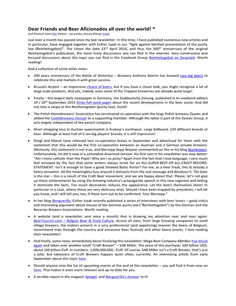 Dear Friends and Beer Aficionados all over the world! * (auf Deutsch bitte hier klicken – po polsku, proszę kliknąć tutaj) Just over a month has passed since my last newsletter. In this time, I have published numerous new articles and in particular, have engaged together with Esther Isaak in our “fight against falsified presentation of the purity law (Reinheitsgebot)”. The closer the date 23rd April 2016, and thus the 500th anniversary of the original Reinheitsgebot’s publication, the more lively discussions one can find in the internet. Very constructive and focused discussions about this topic you can find in the Facebook Group Reinheitsgebot im Gespräch. Worth reading! And a collection of some other news: 200 years anniversary of the Battle of Waterloo – Brewery Anthony Martin has brewed two big beers to celebrate this and markets it with great success. Brussels Airport – an impressive choice of beers, but if you have a closer look, you might recognize a lot of large scale products. And yes, indeed, even some of the Trappist breweries are already quite large! Finally – the largest daily newspaper in Germany, the Süddeutsche Zeitung, published in its weekend edition 19 / 20th September 2015 three full-sized pages about the recent developments in the beer scene. And did not miss a swipe at the Reinheitsgebot (purity law). Good! The Polish Homebrewers’ Association has terminated co-operation with the large Polish brewery Żywiec and added the Castlebrewery Cieszyn as a supporting member. Although the latter is part of the Żywiec Group, it acts largely independent of the parent company. Short shopping tour in Auchan supermarket in Krakow’s northwest. Large billboard: 229 different brands of beer. Although at least half of it are big players’ brands, it is still impressive! Stiegl and Maisel have released two co-operation brews in September and advertised for them with the statement that this would be the first co-operation between an Austrian and a German private brewery. Obviously, this statement is not true, and Biersepp Sepp Wejwar commented on this in his blog Beerkeeper. Unfortunately, he did it now in a somewhat disarmed version. His first rant in his newsletter was way better: “Am I more catholic than the Pope? Why am I so picky? Apart from the fact that I love language, I very much feel annoyed by the fact that some writers always strive for an ALL-SUPER-BEST-OF-ALL-CRAZY-RECORDSTATEMENT. Isn’t it enough to have a good Smoked Baltic Porter? For me, as a beer freak, this IS already a beery sensation. All the meaningless fuss around it distracts from the real message and devalues it. The beer is the star – this is a result of the Craft Beer movement, and we are happy about that. Please, let’s not give up these achievements by using the brewing industry’s propaganda speech in this new segment and letting it dominate the facts. Too much decoration reduces the appearance. Let the beers themselves shine! In particular in a case, where these are very delicious ones. Should I have been trapped by prejudices, I will let you know, and I will tell you, too, if these turn out to be confirmed. Your Biersepp.” In her blog Bierguerilla, Esther Isaak recently published a series of interviews with beer lovers – good critics and interesting argument about misuse of the German purity law (“Reinheitsgebot”) by the German and the Bavarian Brewers Associations. Worth reading. A website (and a newsletter sent once a month) that is drawing my attention over and over again: BeerTourism.com – Belgian Beer & Food Culture. Across all sizes, from large brewing companies to small village brewers, the makers present in a very professional (and appetising) manner the beers of Belgium, recommend trips through the country and announce beer festivals and other beery events. I love reading their newsletter! And finally, some news, immediately bevor finalizing this newsletter: Mega Beer Company ABInBev has struck again and taken over another small “Craft Brewer” – SAB Miller. The price of this purchase: 104 billion USD, about 100 billion EUR. In numbers: 1,000,000,000.- EUR. Of course, SAB Miller isn’t a Craft Brewer, that’s just a joke, but takeovers of Craft Brewers happen quite often, currently. An interesting article from early September about this topic here. Should anyone miss the list of upcoming events at the end of this newsletter – you will find it from now on here. That makes it even more relevant and up-to-date for you. A terrible report in the magazin Spiegel, and Bierguerilla’s Answer to it! And that’s it for now. As always, please find a list of the recently published articles (and several older reports that have been retrieved) right after the Polish text of this newsletter here. Cheers, Volker P.S.: I hope you will enjoy reading my short stories and reports, and I am looking forward to reading your comments and discussions on my homepage. I would even gladly appreciate to publish some articles and reports penned by you – so if you feel an urge to tell the world about your beer experiences, feel free to contact me via eMail. For older issues of this newsletter, please see the archive. * This newsletter is to inform you about the newest issues on www.brunnenbraeu.eu. If you are not interested in it, just send an eMail with the topic “unsubscribe” to [email protected]. Liebe Freunde und Bierliebhaber in aller Welt! * (in English click here, please – po polsku, proszę kliknąć tutaj) Etwas mehr als ein Monat ist seit meinem letzten Newsletter vergangen. Ich habe in der Zeit zahlreiche neue Artikel veröffentlicht und mich insbesondere zusammen mit Esther Isaak im „Kampf gegen die verfälschte Darstellung des Reinheitsgebots“ engagiert. Je näher das Datum 23. April 2016 und damit der 500. Jahrestag der Veröffentlichung des eigentlichen Reinheitsgebots rücken, umso mehr Diskussionen finden sich in den Weiten des Internets. Recht