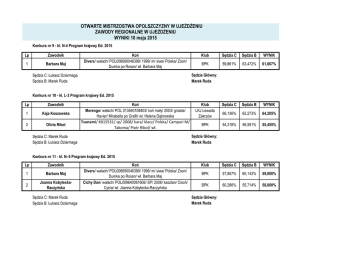 OTWARTE MISTRZOSTWA OPOLSZCZYZNY W UJEŻDŻENIU ZAWODY REGIONALNE W UJEŻDŻENIU WYNIKI 10 maja 2015 Konkurs nr 9 - kl. N-4 Program krajowy Ed. 2015 Lp Zawodnik 1 Barbara Maj Koń Divers/ wałach/ POL006690046399/ 1999/ m/ siwa/ Polska/ Zoon/ Dumka po Rosan/ wł. Barbara Maj Klub Sędzia C Sędzia B WYNIK BPK 59,861% 63,472% 61,667% Klub LKJ Lewada Zakrzów Sędzia C Sędzia B WYNIK 66,136% 62,273% 64,205% BPK 54,318% 56,591% 55,455% Klub Sędzia C Sędzia B WYNIK BPK 57,857% 60,143% 59,000% BPK 60,286% 55,714% 58,000% Sędzia Główny: Marek Ruda Sędzia C: Łukasz Dziarmaga Sędzia B: Marek Ruda Konkurs nr 10 - kl. L-3 Program krajowy Ed. 2015 Lp Zawodnik 1 Kaja Koszowska 2 Olivia Ribol Koń Morengo/ wałach/ POL 013540108403/ koń mały/ 2003/ gniada/ Havier/ Mirabella po Grafit/ wł. Helena Dąbrowska Tsunami/ K015531/ sp/ 2008/ kara/ klacz/ Polska/ Campari M/ Takoma/ Piotr Ribol/ wł. Sędzia Główny: Marek Ruda Sędzia C: Marek Ruda Sędzia B: Łukasz Dziarmaga Konkurs nr 11 - kl. N–5 Program krajowy Ed. 2015 Lp Zawodnik 1 Barbara Maj 2 Joanna KobyłeckaRaczyńska Sędzia C: Marek Ruda Sędzia B: Łukasz Dziarmaga Koń Divers/ wałach/ POL006690046399/ 1999/ m/ siwa/ Polska/ Zoon/ Dumka po Rosan/ wł. Barbara Maj Cichy Don/ wałach/ POL009640061606/ SP/ 2006/ kasztan/ Cisoń/ Cynia/ wł. Joanna Kobyłecka-Raczyńska Sędzia Główny: Marek Ruda Konkurs nr 13 - kl. P-3 Program krajowy, Ed. 2015 Lp Zawodnik 1 Maria Michna 2 Aneta Gajdzińska 3 Jan Limburski 4 Krzysztof Kośmider 5 Agnieszka Siedlak 6 Monika Borzęcka 7 Ada Szewińska 8 Julia Jabłońska 9 Wiktoria Łuszczyńska Sędzia C: Łukasz Dziarmaga Sędzia B: Marek Ruda Koń Lelek/ 616009690142295/ sp/ 1994/ sk. gn./ ogier/ Libellus/ Lemoniada/ wł. Malgorzata Kaliszewska Nobius/ Pol 009660213008/ sp/ 2008/ c. gn./ wałach/ Wieland/ Nescafe/ wł. Aneta Gajdzińska Rainbow/ klacz/ DE 431316614607/ hann/ 2007/ sk.gn./ Romancero H/ Wenzelskrone/ wł. Andrzej Sałacki Krus/ POL009540087799/ sp/ 1999/ gn./ wałach/ Arcus/ Kama/ wł. LKJ Lewada Regata/ POL008590050208/ śl/ 2008/ gniada/ klacz/ Polska/ Berdysz/ Rewia/ wł. Anna Siedlak Sagiwara/ 18784/ sp/ 2009/ gniada/ klacz/ Polska/ Asceta/ Sarisa/ wł. Wojciech Borzęcki Garson/ POL009660042001/ sp/ 2003/ c. gniady/ wałach/ Polska/ Gawor/ Gracja/ wł. Aneta Szewińska Goia/ 040018710006706/ aust. gorącokrwista/ 2006/ kara/ klacz/ Polska/ Garibaldi/ Arosa/ wł. Kamilla Polednia-Jabłońska Mewolta/ 009680049405/ sp/ 2005/ gniada/ klacz/ Polska/ Le Voltaire/ Melodi/ wł. Anna Łuszczyńska Klub LKJ Lewada Zakrzów LKJ Lewada Zakrzów LKJ Lewada Zakrzów LKJ Lewada Zakrzów JKS Cwał Truskolasy JKS Cwał Truskolasy JKS Cwał Truskolasy LKJ Ostroga Opole Sędzia C Sędzia B WYNIK 66,500% 65,500% 66,000% 63,000% 64,250% 63,625% 62,750% 63,750% 63,250% 60,250% 63,750% 62,000% 60,250% 62,500% 61,375% 57,750% 60,000% 58,875% 57,750% 58,750% 58,250% 55,250% 54,750% 55,000% BPK 53,750% 56,000% 54,875% Sędzia Główny: Marek Ruda Finał Otwartych Mistrzostw Opolszczyzny Juniorów Lp Zawodnik 1 Maria Michna 2 Aneta Gajdzińska 3 Jan Limburski 4 Agnieszka Siedlak 5 Monika Borzęcka 6 Ada Szewińska 7 Julia Jabłońska 8 Wiktoria Łuszczyńska Sędzia C: Marek Ruda Sędzia B: Łukasz Dziarmaga Koń Lelek/ 616009690142295/ sp/ 1994/ sk. gn./ ogier/ Libellus/ Lemoniada/ wł. Malgorzata Kaliszewska Nobius/ Pol 009660213008/ sp/ 2008/ c. gn./ wałach/ Wieland/ Nescafe/ wł. Aneta Gajdzińska Rainbow/ klacz/ DE 431316614607/ hann/ 2007/ sk.gn./ Romancero H/ Wenzelskrone/ wł. Andrzej Sałacki Regata/ POL008590050208/ śl/ 2008/ gniada/ klacz/ Polska/ Berdysz/ Rewia/ wł. Anna Siedlak Sagiwara/ 18784/ sp/ 2009/ gniada/ klacz/ Polska/ Asceta/ Sarisa/ wł. Wojciech Borzęcki Garson/ POL009660042001/ sp/ 2003/ c. gniady/ wałach/ Polska/ Gawor/ Gracja/ wł. Aneta Szewińska Goia/ 040018710006706/ aust. gorącokrwista/ 2006/ kara/ klacz/ Polska/ Garibaldi/ Arosa/ wł. Kamilla Polednia-Jabłońska Mewolta/ 009680049405/ sp/ 2005/ gniada/ klacz/ Polska/ Le Voltaire/ Melodi/ wł. Anna Łuszczyńska Klub LKJ Lewada Zakrzów LKJ Lewada Zakrzów LKJ Lewada Zakrzów JKS Cwał Truskolasy JKS Cwał Truskolasy JKS Cwał Truskolasy LKJ Ostroga Opole Sędzia C Sędzia B WYNIK 66,500% 65,500% 66,000% 63,000% 64,250% 63,625% 62,750% 63,750% 63,250% 60,250% 62,500% 61,375% 57,750% 60,000% 58,875% 57,750% 58,750% 58,250% 55,250% 54,750% 55,000% BPK 53,750% 56,000% 54,875% Sędzia Główny: Marek Ruda Konkurs nr 14 - kl. C-3 Program międzynarodowy konkursu indywidualnego ME Juniorów, edycja FEI 2009, kor. 2015 - finał Otwartych Mistrzostw Opolszczyzny Seniorów Lp Zawodnik 1 Jagoda Dąbrowska 2 Natalia Stodoła 3 Nikola Marczak 4 Izabela Szlosarek 5 Aleksandra Pośpiech 6 Paulina Lis Sędzia C: Marek Ruda Sędzia B: Łukasz Dziarmaga Koń Why Not/ k/ DE 431316769203/ Hannover/ 2003/ kasztan/ Weltregent H/ Claerchen po Cordoba/ wł. Andrzej Sałacki Drakar/ wałach/ POL009690009405/ SP/ 2005/ gniada/ Landjonker S/ Dexstera / Uskudar Des Malais/ wł. Witold Stodoła Miss You/ DE431316705308/ han./ 2008/ gniada/ klacz/ Margue H/ Wie Donna/ wł. Andrzej Sałacki Wagner/ DE431315129005/ han./ 2005/ kasztan/ wałach/ Worldly/ Lara/ wł. Wł. Andrzej Sałacki Hun I/ wałach/ POL009670007800/ sp/ 2000/ gniada/ Niels/ Hura I/ Hipovit/ wł. Roman Pośpiech Haiti / klacz/ POL009540059608/ SP/ 2008/ gniada/ Polska/ Aron/ Hańcza po Grey/ wł. Bogusław Lis Klub LKJ Lewada Zakrzów LKJ Lewada Zakrzów LKJ Lewada Zakrzów LKJ Lewada Zakrzów LKJ Lewada Zakrzów JKS Cwał Truskolasy Sędzia Główny: Marek Ruda Sędzia C Sędzia B WYNIK 66,579% 66,842% 66,711% 66,711% 64,868% 65,790% 63,947% 63,421% 63,684% 62,105% 63,947% 63,026% 63,553% 62,105% 62,829% 61,711% 61,579% 61,645% MISTRZOSTWA OPOLSZCZYZNY W DAMSKIM SIODLE Konkurs nr 2 - Finał Mistrzostw Opolszczyzny w Damskim Siodle w ujeżdżeniu - Program P Lp Zawodnik 1 Karolina Frankelova 2 Iva Lasakova 3 Katarzyna Fert 4 Olivia Ribol 5 Asenata Adamus 6 Karolina Rej 7 8 Ko