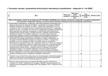 Opis Oferowany Oferowany model producent (oznaczenie typu) Ilość L.p. I. Formularz cenowy i parametrów technicznych oferowanych przedmiotów – załącznik nr 1 do SIWZ Cena jednostkowa brutto Wartość brutto Tablice multimedialne i rzutniki do sal lekcyjnych (CPV 30191200-6, 392920005) wraz z dostawą, wniesieniem, rozładunkiem, montażem, podłączeniem, uruchomieniem, konfiguracją i regulacją, oraz jednorazowym szkoleniem wskazanych przez Zamawiającego użytkowników 1 Zestaw tablicy multimedialnej z: projektorem z ultra krótką ogniskową (w technologii LCD o jasności maksymalnej nie mniejszej niż 3'300AL, rozdzielczości nie mniejszej niż WXGA 1280x800, kontraście nie mniejszym niż 5'000:1, z wbudowanym głośnikiem o mocy nie mniejszej niż 15W), mocowaniem ściennym, białą tablicą suchościeralną 87" o proporcjach boków 16:10 (wym. nie mniejsze niż 1,8x1,12m) ze zintegrowanym systemem interaktywnym elektromagnetycznym pasywnym zawierającym co najmniej dwa pisaki elektroniczne i oprogramowanie w języku polskim, montażem ściennym i instalacją w salach lekcyjnych (niezbędne przewody i inne materiały instalacyjne i pomocnicze należy dostarczyć, zamontować, podłączyć, uruchomić i wyregulować w ramach przedmiotu zamówienia) 2 Zestaw dotykowej tablicy multimedialnej z: projektorem z ultra krótką ogniskową (w technologii LCD o jasności maksymalnej nie mniejszej niż 3'300AL, rozdzielczości nie mniejszej niż WXGA 1280x800, kontraście nie mniejszym niż 5'000:1, z wbudowanym głośnikiem o mocy nie mniejszej niż 15W), mocowaniem ściennym, białą tablicą suchościeralną o przekątnej minimum 88" z proporcjami boków 16:10 (wym. nie mniejsze niż 1,9x1,18m) ze zintegrowanym systemem interaktywnym dotykowym z możliwością obsługi za pomocą dowolnego wskaźnika, w tym palców, zawierającym co najmniej trzy pisaki i oprogramowanie w języku polskim, montażem ściennym i instalacją w sali lekcyjnej (niezbędne przewody i inne materiały instalacyjne i pomocnicze należy dostarczyć, zamontować, podłączyć, uruchomić i wyregulować w ramach przedmiotu zamówienia) 3 Montaż, podłączenie i uruchomienie tablicy interaktywnej (w tym instalacja oprogramowania na jednym komputerze) wraz z niezbędnymi materiałami montażowymi 4 Szkolenie 4 grup użytkowników wskazanych przez Zamawiającego i możliwość korzystania z platformy do samouczenia wykorzystania tablic i oprogramowania dla tych użytkowników przez okres nie krótszy niż 30 dni (dostęp do platformy e-learning) 5 Rzutnik o jasności maksymalnej nie mniejszej 3200 ANSI Lumenów, kontraście nie mniejszym niż 10'000:1, rozdzielczości nie mniejszej 1280x800, wbudowany głośnik 20W, wielkość obrazu 430,8x269,2cm (przekątna 200") przy odległości 710cm - przenośny do sal lekcyjnych 13 zł 1 zł 14 zł 1 zł 2 zł Tablica magnetyczna suchościeralna w ramce aluminiowej 180x120cm Ilość L.p. 6 Opis Oferowany Oferowany model producent (oznaczenie typu) Cena jednostkowa brutto Wartość brutto 2 zł 2 zł 2 zł 2 zł 1 zł 1 zł 1 zł 1 zł 1 zł 1 zł 7 Montaż tablicy suchościeralnej wraz z niezbędnymi materiałami montażowymi 8 Kabel monitorowy HDMI/HDMI (v1.4) LAN, 1m, pozłacane końcówki, wspiera funkcje Audio Return Channel i HDMI Ethernet Channel 9 Przejściówka Mini DisplayPort=>HDMI, obsługa HDMI Ultra HD (4K2K: 4096x2304 & 3840x2160), Plug and Play 10 Rzutnik krótkoogniskowy o jasności maksymalnej nie mniejszej niż 3500 ANSI Lumenów, kontraście nie mniejszym niż 10'000:1, rozdzielczości nie mniej niż 1280x800, wielkość obrazu 323x201,9cm (przekątna 150") przy odległości 150cm - przenośny do sali wielofunkcyjnej 11 Ramowy, wolnostojący składany ekran o proporcjach 16:9 lub 16:10 do projekcji tylnej i przedniej z ramą aluminiową wyposażoną w nóżki z mechanizmem blokującym i skrzynką transportową o obszarze aktywnym 320,9x200,6cm (tj. przekątna ok. 149") 12 13 14 15 Kabel monitorowy SVGA HD15 M/HD15 M 10m z ferrytem Kabel monitorowy HDMI/HDMI 1.4 Ethernet 10m Kabel USB 2.0 z aktywnym wzmacniaczem sygnału dł. 10m Kabel audio miniJack 3,5mm M <=> 2x RCA (CINCH) M dł. 10m Koszt brutto Specyfikacja techniczna Interaktywne tablice multimedialne i rzutniki do sal lekcyjnych (CPV 30191200-6, 392920005) wraz z dostawą, wniesieniem, rozładunkiem, montażem, podłączeniem, uruchomieniem, konfiguracją i regulacją, niezbędnym okablowaniem, oprogramowaniem do prowadzenia zajęć dydaktycznych z pomocą tablic zawierającym szablony w języku polskim, oraz szkoleniem 4 grup użytkowników wskazanych przez Zamawiającego użytkowników a także możliwością korzystania z platformy do samouczenia wykorzystania tablic i oprogramowania dla tych użytkowników przez okres nie krótszy niż 30 dni (dostęp do platformy e-learning) Opis przedmiotu: Zestaw tablicy multimedialnej z: projektorem z ultra krótką ogniskową (w technologii LCD o jasności maksymalnej nie mniejszej niż 3'300AL, rozdzielczości nie mniejszej niż WXGA 1280x800, kontraście nie mniejszym niż 5'000:1, z wbudowanym głośnikiem o mocy nie mniejszej niż 15W), mocowaniem ściennym, białą tablicą suchościeralną 87" o proporcjach boków 16:10 (wym. nie mniejsze niż 1,8x1,12m) ze zintegrowanym systemem interaktywnym elektromagnetycznym pasywnym zawierającym co najmniej dwa pisaki elektroniczne i oprogramowanie w języku polskim, montażem ściennym i instalacją w salach lekcyjnych Ilość: 13zest. Nazwa producenta oferowanego przedmiotu: ................... Model i symbol (typ) oferowanego przedmiotu (wymienić symbole wszystkich podzespołów składowych wchodzących w skład) ................... ................... ................... ................... ................... ................... ................... L.p. Opis parametru 1. zastosowanie Wymagana wartość kompletny zestaw tablicy multimedialnej do wyświetlania obrazu komputerowego o przekątnej 87" na su
