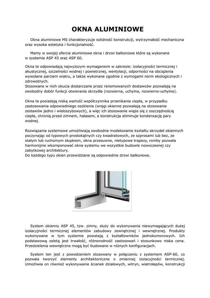 OKNA ALUMINIOWE Okna aluminiowe MS charakteryzuje solidność konstrukcji, wytrzymałość mechaniczna oraz wysoka estetyka i funkcjonalność. Mamy w swojej ofercie aluminiowe okna i drzwi balkonowe które są wykonane w systemie ASP 45 oraz ASP 60. Okna te odpowiadają najwyższym wymaganiom w zakresie: izolacyjności termicznej i akustycznej, szczelności wodnej i powietrznej, wentylacji, odporności na obciążenia wywołane parciem wiatru, a także wykonane zgodnie z wymogami norm ekologicznych i zdrowotnych. Stosowane w nich okucia dostarczane przez renomowanych dostawców pozwalają na swobodny dobór funkcji otwierania skrzydła (rozwierna, uchylna, rozwierno-uchylna). Okna te posiadają niską wartość współczynnika przenikania ciepła, w przypadku zastosowania odpowiedniego oszklenia (wręgi okienne pozwalają na stosowanie zestawów jedno i wieloszybowych), a więc ich stosowanie wiąże się z oszczędnością ciepła, chronią przed zimnem, hałasem, a konstrukcja eliminuje kondensację pary wodnej. Rozwiązania systemowe umożliwiają swobodne modelowanie kształtu skrzydeł okiennych poczynając od typowych prostokątnych czy kwadratowych, ze szprosami lub bez, ze stałym lub ruchomym słupkiem, okna przesuwne, nietypowe trapezy, romby pozwala harmonijnie wkomponować okna systemu we wszystkie budowle nowoczesnej czy zabytkowej architektury. Do każdego typu okien przewidziane są odpowiednie drzwi balkonowe. System okienny ASP 45, tzw. zimny, służy do wykonywania niewymagających dużej izolacyjności termicznej elementów zabudowy zewnętrznej i wewnętrznej. Produkty wykonywane w tym systemie powstają z kształtowników jednokomorowych. Ich podstawową zaletą jest trwałość, różnorodność zastosowań i stosunkowo niska cena. Przedzielenia wewnętrzne mogą być budowane w różnych konfiguracjach. System ten jest z powodzeniem stosowany w połączeniu z systemem ASP-60, co pozwala tworzyć elementy architektoniczne o zmiennej izolacyjności termicznej. Umożliwia on również wykonywanie ścianek działowych, witryn, wiatrołapów, konstrukcji przestrzennych. Okna, ścianki i drzwi systemu ASP 45 posiadają stosowne dopuszczenia do stosowania na terenie Polski i Unii Europejskiej. System okienny ASP 60 – system tzw. ciepły. Okna Systemu ASP 60 cechuje zwarta budowa, która wpływa na wysoką sztywność profilu. Sprawia to, że są one wyjątkowo trwałe. Wyposażając je w dodatkowe wkłady termoizolacyjne radykalnie zmieniamy parametry izolacyjne. Ulepszamy w ten sposób parametry techniczne mające wpływ na ochronę cieplną budynku. Uzyskane w ten sposób pięć komór sprawia, że współczynnik przenikania ciepła osiąga wartość między 1,2 a 1,9 W/mkw ( w zależności od rozmiaru okna i użytej szyby) Istnieją również rozwiązania okien z dodatkowymi fartuchami EPDM mocowanymi bezpośrednio do czoła futryny. Rozwiązania te pozwalają trwale i elastycznie zamontować okno do muru i zapewniają paro i wiatroizolację na długie lata. Okna systemu ASP 60 posiadają stosowne dopuszczenia do stosowania na terenie Polski i Unii Europejskiej. Zostały przebadane w notyfikowanych laboratoriach i mogą być oznaczane znakiem budowlanym B oraz CE. Nowatorskie rozwiązania zastosowane w tym systemie objęte są zgłoszeniami ochronnymi Urzędu Patentowego RP. Podstawowe typy okien aluminiowych RU U R rozwierno- uchylne rozwierane uchylne RU-R dwuskrzydłowe RU-RS dwuskrzydłowe z ruchomym słupkiem dwuskrzydłowe uchylno-przesuwne uchylno-przesuwne 1 uchylno-przesuwne 2 Zalety okien aluminiowych: • wytrzymałość aluminium- 7 razy wyższa od drewna i aż 23 razy wyższa od PCV • lekkość– smukłe, wąskie profile • bogate wzornictwo– wykonanie powierzchni w dowolnym kolorze z palety RAL jak również w kolorach imitujących drewno • szeroki zakres rozwiązań estetycznych- wersje: standardowa, renesansowa (imitująca profil drewniany), ukryte skrzydło • różne wypełnienia- ze szkła pojedynczego lub zespolonego, białego, barwionego w masie bądź refleksyjnego; wzory: szkło płaskie lub ornamentowe • szczelność– na przenikanie wody, powietrze • trwałość- w każdych warunkach • łatwość konserwacji powierzchni– ograniczona do mycia, profile nie wymagają malowania.