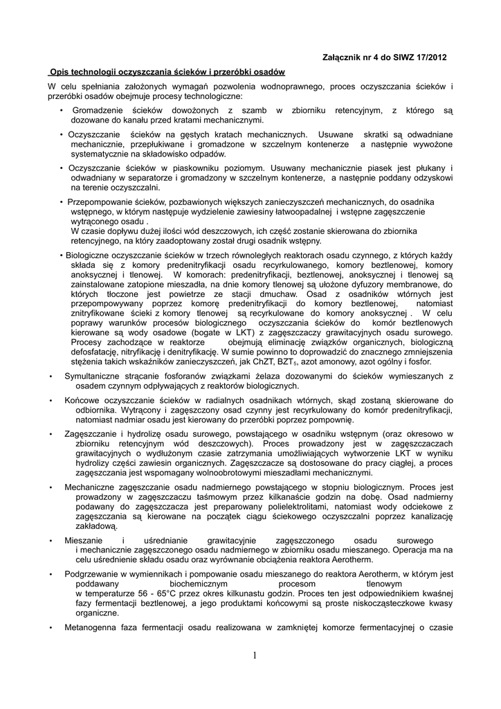 Załącznik nr 4 do SIWZ 17/2012 Opis technologii oczyszczania ścieków i przeróbki osadów W celu spełniania założonych wymagań pozwolenia wodnoprawnego, proces oczyszczania ścieków i przeróbki osadów obejmuje procesy technologiczne: • Gromadzenie ścieków dowożonych z szamb dozowane do kanału przed kratami mechanicznymi. w zbiorniku retencyjnym, z którego są • Oczyszczanie ścieków na gęstych kratach mechanicznych. Usuwane skratki są odwadniane mechanicznie, przepłukiwane i gromadzone w szczelnym kontenerze a następnie wywożone systematycznie na składowisko odpadów. • Oczyszczanie ścieków w piaskowniku poziomym. Usuwany mechanicznie piasek jest płukany i odwadniany w separatorze i gromadzony w szczelnym kontenerze, a następnie poddany odzyskowi na terenie oczyszczalni. • Przepompowanie ścieków, pozbawionych większych zanieczyszczeń mechanicznych, do osadnika wstępnego, w którym następuje wydzielenie zawiesiny łatwoopadalnej i wstępne zagęszczenie wytrąconego osadu . W czasie dopływu dużej ilości wód deszczowych, ich część zostanie skierowana do zbiornika retencyjnego, na który zaadoptowany został drugi osadnik wstępny. • Biologiczne oczyszczanie ścieków w trzech równoległych reaktorach osadu czynnego, z których każdy składa się z komory predenitryfikacji osadu recyrkulowanego, komory beztlenowej, komory anoksycznej i tlenowej. W komorach: predenitryfikacji, beztlenowej, anoksycznej i tlenowej są zainstalowane zatopione mieszadła, na dnie komory tlenowej są ułożone dyfuzory membranowe, do których tłoczone jest powietrze ze stacji dmuchaw. Osad z osadników wtórnych jest przepompowywany poprzez komorę predenitryfikacji do komory beztlenowej, natomiast znitryfikowane ścieki z komory tlenowej są recyrkulowane do komory anoksycznej . W celu poprawy warunków procesów biologicznego oczyszczania ścieków do komór beztlenowych kierowane są wody osadowe (bogate w LKT) z zagęszczaczy grawitacyjnych osadu surowego. Procesy zachodzące w reaktorze obejmują eliminację związków organicznych, biologiczną defosfatację, nitryfikację i denitryfikację. W sumie powinno to doprowadzić do znacznego zmniejszenia stężenia takich wskaźników zanieczyszczeń, jak ChZT, BZT 5, azot amonowy, azot ogólny i fosfor. • Symultaniczne strącanie fosforanów związkami żelaza dozowanymi do ścieków wymieszanych z osadem czynnym odpływających z reaktorów biologicznych. • Końcowe oczyszczanie ścieków w radialnych osadnikach wtórnych, skąd zostaną skierowane do odbiornika. Wytrącony i zagęszczony osad czynny jest recyrkulowany do komór predenitryfikacji, natomiast nadmiar osadu jest kierowany do przeróbki poprzez pompownię. • Zagęszczanie i hydrolizę osadu surowego, powstającego w osadniku wstępnym (oraz okresowo w zbiorniku retencyjnym wód deszczowych). Proces prowadzony jest w zagęszczaczach grawitacyjnych o wydłużonym czasie zatrzymania umożliwiających wytworzenie LKT w wyniku hydrolizy części zawiesin organicznych. Zagęszczacze są dostosowane do pracy ciągłej, a proces zagęszczania jest wspomagany wolnoobrotowymi mieszadłami mechanicznymi. • Mechaniczne zagęszczanie osadu nadmiernego powstającego w stopniu biologicznym. Proces jest prowadzony w zagęszczaczu taśmowym przez kilkanaście godzin na dobę. Osad nadmierny podawany do zagęszczacza jest preparowany polielektrolitami, natomiast wody odciekowe z zagęszczania są kierowane na początek ciągu ściekowego oczyszczalni poprzez kanalizację zakładową. • Mieszanie i uśrednianie grawitacyjnie zagęszczonego osadu surowego i mechanicznie zagęszczonego osadu nadmiernego w zbiorniku osadu mieszanego. Operacja ma na celu uśrednienie składu osadu oraz wyrównanie obciążenia reaktora Aerotherm. • Podgrzewanie w wymiennikach i pompowanie osadu mieszanego do reaktora Aerotherm, w którym jest poddawany biochemicznym procesom tlenowym w temperaturze 56 - 65°C przez okres kilkunastu godzin. Proces ten jest odpowiednikiem kwaśnej fazy fermentacji beztlenowej, a jego produktami końcowymi są proste niskocząsteczkowe kwasy organiczne. • Metanogenna faza fermentacji osadu realizowana w zamkniętej komorze fermentacyjnej o czasie 1 zatrzymania około 15 -19 dni. Wytwarzany biogaz jest wykorzystywany do produkcji ciepła i energii, a powstający okresowo nadmiar biogazu jest magazynowany w zbiorniku, bądź spalany w pochodni. • Gromadzenie osadu przefermentowanego w zbiorniku magazynowania osadu. Operacja ma na celu uśrednienie osadu i zapewnienie płynnej pracy stacji mechanicznego odwadniania. • Mechaniczne odwadnianie osadu na prasach wysokociśnieniowych do około 25 % sm. Odwodniony osad może być odbierany bezpośrednio z oczyszczalni (np. do wykorzystania przyrodniczego) bądź też magazynowany na wewnętrznym placu składowym. Technologia oczyszczania ścieków to procesy mechaniczno – biologiczno - chemiczne prowadzone na urządzeniach oczyszczalni. Proces ten to klasyczny układ 3 - stopniowy Bardenpho noszący nazwę A2/O do zintegrowanego usuwania związków węgla, azotu i fosforu w procesach osadu czynnego realizowany w reaktorze wielofazowym o przepływie tłokowym z osadem czynnym nitryfikującym. Polega na biologicznej defosfatacji w komorach beztlenowych wspomaganej dodatkowo wygenerowanymi w zagęszczaczu grawitacyjnym lotnymi kwasami tłuszczowymi - LKT, denitryfikacji poprzedzającej nitryfikację z zawracaniem azotanów w recyrkulacji wewnętrznej z końca strefy nitryfikacji do denitryfikacji oraz z predenitryfikacją osadu recyrkulowanego (system UCT zmodyfikowany - MUCT) z osadnika wtórnego do strefy defosfatacji. Do napowietrzania stref tlenowych zastosowano system wgłębnego, drobnopęcherzykowego napowietrzania powietrzem dostarczanym z dmuchaw o odpowiednim sprężu ze sterowaniem falownikami na sygnał pochodzący od wskazań tlenomierzy. W sferach beztlenowej i niedotlenionej oraz w 