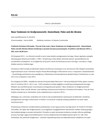 Pol-Int PRACA ZBIOROWA Neue Tendenzen im Strafprozessrecht. Deutschland, Polen und die Ukraine Data opublikowania: 01.03.2016 Zrecenzował(a) Hanna Malik Redakcja naukowa dr Jolanta Czartoryska Friedrich-Christian Schroeder, Tina de Vries (red.), Neue Tendenzen im Strafprozessrecht – Deutschland, Polen und die Ukraine (Nowe tendencje w prawie karnym procesowym), Frankfurt nad Menem 2015, s. 255, cena: 56,50 euro 20 listopada 2012 r. na Ukrainie wszedł w życie nowy kodeks postępowania karnego. Nowa regulacja zastąpiła obowiązujący dotychczas kodeks z 1960 r. Nowelizacja miała zbliżyć ukraiński wymiar sprawiedliwości do standardów europejskich, w szczególności przyczynić się do humanizacji procesu karnego i usunięcia z niego śladów systemu totalitarnego. Omawiana reforma była przedmiotem dwóch konferencji naukowych oraz seminarium dla młodych prawników organizowanych przez niemiecki Instytut Prawa Wschodniego w Monachium wraz z Instytutem Ustawodawstwa – Ukraińskiego parlamentu przy współpracy z Niemiecką Centralą Wymiany Akademickiej w Fischbachau w roku 2012 oraz w Kijowie w roku 2013. Do trwającej od 2008 r. współpracy dwustronnej pomiędzy Niemcami i Ukrainą dołączyła Polska, gdzie ustawą z dnia 27 września 2013 r. (Dz.U. poz. 1247) uchwalona została dogłębna nowelizacja postępowania karnego. Efektem obu konferencji jest recenzowana monografia pod tytułem "Neue Tendenzen im Strafprozessrecht – Deutschland, Polen und die Ukraine" pod redakcją merytoryczną Friedricha–Christiana Schroedera i Tiny de Vries. Książka ukazała się na niemieckim rynku wydawniczym w styczniu 2015 r. Składający się z szesnastu artykułów tom miał na celu przedstawienie najnowszych problemów i tendencji postępowania karnego w Niemczech, w Polsce i na Ukrainie. Artykuły zostały podzielone na sześć części merytorycznych. W pierwszej omówione zostały kwestie podstawowe, w tym typy procesu karnego (prof. dr Friedrich-Christian Schroeder, Die Typen des Strafprozesses), ze szczególnym uwzględnieniem elementów modelu inkwizycyjnego i kontradyktoryjnego w prawie niemieckim. Ponadto w części pierwszej omówiona została reforma polskiego procesu karnego i jego przemodelowanie w stronę zwiększonej kontradyktoryjności (prof. dr. hab. Piotr Hofmański, Der polnische Strafprozess – zwischen Inquisitionsprinzip und akkusatorischem Verfahren). W części wprowadzającej znalazło się też miejsce dla omówienia istniejących już potencjalnie podstaw ogólnoeuropejskiego procesu karnego (Prof. Dr. Burkhard Jähnke, Grundzüge eines gemeineuropäischen Strafprozessrechts). Druga część tomu poświęcona została w całości wprowadzeniu w 2012 r. wspomnianego nowego kodeksu postępowania karnego na Ukrainie. Dokładnie przeanalizowany został z uchwalania nowego ustawodawstwa, zarówno w formie tabelarycznej (prof. dr Friedrich-Christian Schroeder, Zeittafel zur Entstehung der ukrainischen Strafprozessordnung von 2012), jak i opisowej (prof. dr Oleh Zaichuk, Die Entstehung der neuen Strafprozessordnung der Ukraine). W tym miejscu na wyróżnienie zasługuje jedyny w recenzowanym tomie artykuł anglojęzyczny autorstwa prof. dr Loreny Bachmaier Winter pt.: The 2012 Criminal code of Procedure of Ukraine: Achievements and pending issues from a European perspective. Autorka zajmuje się w nim najważniejszymi osiągnięciami nowelizacji oraz przedstawia, w sposób krytyczny, nadal nierozstrzygnięte problemy. Bierze przy tym pod uwagę zwłaszcza praktyczne aspekty współpracy z europejskimi ekspertami konsultującymi reformę na Ukrainie. Na uwagę zasługuje także artykuł dr Olexandra Banchuka pt.: Erste Ergebnisse der Umsetzung der neuen Strafprozessordnung der Ukraine. Autor na podstawie analizy statystyk kryminalnych z roku 2013, w porównaniu z rokiem 2011 i 2012, oraz wywiadów przeprowadzonych z przedstawicielami poszczególnych stron postępowania karnego, przedstawia wybrane aspekty praktyczne i pierwsze efekty omawianej nowelizacji. W kolejnych częściach recenzowanej monografii omówione zostały trzy niezwykle aktualne problemy postępowania karnego we wszystkich trzech krajach. Po pierwsze, bardzo ważne z punktu widzenia ochrony praw obywatelskich, a często ograniczane - prawo do obrony w postępowaniu przygotowawczym. Po drugie, wzbudzające liczne kontrowersje natury polityczno-prawnej i konstytucyjnej – zastosowanie tajnych czynności dochodzeniowo-operacyjnych. Po trzecie, wciąż nowe na gruncie prawa kontynentalnego - porozumienia w procesie karnym. Recenzowana publikacja ma niewątpliwie istotny walor poznawczy. Poszczególne artykuły monografii dość szczegółowo opisują regulacje dotyczące tych samych aspektów postępowania karnego w Polsce, Niemczech i na Ukrainie. Jednakże większość artykułów ogranicza się do opisu i analizy prawa krajowego. Odczuwalny jest brak bardziej szczegółowych wniosków o charakterze prawno-porównawczym, które podkreślałyby różnice i podobieństwa omawianych regulacji oraz ich znaczenie dla transgranicznej praktyki stosowania prawa. Z tego względu na szczególne uwzględnienie zasługuje artykuł dr Thomasa Bode pt.: Verdeckte Ermittlungsmaßnahmen in Deutschland und Polen im Vergleich. Autor przedstawia regulacje dotyczące działalności operacyjno-rozpoznawczej w Polsce oraz ich niemieckiego odpowiednika – verdeckte Ermittlungsmaßnahmen – w aspekcie prawno-porównawczym. Zwraca przy tym szczególną uwagę na problemy związane z praktycznym zastosowaniem omawianych przepisów w aspekcie dochodzeń transgranicznych. W kontekście odniesień do praktyki stosowania prawa warto też zwrócić uwagę na artykuły dotyczące instytucji obrony w postępowaniu przygotowawczym – w aspekcie niemieckim – prof. dr Marka Zöllera, Effektive Verteidigung und Rechtsschutz im Ermittlungsverfahren in Deutschland oraz – w aspekcie polskim prof. dr hab. Cezarego Kuleszy, Effe