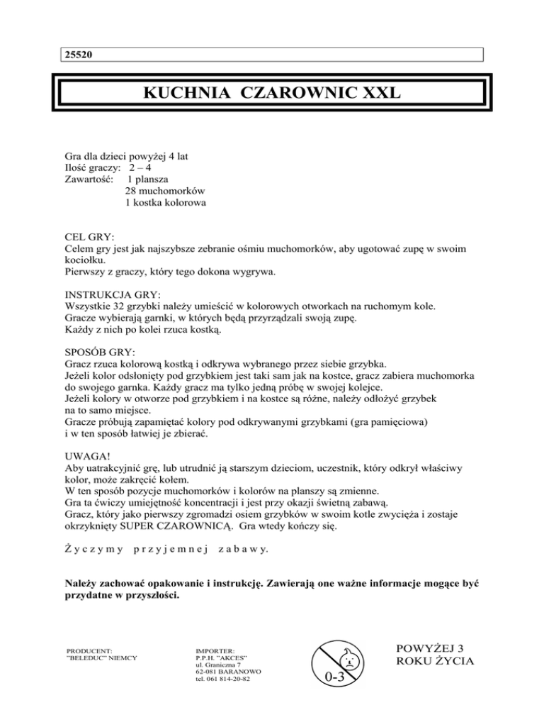 25520 KUCHNIA CZAROWNIC XXL Gra dla dzieci powyżej 4 lat Ilość graczy: 2 – 4 Zawartość: 1 plansza 28 muchomorków 1 kostka kolorowa CEL GRY: Celem gry jest jak najszybsze zebranie ośmiu muchomorków, aby ugotować zupę w swoim kociołku. Pierwszy z graczy, który tego dokona wygrywa. INSTRUKCJA GRY: Wszystkie 32 grzybki należy umieścić w kolorowych otworkach na ruchomym kole. Gracze wybierają garnki, w których będą przyrządzali swoją zupę. Każdy z nich po kolei rzuca kostką. SPOSÓB GRY: Gracz rzuca kolorową kostką i odkrywa wybranego przez siebie grzybka. Jeżeli kolor odsłonięty pod grzybkiem jest taki sam jak na kostce, gracz zabiera muchomorka do swojego garnka. Każdy gracz ma tylko jedną próbę w swojej kolejce. Jeżeli kolory w otworze pod grzybkiem i na kostce są różne, należy odłożyć grzybek na to samo miejsce. Gracze próbują zapamiętać kolory pod odkrywanymi grzybkami (gra pamięciowa) i w ten sposób łatwiej je zbierać. UWAGA! Aby uatrakcyjnić grę, lub utrudnić ją starszym dzieciom, uczestnik, który odkrył właściwy kolor, może zakręcić kołem. W ten sposób pozycje muchomorków i kolorów na planszy są zmienne. Gra ta ćwiczy umiejętność koncentracji i jest przy okazji świetną zabawą. Gracz, który jako pierwszy zgromadzi osiem grzybków w swoim kotle zwycięża i zostaje okrzyknięty SUPER CZAROWNICĄ. Gra wtedy kończy się. Życzymy przyjemnej z a b a w y. Należy zachować opakowanie i instrukcję. Zawierają one ważne informacje mogące być przydatne w przyszłości. PRODUCENT: ”BELEDUC” NIEMCY IMPORTER: P.P.H. ”AKCES” ul. Graniczna 7 62-081 BARANOWO tel. 061 814-20-82 POWYŻEJ 3 ROKU ŻYCIA