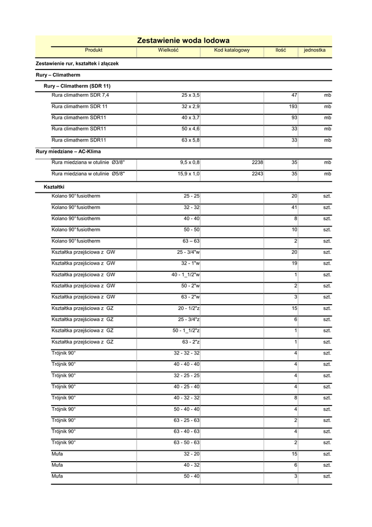 Zestawienie woda lodowa Produkt Wielkość Kod katalogowy Ilość jednostka Zestawienie rur, kształtek i złączek Rury – Climatherm Rury – Climatherm (SDR 11) Rura climatherm SDR 7,4 25 x 3,5 47 mb Rura climatherm SDR 11 32 x 2,9 193 mb Rura climatherm SDR11 40 x 3,7 93 mb Rura climatherm SDR11 50 x 4,6 33 mb Rura climatherm SDR11 63 x 5,8 33 mb Rury miedziane – AC-Klima Rura miedziana w otulinie Ø3/8'' 9,5 x 0,8 2238 35 mb Rura miedziana w otulinie Ø5/8'' 15,9 x 1,0 2243 35 mb Kształtki Kolano 90° fusiotherm 25 - 25 20 szt. Kolano 90° fusiotherm 32 - 32 41 szt. Kolano 90° fusiotherm 40 - 40 8 szt. Kolano 90° fusiotherm 50 - 50 10 szt. Kolano 90° fusiotherm 63 – 63 2 szt. Kształtka przejściowa z GW 25 - 3/4"w 20 szt. Kształtka przejściowa z GW 32 - 1"w 19 szt. Kształtka przejściowa z GW 40 - 1_1/2"w 1 szt. Kształtka przejściowa z GW 50 - 2"w 2 szt. Kształtka przejściowa z GW 63 - 2"w 3 szt. Kształtka przejściowa z GZ 20 - 1/2"z 15 szt. Kształtka przejściowa z GZ 25 - 3/4"z 6 szt. Kształtka przejściowa z GZ 50 - 1_1/2"z 1 szt. Kształtka przejściowa z GZ 63 - 2"z 1 szt. Trójnik 90° 32 - 32 - 32 4 szt. Trójnik 90° 40 - 40 - 40 4 szt. Trójnik 90° 32 - 25 - 25 4 szt. Trójnik 90° 40 - 25 - 40 4 szt. Trójnik 90° 40 - 32 - 32 8 szt. Trójnik 90° 50 - 40 - 40 4 szt. Trójnik 90° 63 - 25 - 63 2 szt. Trójnik 90° 63 - 40 - 63 4 szt. Trójnik 90° 63 - 50 - 63 2 szt. Mufa 32 - 20 15 szt. Mufa 40 - 32 6 szt. Mufa 50 - 40 3 szt. Mufa 63 - 50 4 szt.