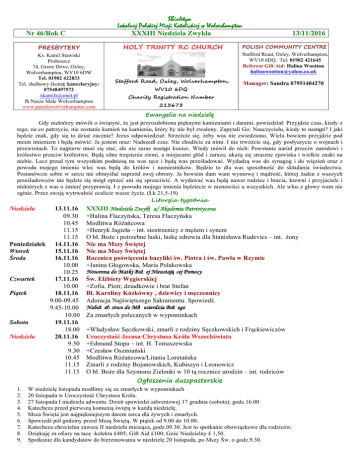 $Biuletyn Lokalnej Polskiej Misji Katolickiej w Wolverhampton XXXIII Niedziela Zwykła Nr 46/Rok C PRESBYTERY HOLY TRINITY RC CHURCH Ks. Kamil Stawiski Proboszcz 74, Green Drive, Oxley, Wolverhampton, WV10 6DW Tel. 01902 422833 Tel. służbowy (kom); kancelaryjny: 07548497572 [email protected] fb Nasze Małe Wolverhampton www.parafiawolverhampton.com Stafford Road, Oxley, Wolverhampton, WV10 6DQ 13/11/2016 POLISH COMMUNITY CENTRE Stafford Road, Oxley, Wolverhampton, WV10 6DQ. Tel: 01902 421645 Referent Gift Aid: Halina Wootton [email protected] Manager: Sandra 07951404270 Charity Registration Number 213673 Ewangelia na niedzielę Gdy niektórzy mówili o świątyni, że jest przyozdobiona pięknymi kamieniami i darami, powiedział: Przyjdzie czas, kiedy z tego, na co patrzycie, nie zostanie kamień na kamieniu, który by nie był zwalony. Zapytali Go: Nauczycielu, kiedy to nastąpi? I jaki będzie znak, gdy się to dziać zacznie? Jezus odpowiedział: Strzeżcie się, żeby was nie zwiedziono. Wielu bowiem przyjdzie pod moim imieniem i będą mówić: Ja jestem oraz: Nadszedł czas. Nie chodźcie za nimi. I nie trwóżcie się, gdy posłyszycie o wojnach i przewrotach. To najpierw musi się stać, ale nie zaraz nastąpi koniec. Wtedy mówił do nich: Powstanie naród przeciw narodowi i królestwo przeciw królestwu. Będą silne trzęsienia ziemi, a miejscami głód i zaraza; ukażą się straszne zjawiska i wielkie znaki na niebie. Lecz przed tym wszystkim podniosą na was ręce i będą was prześladować. Wydadzą was do synagog i do więzień oraz z powodu mojego imienia wlec was będą do królów i namiestników. Będzie to dla was sposobność do składania świadectwa. Postanówcie sobie w sercu nie obmyślać naprzód swej obrony. Ja bowiem dam wam wymowę i mądrość, której żaden z waszych prześladowców nie będzie się mógł oprzeć ani się sprzeciwić. A wydawać was będą nawet rodzice i bracia, krewni i przyjaciele i niektórych z was o śmierć przyprawią. I z powodu mojego imienia będziecie w nienawiści u wszystkich. Ale włos z głowy wam nie zginie. Przez swoją wytrwałość ocalicie wasze życie. (Łk 21,5-19) Liturgia tygodnia Niedziela 13.11.16 09.30 10.45 11.15 11.15 Poniedziałek 14.11.16 Wtorek 15.11.16 Środa 16.11.16 10.00 10.25 Czwartek 17.11.16 10.00 Piątek 18.11.16 9.00-09.45 9.45-10.00 10.00 Sobota 19.11.16 18.00 Niedziela 20.11.16 9.30 9.30 10.45 11.15 11.15 XXXIII Niedziela Zwykł a/ Akademia Patriotyczna +Halina Flaczyńska, Teresa Flaczyńska Modlitwa Różańcowa +Henryk Jagieła – int. siostrzenicy z mężem i synem O bł. Boże i potrzebne łaski, łaskę zdrowia dla Stanisława Rudevics – int. żony Nie ma Mszy Świętej Nie ma Mszy Świętej Rocznica poświęcenia bazyliki św. Piotra i św. Pawła w Rzymie +Janina Głogowska, Maria Polakowska Nowenna do Matki Boż ej Nieustają cej Pomocy Św. Elżbiety Węgierskiej +Zofia, Piotr, dziadkowie i brat Stefan Bł. Karoliny Kózkówny , dziewicy i męczennicy Adoracja Najświętszego Sakramentu. Spowiedź. Naboż eń stwo do Mił osierdzia Boż ego Za zmarłych polecanych w wypominkach +Władysław Sęczkowski, zmarli z rodziny Sęczkowskich i Frąckiewiczów Uroczystość Jezusa Chrystusa Króla Wszechświata +Edmund Stopa – int. H. Tomaszewska +Czesław Oszmiański Modlitwa Różańcowa/Litania Loretańska Zmarli z rodziny Bojanowskich, Kubiszyn i Leonowicz O bł. Boże dla Szymona Zielonki w 10 tą rocznice urodzin – int. rodziców Ogłoszenia duszpasterskie 1. 2. 3. 4. 5. 6. 7. 8. 9. 10. W niedzielę listopada modlimy się za zmarłych w wypominkach 20 listopada w Uroczystość Chrystusa Króla. 27 listopada I niedziela adwentu. Dzień spowiedzi adwentowej 17 grudnia (sobota); godz.16.00 Katecheza przed pierwszą komunią świętą w każdą niedzielę. Msza Święta jest najpiękniejszym darem serca dla żywych i zmarłych. Spowiedź pół godziny przed Mszą Świętą. W piątek od 9.00 do 10.00. Katecheza chrzcielna zawsze II niedziela miesiąca, godz.09.30. Jest to spotkanie obowiązkowe dla rodziców. Dziękuję za ofiary na tacę -kolekta £405; Gift Aid £100; Gość Niedzielny £ 1,50. Spotkanie dla kandydatów do bierzmowania w niedzielę 20 listopada, po Mszy Św. o godz.9.30. Chętnie pomogę osobie starszej-mam kwalifikacje, doświadczenie i bardzo dobre referencje. Edyta 07724496035. 11. Powstała internetowa strona parafii. Adres: www.parafiawolverhampton.com. 12. Polskie Centrum Edukacyjne serdecznie zaprasza dnia 13 listopada 2016 na uroczystą Akademię z okazji odzyskania niepodległości. O godz. 11.15 Msza Święta, następnie Akademia Patriotyczna. 13. Mikołajki w Polskiej Szkole odbędą się 4 grudnia 2016r. Więcej informacji w gablocie, na FB, w Polskiej Szkole. 14. za tydzień II taca na Instytut Polski Akcji Katolickiej 15. Można nabyć: świecie wigilijne, opłatki, kartki świąteczne oraz różańce. Akt przyjęcia Jezusa Chrystusa za Króla i Pana Nieśmiertelny Królu Wieków, Panie Jezu Chryste, nasz Boże i Zbawicielu! W Roku Jubileuszowym 1050-lecia Chrztu Polski, w roku Nadzwyczajnego Jubileuszu Miłosierdzia, oto my, Polacy, stajemy przed Tobą [wraz ze swymi władzami duchownymi i świeckimi], by uznać Twoje Panowanie, poddać się Twemu Prawu, zawierzyć i poświęcić Tobie naszą Ojczyznę i cały Naród. Wyznajemy wobec nieba i ziemi, że Twego królowania nam potrzeba. Wyznajemy, że Ty jeden masz do nas święte i nigdy nie wygasłe prawa. Dlatego z pokorą chyląc swe czoła przed Tobą, Królem Wszechświata, uznajemy Twe Panowanie nad Polską i całym naszym Narodem, żyjącym w Ojczyźnie i w świecie. Pragnąc uwielbić majestat Twej potęgi i chwały, z wielką wiarą i miłością wołamy: Króluj nam Chryste! - W naszych sercach - Króluj nam Chryste! - W naszych rodzinach - Króluj nam Chryste! - W naszych parafiach - Króluj nam Chryste! - W naszych szkołach i uczelniach - Króluj nam Chryste! - W środkach społecznej k
