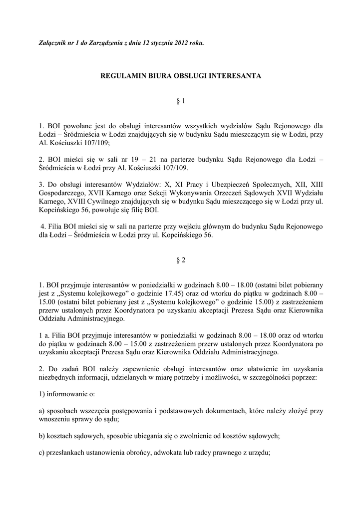 Załącznik nr 1 do Zarządzenia z dnia 12 stycznia 2012 roku. REGULAMIN BIURA OBSŁUGI INTERESANTA §1 1. BOI powołane jest do obsługi interesantów wszystkich wydziałów Sądu Rejonowego dla Łodzi – Śródmieścia w Łodzi znajdujących się w budynku Sądu mieszczącym się w Łodzi, przy Al. Kościuszki 107/109; 2. BOI mieści się w sali nr 19 – 21 na parterze budynku Sądu Rejonowego dla Łodzi – Śródmieścia w Łodzi przy Al. Kościuszki 107/109. 3. Do obsługi interesantów Wydziałów: X, XI Pracy i Ubezpieczeń Społecznych, XII, XIII Gospodarczego, XVII Karnego oraz Sekcji Wykonywania Orzeczeń Sądowych XVII Wydziału Karnego, XVIII Cywilnego znajdujących się w budynku Sądu mieszczącego się w Łodzi przy ul. Kopcińskiego 56, powołuje się filię BOI. 4. Filia BOI mieści się w sali na parterze przy wejściu głównym do budynku Sądu Rejonowego dla Łodzi – Śródmieścia w Łodzi przy ul. Kopcińskiego 56. §2 1. BOI przyjmuje interesantów w poniedziałki w godzinach 8.00 – 18.00 (ostatni bilet pobierany jest z „Systemu kolejkowego” o godzinie 17.45) oraz od wtorku do piątku w godzinach 8.00 – 15.00 (ostatni bilet pobierany jest z „Systemu kolejkowego” o godzinie 15.00) z zastrzeżeniem przerw ustalonych przez Koordynatora po uzyskaniu akceptacji Prezesa Sądu oraz Kierownika Oddziału Administracyjnego. 1 a. Filia BOI przyjmuje interesantów w poniedziałki w godzinach 8.00 – 18.00 oraz od wtorku do piątku w godzinach 8.00 – 15.00 z zastrzeżeniem przerw ustalonych przez Koordynatora po uzyskaniu akceptacji Prezesa Sądu oraz Kierownika Oddziału Administracyjnego. 2. Do zadań BOI należy zapewnienie obsługi interesantów oraz ułatwienie im uzyskania niezbędnych informacji, udzielanych w miarę potrzeby i możliwości, w szczególności poprzez: 1) informowanie o: a) sposobach wszczęcia postępowania i podstawowych dokumentach, które należy złożyć przy wnoszeniu sprawy do sądu; b) kosztach sądowych, sposobie ubiegania się o zwolnienie od kosztów sądowych; c) przesłankach ustanowienia obrońcy, adwokata lub radcy prawnego z urzędu; d) rodzajach środków odwoławczych i terminach do ich wniesienia; e) wydziałach w sądzie, ich właściwości i lokalizacji, numerach telefonów i godzinach ich urzędowania; f) terminach i miejscach rozpraw; 2) udostępnianie list: a) kancelarii adwokackich, radcowskich, notarialnych i komorniczych w zakresie właściwości Sądu Rejonowego dla Łodzi – Śródmieścia w Łodzi oraz Sądu Rejonowego dla Łodzi – Widzewa w Łodzi , listy tłumaczy przysięgłych oraz listy mediatorów w zakresie właściwości Sądu Okręgowego w Łodzi; b) niektórych innych instytucji pozasądowych (Ministerstwo Sprawiedliwości, Rzecznik Praw Obywatelskich, Rzecznik Praw Dziecka, rzecznik konsumentów, inspekcja pracy, jednostki Policji, organizacje pozarządowe itp.); c) lekarzy sądowych uprawnionych do usprawiedliwiania nieobecności i informowanie o zasadach usprawiedliwiania nieobecności, d) udostępnianie formularzy sądowych i wzorów pism sądowych w typowych sprawach rozpoznawanych przez poszczególne wydziały. 3) wydawanie zamówionych dokumentów, przy czym realizacja wniosków o wydanie winna nastąpić w ciągu 3 dni roboczych od daty złożenia wniosku za wyjątkiem dokumentów z akt sprawy, które znajdują się w archiwum zakładowym lub zostały wypożyczone przez inny uprawniony organ – wówczas termin wynosi do 20 dni roboczych. Odbiór zamówionych dokumentów winien nastąpić w wyznaczonym dniu, w przypadku niezgłoszenia się po odbiór, dokumenty po upływie 3 dni roboczych przekazywane są do właściwego wydziału celem przesłania drogą pocztową. 4) wydawanie zapisu dźwięku z akt sprawy (e-protokół) na informatycznym nośniku danych a) zapis dźwięku z przebiegu posiedzenia jawnego, w tym rozprawy wygenerowanej z systemu teleinformatycznego służącego do cyfrowej rejestracji przebiegu posiedzeń jawnych, w tym rozpraw wydawany jest na informatycznym nośniku danych, zapewnianym przez sąd. b) pracownik BOI nagrywa na płytę CD lub DVD zapis obrazu i dźwięku za zgodą Przewodniczącego Wydziału, albo zapis dźwięku z przebiegu posiedzenia, pliki transkrypcji (o ile są dostępne) oraz oprogramowanie służące do odtwarzania nagrania. c) wydanie zapisu dźwięku albo obrazu i dźwięku z przebiegu posiedzenia jawnego, w tym rozprawy następuje po złożeniu wniosku na piśmie, który następnie przekazywany jest właściwemu sekretariatowi Wydziału celem załączenia do akt (wzór formularza zamieszczony na stronie internetowej BIP). d) warunkiem wydania zapisu dźwięku albo obrazu i dźwięku jest dołączenie przez wnioskującego dowodu uiszczenia stosownej opłaty. e) przed wydaniem zapisu dźwięku albo obrazu i dźwięku, pracownik sprawdza tożsamość wnioskodawcy, który zobowiązany jest okazać się dowodem osobistym lub innym dokumentem ze zdjęciem. §3 1) Informacje udzielane są bezpośrednio, telefonicznie lub e-mailowo. Aktualne dane kontaktowe znajdują się na stronie Biuletynu Informacji Publicznej Sądu Rejonowego dla Łodzi – Śródmieścia w Łodzi. 2) Pracownik BOI w toku wykonywania swych obowiązków służbowych obowiązany jest umożliwić interesantom realizację ich uprawnień i egzekwować powinności w sposób zgodny z prawem, wykazując należytą troskę o ochronę ich słusznego interesu. §4 1) BOI nie udziela porad prawnych i informacji, które naruszyłyby przepisy innych aktów prawnych, w tym o ochronie danych osobowych. Przez poradę prawną należy rozumieć skonkretyzowaną informację, mającą zastosowanie w konkretnej sprawie, opartą na danych lub materiałach przedstawionych przez interesanta, której celem jest udzielenie wskazówek, co do sposobu przedstawiania, argumentowania i dowodzenia jego stanowiska przed Sądem w przedmiocie, którego dana sprawa dotyczy, lub która polega na sporządzeniu projek