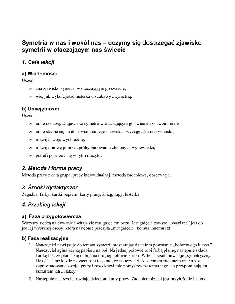 Symetria w nas i wokół nas – uczymy się dostrzegać zjawisko symetrii w otaczającym nas świecie 1. Cele lekcji a) Wiadomości Uczeń: • zna zjawisko symetrii w otaczającym go świecie, • wie, jak wykorzystać lusterka do zabawy z symetrią. b) Umiejętności Uczeń: • umie dostrzegać zjawisko symetrii w otaczającym go świecie i w swoim ciele, • umie skupić się na obserwacji danego zjawiska i wyciągnąć z niej wnioski, • rozwija swoją wyobraźnię, • rozwija mowę poprzez próby budowania złożonych wypowiedzi, • potrafi poruszać się w rytm muzyki. 2. Metoda i forma pracy Metoda pracy z całą grupą, pracy indywidualnej, metoda zadaniowa, obserwacja. 3. Środki dydaktyczne Zagadka, farby, kartki papieru, karty pracy, śnieg, lupy, lusterka. 4. Przebieg lekcji a) Faza przygotowawcza Wszyscy siedzą na dywanie i witają się mrugnięciem oczu. Mrugnięcie zawsze „wysyłane” jest do jednej wybranej osoby, która następnie przesyła „mrugnięcie” komuś innemu itd. b) Faza realizacyjna 1. Nauczyciel nawiązuje do tematu symetrii prezentując dzieciom powstanie „kolorowego kleksa”. Nauczyciel zgina kartkę papieru na pół. Na jednej połowie robi farbą plamę, następnie składa kartkę tak, że plama się odbija na drugiej połowie kartki. W ten sposób powstaje „symetryczny kleks”. Teraz każde z dzieci robi to samo, co nauczyciel. Następnym zadaniem dzieci jest zaprezentowanie swojej pracy i przedstawienie pomysłów na temat tego, co przypominają im kształtem ich „kleksy”. 2. Następnie nauczyciel rozdaje dzieciom karty pracy. Zadaniem dzieci jest przyłożenie lusterka do każdej namalowanej na kwadratach osi symetrii (załącznik 1). Dzieci dochodzą do wniosku, że dzięki powstałemu odbiciu lustrzanemu widzą cały kwadrat. 3. Następnie nauczyciel rozdaje dzieciom lusterka i pokazuje, że przy ich pomocy można dostrzec symetrię w przedmiotach i w ciele. Dzieci bawią się lusterkami. 4. Wszyscy siedzą na dywanie. Nauczyciel zadaje zagadkę (załącznik 2). Jej rozwiązanie (płatki śniegu) stanowi wprowadzenie do kolejnej zabawy. 5. Dzieci przy pomocy lup oglądają płatki śniegu. Omawiany jest ich kształt, niepowtarzalność wzorów, symetria. Nauczyciel pyta dzieci o to, z czego powstaje śnieg i czy jest czysty. Odpowiedzi zostają ustalone po dokonanych obserwacjach. 6. Następnie nauczyciel prowadzi zabawę ruchową „Tańczące płatki”, w której dzieci przy muzyce naśladują opadanie płatków śniegu. c) Faza podsumowująca Na koniec zajęć zdobyte informacje zostają posumowane. Nauczyciel dziękuje dzieciom za udział w zajęciach. 5. Bibliografia brak 6. Załączniki Załącznik 1. Załacznik 2. Piórka z nieba lecą. Zrobią nam kordęłkę puszystą i białą Otuli drzewa, domy i ziemię całą. 7. Czas trwania lekcji 60 minut 8. Uwagi do scenariusza brak