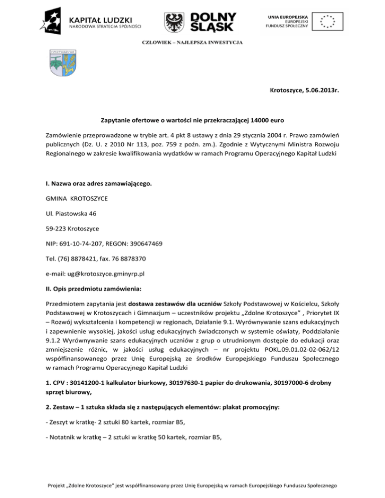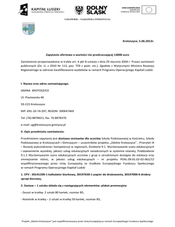 CZŁOWIEK – NAJLEPSZA INWESTYCJA Krotoszyce, 5.06.2013r. Zapytanie ofertowe o wartości nie przekraczającej 14000 euro Zamówienie przeprowadzone w trybie art. 4 pkt 8 ustawy z dnia 29 stycznia 2004 r. Prawo zamówień publicznych (Dz. U. z 2010 Nr 113, poz. 759 z poźn. zm.). Zgodnie z Wytycznymi Ministra Rozwoju Regionalnego w zakresie kwalifikowania wydatków w ramach Programu Operacyjnego Kapitał Ludzki I. Nazwa oraz adres zamawiającego. GMINA KROTOSZYCE Ul. Piastowska 46 59-223 Krotoszyce NIP: 691-10-74-207, REGON: 390647469 Tel. (76) 8878421, fax. 76 8878370 e-mail: [email protected] II. Opis przedmiotu zamówienia: Przedmiotem zapytania jest dostawa zestawów dla uczniów Szkoły Podstawowej w Kościelcu, Szkoły Podstawowej w Krotoszycach i Gimnazjum – uczestników projektu „Zdolne Krotoszyce” , Priorytet IX – Rozwój wykształcenia i kompetencji w regionach, Działanie 9.1. Wyrównywanie szans edukacyjnych i zapewnienie wysokiej, jakości usług edukacyjnych świadczonych w systemie oświaty, Poddziałanie 9.1.2 Wyrównywanie szans edukacyjnych uczniów z grup o utrudnionym dostępie do edukacji oraz zmniejszenie różnic, w jakości usług edukacyjnych – nr projektu POKL.09.01.02-02-062/12 współfinansowanego przez Unię Europejską ze środków Europejskiego Funduszu Społecznego w ramach Programu Operacyjnego Kapitał Ludzki 1. CPV : 30141200-1 kalkulator biurkowy, 30197630-1 papier do drukowania, 30197000-6 drobny sprzęt biurowy, 2. Zestaw – 1 sztuka składa się z następujących elementów: plakat promocyjny: - Zeszyt w kratkę- 2 sztuki 80 kartek, rozmiar B5, - Notatnik w kratkę – 2 sztuki w kratkę 50 kartek, rozmiar B5, Projekt „Zdolne Krotoszyce” jest współfinansowany przez Unię Europejską w ramach Europejskiego Funduszu Społecznego CZŁOWIEK – NAJLEPSZA INWESTYCJA - Notatnik z usztywnianą podkładką i klipsem – 1 sztuka, rozmiar A4, - Długopis – 4 sztuki, niebieski żelowy wkład, automatyczny z tworzywa sztucznego, - Ołówek – 5 sztuk, twardość HB, - Temperówka i gumka do mazania – 1 sztuka, - Kalkulator z podstawowymi działaniami matematycznymi – 1 sztuka, - Cyrkiel z ołówkiem – 1 sztuka, - Zestaw linijek (prosta min. 16 cm, ekierka, kątomierz)- 1 sztuka, - Ryza papieru, biała -1 sztuka. 3. Liczba zestawów: - Szkoła Podstawowa w Kościelcu – 45 zestawów, - Szkoła Podstawowa w Krotoszycach – 53 zestawy, - Gimnazjum w Krotoszycach – 90 zestawów. III. Opis sposobu obliczania ceny. 1. Cena oferty winna obejmować wszelkie koszty jakie poniesie wykonawca przy realizacji zamówienia łącznie z dostawą. 2. Wykonawca zobowiązany jest do podania całkowitej ceny zamówienia, wyliczonej do dwóch miejsc po przecinku, wyrażonej cyfrowo i słownie w złotych polskich. IV. Kryterium oceny ofert: Przy wyborze Zamawiający będzie kierował się następującymi kryteriami: Kryterium: cena -100% Cena oferty - najniższa cena spośród złożonych ofert. V. Termin wykonania zamówienia: Termin wykonania zamówienia – dostawa ustala się na termin 15 sierpnia 2013r. Dostawa Urząd Gminy Krotoszyce, ul. Piastowska 46, 59-223 Krotoszyce. Projekt „Zdolne Krotoszyce” jest współfinansowany przez Unię Europejską w ramach Europejskiego Funduszu Społecznego CZŁOWIEK – NAJLEPSZA INWESTYCJA VI. Wykaz dokumentów, jakie mają dostarczyć wykonawcy: Ofertę określającą cenę wykonania zamówienia, którą należy złożyć na formularzu ofertowym stanowiącym załącznik do niniejszego zapytania. VII. Miejsce składania ofert: Oferty należy składać w formie pisemnej w siedzibie Gminy Krotoszyce ul. Piastowska 46 59-223 Krotoszyce (sekretariat), faksem 76 8878370 lub przesłać na adres e-mail [email protected] w terminie do dnia 21 czerwca 2013r. do godz. 13 00. Osoby do kontaktu – Anna Rabska – Tel. 76 88 78421 w.13 ……………………………………………. ( Podpis i pieczątka Zamawiającego) Projekt „Zdolne Krotoszyce” jest współfinansowany przez Unię Europejską w ramach Europejskiego Funduszu Społecznego CZŁOWIEK – NAJLEPSZA INWESTYCJA Załącznik Formularz ofertowy w ramach projektu „Zdolne Krotoszyce” zestawy dla uczniów Przedmiot zamówienia 1. Zeszyt w kratkę 80 kartek Lp. J.m. Ilość Cena jednostkowa Wartość netto Podatek VAT Wartość brutto Sztuka 376 2. Notatnik w kratkę Sztuka 376 3. Notatnik z usztywnianą podkładką 4. Długopis Sztuka 188 5. Ołówek Sztuka 940 6. Temperówka Sztuka 188 7. Gumka do mazania Sztuka 188 8. Kalkulator Sztuka 188 9. Cyrkiel z ołówkiem Sztuka 188 10. Zestaw linijek Sztuka 188 11. Ryza papieru Sztuka 188 Sztuka 752 Razem .................................................... (miejscowość, data) ..................................................... (pieczęć i podpis Wykonawcy) Projekt „Zdolne Krotoszyce” jest współfinansowany przez Unię Europejską w ramach Europejskiego Funduszu Społecznego