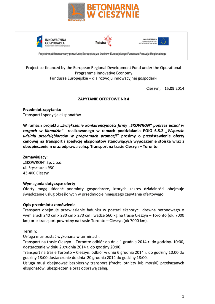 Project co-financed by the European Regional Development Fund under the Operational Programme Innovative Economy Fundusze Europejskie – dla rozwoju innowacyjnej gospodarki Cieszyn, 15.09.2014 ZAPYTANIE OFERTOWE NR 4 Przedmiot zapytania: Transport i spedycja eksponatów W ramach projektu „Zwiększenie konkurencyjności firmy „SKOWRON” poprzez udział w targach w Kanadzie” realizowanego w ramach poddziałania POIG 6.5.2 „Wsparcie udziału przedsiębiorców w programach promocji” prosimy o przedstawienie oferty cenowej na transport i spedycję eksponatów stanowiących wyposażenie stoiska wraz z ubezpieczeniem oraz odprawa celną. Transport na trasie Cieszyn – Toronto. Zamawiający: „SKOWRON” Sp. z o.o. ul. Frysztacka 93C 43-400 Cieszyn Wymagania dotyczące oferty Oferty mogą składać podmioty gospodarcze, których zakres działalności obejmuje świadczenie usług określonych w przedmiocie niniejszego zapytania ofertowego. Opis przedmiotu zamówienia Transport obejmuje przewiezienie ładunku w postaci ekspozycji drewna betonowego o wymiarach 240 cm x 230 cm x 270 cm i wadze 560 kg na trasie Cieszyn – Toronto (ok. 7000 km) oraz transport powrotny na trasie Toronto – Cieszyn (ok 7000 km). Termin: Usługa musi zostać wykonana w terminach: Transport na trasie Cieszyn – Toronto: odbiór do dnia 1 grudnia 2014 r. do godziny. 10:00, dostarczenie w dniu 2 grudnia 2014 r. do godziny 20:00. Transport na trasie Toronto – Cieszyn: odbiór w dniu 6 grudnia 2014 r. do godziny 10:00 do godziny 18:00 dostarczenie do dnia 20 grudnia 2014 do godziny 18:00. Usługa musi obejmować bezpieczny transport (fracht lotniczy lub morski) przekazanych eksponatów, ubezpieczenie oraz odprawę celną. 1 Kryterium oceny oferty: Kryterium wyboru oferty jest najniższa cena realizacji zlecenia. Tryb składania ofert: Oferty mogą być składane: Drogą poczty elektronicznej, za pomocą wiadomości e-mail wysłanej na adres: [email protected] Treść oferty powinna znajdować się w załączniku pozbawionym możliwości edycji. Faksem na numer fax + 48 33 858-32-10 Tradycyjnie (kurierem, pocztą lub osobiście) na adres: „SKOWRON” Sp. z o.o. ul. Frysztacka 93C 43-400 Cieszyn Termin składania ofert: Oferty można składać do dnia 10.10.2014 r. do godziny 16:00. Oferty złożone po terminie nie będą rozpatrywane. Oferta powinna być ważna do 31.10.2014 r. Informacje dodatkowe: Zapytanie umieszczono również na www.betoncieszyn.pl oraz w siedzibie Zamawiającego w miejscu publicznie dostępnym. Telefon kontaktowy 660 455 151. 2