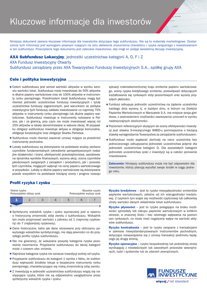 Kluczowe informacje dla inwestorów Niniejszy dokument zawiera kluczowe informacje dla inwestorów dotyczące tego subfunduszu. Nie są to materiały marketingowe. Dostarczenie tych informacji jest wymogiem prawnym mającym na celu ułatwienie zrozumienia charakteru i ryzyka związanego z inwestowaniem w ten subfundusz. Przeczytanie tego dokumentu jest zalecane inwestorowi, aby mógł on podjąć świadomą decyzję inwestycyjną. AXA Subfundusz Lokacyjny, jednostki uczestnictwa kategorii A, D, F i Z AXA Fundusz Inwestycyjny Otwarty Subfundusz zarządzany przez AXA Towarzystwo Funduszy Inwestycyjnych S.A., spółkę grupy AXA Cele i polityka inwestycyjna Celem subfunduszu jest wzrost wartości aktywów w wyniku wzrostu wartości lokat. Subfundusz może inwestować do 50% aktywów w dłużne papiery wartościowe oraz do 100% aktywów w instrumenty rynku pieniężnego. Przedmiotem lokat Subfunduszu mogą być również jednostki uczestnictwa funduszy inwestycyjnych i tytuły uczestnictwa funduszy zagranicznych, pod warunkiem że polityka inwestycyjna tych funduszy zakłada inwestowanie co najmniej 70% aktywów w instrumenty rynku pieniężnego lub dłużne papiery wartościowe. Subfundusz inwestuje w instrumenty notowane w Polsce, jak i za granicą, przy czym nie może inwestować więcej niż 25% aktywów w lokaty denominowane w walucie obcej. W przypadku obligacji subfundusz inwestuje aktywa w obligacje komunalne, obligacje korporacyjne oraz obligacje Skarbu Państwa. Subfundusz może również zawierać umowy mające za przedmiot instrumenty pochodne. Lokaty subfunduszu są dokonywane na podstawie analizy zarówno czynników fundamentalnych (określenie perspektywicznych rodzajów działalności i branż, efektywność przedsiębiorstwa, spodziewana dynamika wyników finansowych, wycena akcji, ocena czynników jakościowych związanych z zarządem i produktem), jak i pozostałych czynników, mogących wpłynąć na cenę papieru wartościowego w przyszłości. Lokaty w dłużne papiery wartościowe są dokonywane przede wszystkim na podstawie bieżącej oceny i prognoz rozwoju sytuacji makroekonomicznej kraju emitenta papieru wartościowego, oceny ryzyka kredytowego emitenta, przewidywań dotyczących kształtowania się rynkowych stóp procentowych oraz wyceny przyszłych płatności. Fundusz odkupuje jednostki uczestnictwa na żądanie uczestnika każdego dnia wyceny, tj. w każdym dniu, w którym na Giełdzie Papierów Wartościowych w Warszawie S.A. ma miejsce sesja giełdowa, z zastrzeżeniem możliwości zawieszenia umorzeń w wyniku nadzwyczajnych okoliczności. Poziomem referencyjnym służącym do oceny efektywności inwestycji jest stawka 3-miesięcznego WIBID-u pomniejszona o bieżącą stawkę wynagrodzenia Towarzystwa za zarządzanie subfunduszem. Subfundusz może wypłacać dochody na rzecz uczestnika bez jednoczesnego odkupywania jednostek uczestnictwa jedynie dla jednostek uczestnictwa kategorii D. Dla pozostałych kategorii jednostek uczestnictwa zyski z inwestycji są w całości ponownie inwestowane. Zalecenie: Niniejszy subfundusz może nie być odpowiedni dla inwestorów, którzy planują wycofać swoje środki w ciągu jednego roku. Profil ryzyka i zysku Niskie ryzyko Potencjalnie niższy zysk 1 2 Wysokie ryzyko Potencjalnie wyższy zysk 3 4 5 6 7 Syntetyczny wskaźnik ryzyka i zysku wyznaczany jest w oparciu o historyczną zmienność stóp zwrotu z subfunduszu. Wskaźnik ten może przyjmować wartości z zakresu od 1 (najmniej ryzykowny) do 7 (najbardziej ryzykowny). Dane historyczne, takie jak dane stosowane przy obliczaniu powyższego wskaźnika syntetycznego, nie dają pewności co do przyszłego profilu ryzyka subfunduszu. Nie ma gwarancji, że wskazana powyżej kategoria ryzyka pozostanie niezmienna. Przypisanie subfunduszu do danej kategorii może z czasem ulec zmianie. Najniższa kategoria ryzyka nie oznacza inwestycji wolnej od ryzyka. Przypisanie subfunduszu do kategorii 1 wynika z faktu, że subfun dusz większość środków lokuje w bezpieczne instrumenty rynku pieniężnego, charakteryzujące się niską zmiennością stóp zwrotu. Z inwestycją w jednostki uczestnictwa subfunduszu wiążą się następujące ryzyka, które nie są odpowiednio uwzględnione przez syntetyczny wskaźnik ryzyka i zysku: Ryzyko kredytowe – jest to ryzyko niewypłacalności emitentów papierów wartościowych, zależne od ich wiarygodności kredytowej. Z ryzykiem tym wiąże się możliwość częściowej lub całkowitej utraty wartości danych składników lokat subfunduszu. Ryzyko płynności – jest to ryzyko polegające na braku możliwości sprzedaży lub zakupu papierów wartościowych w krótkim okresie, w znacznej ilości i bez istotnego wpływania na poziom cen rynkowych, co może mieć negatywny wpływ na wartość aktywów subfunduszu. Ryzyko kontrahenta – jest to ryzyko związane z transakcjami w zakresie niewystandaryzowanych instrumentów pochodnych, dotyczące niewywiązania się z umowy transakcji podmiotu będącego jej drugą stroną. Ryzyko operacyjne – ryzyko bezpośredniej lub pośredniej straty wynikającej z niewłaściwych lub zawodnych procesów wewnętrznych, ludzi i systemów lub ze zdarzeń zewnętrznych. Opłaty Jednostki Jednostki uczestnictwa uczestnictwa kategorii A kategorii D i F Rodzaj opłaty Jednostki uczestnictwa kategorii Z Opłaty jednorazowe pobierane przed lub po dokonaniu inwestycji Opłata za nabycie 0% 0% 0% Opłata za umorzenie 0% 0% 0% Jest to maksymalna opłata jaka może zostać pobrana z Państwa środków przed ich zainwestowaniem lub przed wypłaceniem zysków z inwestycji. Opłaty pobierane z funduszu w ciągu roku Opłaty bieżące 0,89% nie dotyczy 0,89% Opłaty ponoszone przez inwestorów służą pokryciu kosztów działania subfunduszu, w tym kosztów dystrybucji. Opłaty te zmniejszają potencjalny wzrost inwestycji. Przedstawione stawki opłat za nabycie i umorzenie jednostek uczestnictwa są stawkami maks