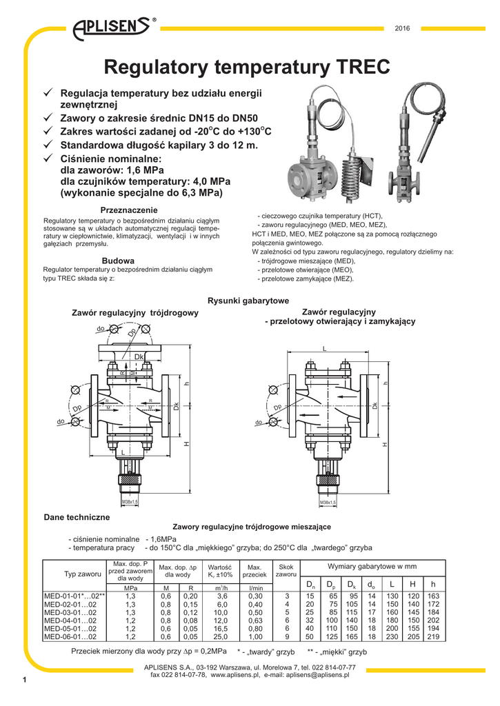 2016 Regulatory temperatury TREC [ Regulacja temperatury bez udzia³u energii zewnêtrznej [ Zawory o zakresie œrednic DN15 do DN50 [ Zakres wartoœci zadanej od -20 C do +130 C [ Standardowa d³ugoœæ kapilary 3 do 12 m. [ Ciœnienie nominalne: O O dla zaworów: 1,6 MPa dla czujników temperatury: 4,0 MPa (wykonanie specjalne do 6,3 MPa) Przeznaczenie Regulatory temperatury o bezpoœrednim dzia³aniu ci¹g³ym stosowane s¹ w uk³adach automatycznej regulacji temperatury w ciep³ownictwie, klimatyzacji, wentylacji i w innych ga³êziach przemys³u. Budowa Regulator temperatury o bezpoœrednim dzia³aniu ci¹g³ym typu TREC sk³ada siê z: - cieczowego czujnika temperatury (HCT), - zaworu regulacyjnego (MED, MEO, MEZ), HCT i MED, MEO, MEZ po³¹czone s¹ za pomoc¹ roz³¹cznego po³¹czenia gwintowego. W zale¿noœci od typu zaworu regulacyjnego, regulatory dzielimy na: - trójdrogowe mieszaj¹ce (MED), - przelotowe otwieraj¹ce (MEO), - przelotowe zamykaj¹ce (MEZ). Rysunki gabarytowe Zawór regulacyjny - przelotowy otwieraj¹cy i zamykaj¹cy Zawór regulacyjny trójdrogowy Dp do L R R M M Dk Dp Dk h h M R Dk Dp do H H do L M38x1,5 M38x1,5 Dane techniczne Zawory regulacyjne trójdrogowe mieszaj¹ce - ciœnienie nominalne - 1,6MPa - temperatura pracy - do 150°C dla „miêkkiego” grzyba; do 250°C dla „twardego” grzyba Max. dop. P Max. dop. ? p Typ zaworu przed zaworem dla wody dla wody Wartoœæ KV ±10% MPa M R m3/h l/min 1,3 1,3 1,3 1,2 1,2 1,2 0,6 0,8 0,8 0,8 0,6 0,6 0,20 0,15 0,12 0,08 0,05 0,05 3,6 6,0 10,0 12,0 16,5 25,0 0,30 0,40 0,50 0,63 0,80 1,00 MED-01-01*…02** MED-02-01…02 MED-03-01…02 MED-04-01…02 MED-05-01…02 MED-06-01…02 Przeciek mierzony dla wody przy ?p = 0,2MPa 1 Max. przeciek Wymiary gabarytowe w mm Skok zaworu 3 4 5 6 6 9 * - „twardy” grzyb Dn Dp Dk do L H h 15 20 25 32 40 50 65 75 85 100 110 125 95 105 115 140 150 165 14 14 17 18 18 18 130 150 160 180 200 230 120 140 145 150 155 205 163 172 184 202 194 219 ** - „miêkki” grzyb APLISENS S.A., 03-192 Warszawa, ul. Morelowa 7, tel. 022 814-07-77 fax 022 814-07-78, www.aplisens.pl, e-mail: [email protected] 2013 Zawory regulacyjne - przelotowe otwieraj¹ce i zamykaj¹ce Ciœnienie nominalne - 1,6MPa Temperatura pracy - do 150°C dla „miêkkiego” grzyba; do 250°C dla „twardego” grzyba Max. dop. P przed zaworem dla wody Typ zaworu MEO-01-01*…02** MEZ-01-01…02 MEO-02-01…02 MEZ-02-01…02 MEO-03-01…02 MEZ-03-01…02 MEO-04-01…02 MEZ-04-01…02 MEO-05-01…02 MEZ-05-01…02 MEO-06-01…02 MEZ-06-01…02 Max. dop. ? p dla wody MPa wody 1,3 1,5 1,3 1,3 1,3 1,5 1,2 1,2 1,2 1,2 1,0 1,2 1,2 1,2 1,3 1,3 0,8 0,8 0,9 0,9 0,6 0,6 0,5 0,5 pary Wartoœæ KV ±10% m3/h l/min 3,6 0,06 0,06 0,08 0,08 0,10 0,10 0,13 0,13 0,16 0,16 0,20 0,20 1,3 6,0 1,3 10,0 1,3 12,0 1,3 16,5 1,3 1,3 Max. przeciek 25,0 25,0 Przeciek mierzony dla wody przy ? p = 0,2MPa Wymiary gabarytowe w mm Skok zaworu 3 3 4 4 5 5 6 6 6 6 9 9 * - „twardy” grzyb Dn Dp Dk Do L H h 15 15 20 20 25 25 32 32 40 40 50 50 65 65 75 75 85 85 100 100 110 110 125 125 95 95 105 105 115 115 140 140 150 150 165 165 14 14 14 14 17 17 18 18 18 18 18 18 130 130 150 150 160 160 180 180 200 200 230 230 120 120 140 140 145 145 150 150 155 155 205 205 118 118 129 129 129 129 148 148 148 148 167 167 ** - „miêkki” grzyb Cieczowe czujniki temperatury Cieczowe czujniki temperatury typu HCT- s¹ przeznaczone do sterowania zaworami regulacyjnymi typu MED, MEO-, MEZ-. Cisnienie nominalne 4,0 MPa (wykonanie specjalne do 6,3 MPa). Typ czujnika HCT-01-01 HCT-01-02 HCT-05-01 HCT-05-02 Zakres wartoœci zadanej °C -20…+50 0…70 30…100 60…130 Wspó³czynnik propor. mm/°C 0,4 0,6 0,4 0,6 Sta³a czasowa wody s 75 80 Temperat. przegrzan. Materia³ czujnika °C 50 40 mosi¹dz M63 50 40 stal 1H18N9T Wymiary gabarytowe Lc Dc 236 361 22 Dp do mm Ia Lw Dg 205 1" Ib 270 21,3 405 Dw L d³ug. kapil. M38 3m x1,5 6m 9m UWAGA: Standardowe wykonanie +30…100°C Regulator temperatury - dobór cieczowego czujnika temperatury i zaworu regulacyjnego Typ cieczowego czujnika temperatury Zakres proporcjonalnoœci w °C w po³¹czeniu z zaworami regulacyjnymi Typ zaworu regulacyjnego MED-01 MEO-01 MEZ-01 MED-02 MEO-02 MEZ-02 MED-03 MEO-03 MEZ-03 MED-04 MEO-04 MEZ-04 MED-05 MEO-05 MEZ-05 MED-06 MEO-06 MEZ-06 HCT-01-01 HCT-05-01 7,5 10 12,5 15 15 24 HCT-01-02 HCT-05-02 5 6,5 8 9,5 9,5 15 Zakresy proporcjonalnoœci wpisane w podwójnej ramce s¹ wartoœciami standardowymi zalecanymi do stosowania. APLISENS S.A., 03-192 Warszawa, ul. Morelowa 7, tel. 022 814-07-77 fax 022 814-07-78, www.aplisens.pl, e-mail: [email protected] 2 2013 Sposób zamawiania 1i5 Dc Sposób oznaczania wykonañ cieczowych czujników temperatury Dw Lw Wspó³czynnik proporcjonalnoœci Xp: -01 - Xp = 0,4 mm/°C -02 - Xp = 0,6 mm/°C D³ugoœæ kapilary: - 3m - 6m - 9m - 12m -1 -2 -3 -4 Zakres nastawy w °C: • 30…100 • 0…70 • -20…50 • 60…130 -1 -2 -3 -4 Lc (*) Cieczowy czujnik temperatury HCT- ( ) -( ) - ( ) - ( ) Kszta³t czujnika (materia³): -01 - rurowy (M63) - rurowy ze stali kwasoodpornej -05 (1H18N9T) Dg * wersja z ciœnieniem nominalnym czujnika temperatury do 6,3 MPa - dostêpna na specjalne zamówienie po uzgodnieniu z konsultantem APLISENS Przyk³ad: Regulator temperatury o bezpoœrednim dzia³aniu ci¹g³ym: Cieczowy czujnik temperatury z czujnikiem rurowym, wspó³czynnikiem proporcjonalnoœci Xp=0,4 mm/°C, d³ugoœci¹ kapilary 3m, zakresem nastawy od 30°C do 100°C i zaworem regulacyjnym zamykaj¹cym Dn15. TREC - HCT-01-01-1-1 + MEZ-01-02 Wyposa¿enie dodatkowe Os³ona zespo³u czujnika Czujnik temperatury HCT-01- i HCT-05 mo¿na umieszczaæ w os³onie o symbolu HC3-0135 (z materia³u M63). Os³ona ta zabezpiecza rurê czujnika oraz pozwala na wymianê zespo³u czujnika bez wy³¹czania instalacji. Inne wykonania os³on po uzgodnieniu z konsultantem APLISENS. Os³ona zespo³u czujnika HC3-0135 HC3-0135-2 406mm 3 Do 25mm Dg Dn 1" M38x1,5 L APLISENS S.A., 03-192 Wars