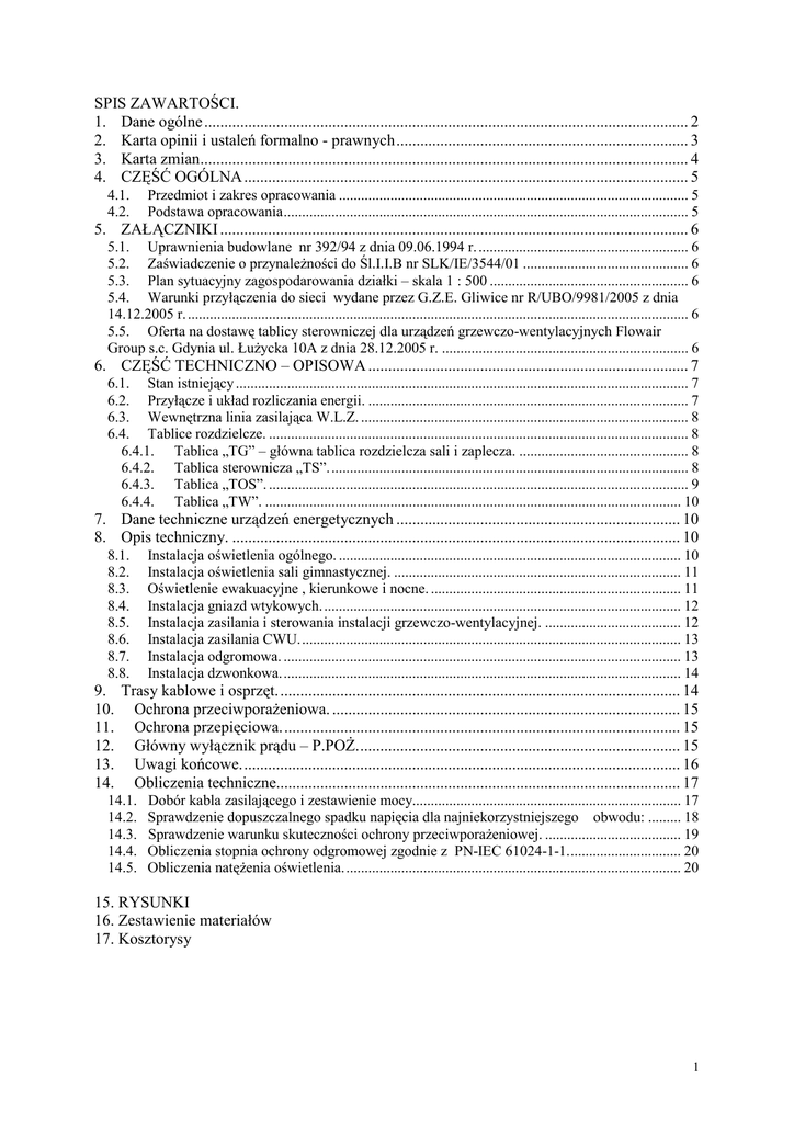 SPIS ZAWARTOŚCI. 1. Dane ogólne ......................................................................................................................... 2 2. Karta opinii i ustaleń formalno - prawnych......................................................................... 3 3. Karta zmian.......................................................................................................................... 4 4. CZĘŚĆ OGÓLNA ............................................................................................................... 5 4.1. 4.2. Przedmiot i zakres opracowania ............................................................................................... 5 Podstawa opracowania.............................................................................................................. 5 5. ZAŁĄCZNIKI ..................................................................................................................... 6 5.1. Uprawnienia budowlane nr 392/94 z dnia 09.06.1994 r. ......................................................... 6 5.2. Zaświadczenie o przynależności do Śl.I.I.B nr SLK/IE/3544/01 ............................................. 6 5.3. Plan sytuacyjny zagospodarowania działki – skala 1 : 500 ...................................................... 6 5.4. Warunki przyłączenia do sieci wydane przez G.Z.E. Gliwice nr R/UBO/9981/2005 z dnia 14.12.2005 r. ........................................................................................................................................ 6 5.5. Oferta na dostawę tablicy sterowniczej dla urządzeń grzewczo-wentylacyjnych Flowair Group s.c. Gdynia ul. Łużycka 10A z dnia 28.12.2005 r. ................................................................... 6 6. CZĘŚĆ TECHNICZNO – OPISOWA ................................................................................ 7 6.1. Stan istniejący ........................................................................................................................... 7 6.2. Przyłącze i układ rozliczania energii. ....................................................................................... 7 6.3. Wewnętrzna linia zasilająca W.L.Z. ......................................................................................... 8 6.4. Tablice rozdzielcze. .................................................................................................................. 8 6.4.1. Tablica „TG” – główna tablica rozdzielcza sali i zaplecza. .............................................. 8 6.4.2. Tablica sterownicza „TS”.................................................................................................. 8 6.4.3. Tablica „TOS”. .................................................................................................................. 9 6.4.4. Tablica „TW”. ................................................................................................................. 10 7. Dane techniczne urządzeń energetycznych ....................................................................... 10 8. Opis techniczny. ................................................................................................................ 10 8.1. 8.2. 8.3. 8.4. 8.5. 8.6. 8.7. 8.8. Instalacja oświetlenia ogólnego. ............................................................................................. 10 Instalacja oświetlenia sali gimnastycznej. .............................................................................. 11 Oświetlenie ewakuacyjne , kierunkowe i nocne. .................................................................... 11 Instalacja gniazd wtykowych.................................................................................................. 12 Instalacja zasilania i sterowania instalacji grzewczo-wentylacyjnej. ..................................... 12 Instalacja zasilania CWU........................................................................................................ 13 Instalacja odgromowa. ............................................................................................................ 13 Instalacja dzwonkowa............................................................................................................. 14 9. Trasy kablowe i osprzęt..................................................................................................... 14 10. Ochrona przeciwporażeniowa. ....................................................................................... 15 11. Ochrona przepięciowa.................................................................................................... 15 12. Główny wyłącznik prądu – P.POŻ................................................................................. 15 13. Uwagi końcowe.............................................................................................................. 16 14. Obliczenia techniczne..................................................................................................... 17 14.1. 14.2. 14.3. 14.4. 14.5. Dobór kabla zasilającego i zestawienie mocy......................................................................... 17 Sprawdzenie dopuszczalnego spadku napięcia dla najniekorzystniejszego obwodu: ......... 18 Sprawdzenie warunku skuteczności ochrony przeciwporażeniowej. ..................................... 19 Obliczenia stopnia ochrony odgromowej zgodnie z PN-IEC 61024-1-1............................... 20 Obliczenia natężenia oświetlenia............................................................................................ 20 15. RYSUNKI 16. Zestawienie materiałów 17. Kosztorysy 1 1. Dane ogólne Dokumentacja nr: Zamawiający: 17/KA/12/05 INFO-PROJEKT BIURO USŁUG PROJEKTOWYCH 47-440 GÓRKI ŚLĄSKIE UL. OFIAR OŚWIĘCIMSKICH 63 Inwestor: URZĄD MIASTA CZERWIONKA-LESZCZYNY 44-238 CZERWIONKA-LESZCZYNY UL. PARKOWA 6 GIMNAZJUM NR 2 Lokalizacja: CZERWI