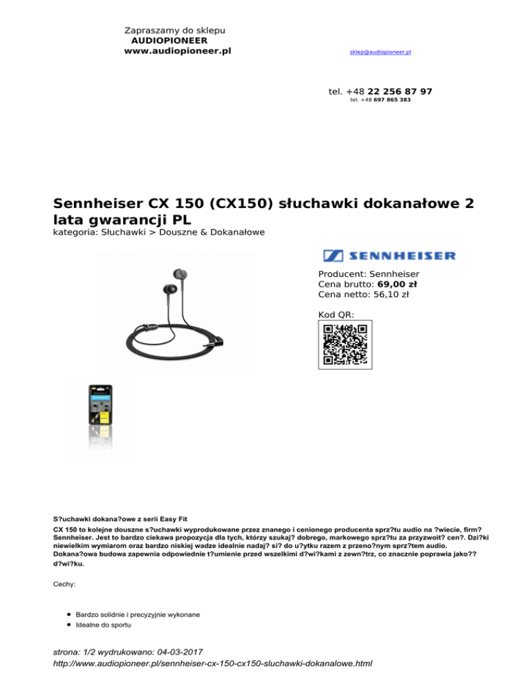 Zapraszamy do sklepu AUDIOPIONEER www.audiopioneer.pl [email protected] tel. +48 22 256 87 97 tel. +48 697 865 383 Sennheiser CX 150 (CX150) słuchawki dokanałowe 2 lata gwarancji PL kategoria: Słuchawki > Douszne & Dokanałowe Producent: Sennheiser Cena brutto: 69,00 zł Cena netto: 56,10 zł Kod QR: S?uchawki dokana?owe z serii Easy Fit CX 150 to kolejne douszne s?uchawki wyprodukowane przez znanego i cenionego producenta sprz?tu audio na ?wiecie, firm? Sennheiser. Jest to bardzo ciekawa propozycja dla tych, którzy szukaj? dobrego, markowego sprz?tu za przyzwoit? cen?. Dzi?ki niewielkim wymiarom oraz bardzo niskiej wadze idealnie nadaj? si? do u?ytku razem z przeno?nym sprz?tem audio. Dokana?owa budowa zapewnia odpowiednie t?umienie przed wszelkimi d?wi?kami z zewn?trz, co znacznie poprawia jako?? d?wi?ku. Cechy: Bardzo solidnie i precyzyjnie wykonane Idealne do sportu strona: 1/2 wydrukowano: 04-03-2017 http://www.audiopioneer.pl/sennheiser-cx-150-cx150-sluchawki-dokanalowe.html S?uchawki s? nowe, w oryginalnym opakowaniu. Pochodz? od Polskiego oficjalnego dystrybutora i s? z Polsk? 2 letni? gwarancj?. Przetworniki: Dynamiczne Konstrukcja obudowy: Zamkni?te Impedancja: 16 Ohm Skuteczno??: 110dB Pasmo przenoszenia: 20 - 20.000Hz D?ugo?? przewodu: 1.2m Asymetryczny kabel: TAK Typ wtyku: 3.5mm mini jack Typ wtyku: K?towy Regulacja g?o?no?ci: NIE Mikrofon: NIE Etui ochronne: NIE Redukcja szumów: NIE Waga bez kabla: 5g strona: 2/2 wydrukowano: 04-03-2017 http://www.audiopioneer.pl/sennheiser-cx-150-cx150-sluchawki-dokanalowe.html