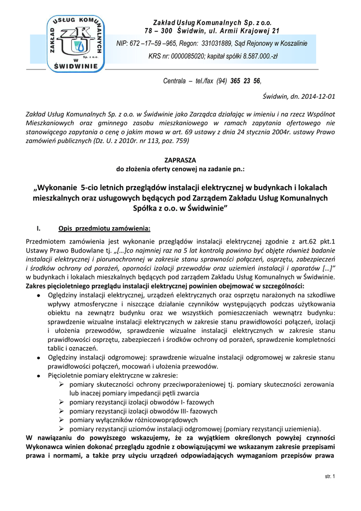 Zakład Usług Komunalnych S p . z o.o. 78 – 300 Świdwin, u l. Armii Kraj owej 21 NIP: 672 –17–59 –965, Regon: 331031889, Sąd Rejonowy w Koszalinie KRS nr: 0000085020; kapitał spółki 8.587.000.-zł Centrala – tel./fax (94) 365 23 56, Świdwin, dn. 2014-12-01 Zakład Usług Komunalnych Sp. z o.o. w Świdwinie jako Zarządca działając w imieniu i na rzecz Wspólnot Mieszkaniowych oraz gminnego zasobu mieszkaniowego w ramach zapytania ofertowego nie stanowiącego zapytania o cenę o jakim mowa w art. 69 ustawy z dnia 24 stycznia 2004r. ustawy Prawo zamówień publicznych (Dz. U. z 2010r. nr 113, poz. 759) ZAPRASZA do złożenia oferty cenowej na zadanie pn.: „Wykonanie 5-cio letnich przeglądów instalacji elektrycznej w budynkach i lokalach mieszkalnych oraz usługowych będących pod Zarządem Zakładu Usług Komunalnych Spółka z o.o. w Świdwinie” I. Opis przedmiotu zamówienia: Przedmiotem zamówienia jest wykonanie przeglądów instalacji elektrycznej zgodnie z art.62 pkt.1 Ustawy Prawo Budowlane tj. „[…]co najmniej raz na 5 lat kontrolą powinno być objęte również badanie instalacji elektrycznej i piorunochronnej w zakresie stanu sprawności połączeń, osprzętu, zabezpieczeń i środków ochrony od porażeń, oporności izolacji przewodów oraz uziemień instalacji i aparatów […]” w budynkach i lokalach mieszkalnych będących pod zarządem Zakładu Usług Komunalnych w Świdwinie. Zakres pięcioletniego przeglądu instalacji elektrycznej powinien obejmować w szczególności: Oględziny instalacji elektrycznej, urządzeń elektrycznych oraz osprzętu narażonych na szkodliwe wpływy atmosferyczne i niszczące działanie czynników występujących podczas użytkowania obiektu na zewnątrz budynku oraz we wszystkich pomieszczeniach wewnątrz budynku: sprawdzenie wizualne instalacji elektrycznych w zakresie stanu prawidłowości połączeń, izolacji i ułożenia przewodów, sprawdzenie wizualne instalacji elektrycznych w zakresie stanu prawidłowości osprzętu, zabezpieczeń i środków ochrony od porażeń, sprawdzenie kompletności tablic i oznaczeń. Oględziny instalacji odgromowej: sprawdzenie wizualne instalacji odgromowej w zakresie stanu prawidłowości połączeń, mocowań i ułożenia przewodów. Pięcioletnie pomiary elektryczne w zakresie: pomiary skuteczności ochrony przeciwporażeniowej tj. pomiary skuteczności zerowania lub inaczej pomiary impedancji pętli zwarcia pomiary rezystancji izolacji obwodów I- fazowych pomiary rezystancji izolacji obwodów III- fazowych pomiary wyłączników różnicowoprądowych pomiary rezystancji uziomów instalacji odgromowej (pomiary rezystancji uziemienia). W nawiązaniu do powyższego wskazujemy, że za wyjątkiem określonych powyżej czynności Wykonawca winien dokonać przeglądu zgodnie z obowiązującymi we wskazanym zakresie przepisami prawa i normami, a także przy użyciu urządzeń odpowiadających wymaganiom przepisów prawa str. 1 i norm (Wykonawca w protokole winien określić rodzaj mierników wraz z informacją w zakresie spełnienia przez wskazane urządzenia odpowiednich norm i przepisów). Do niniejszego zapytania ofertowego mogą przystąpić jedynie Wykonawcy posiadające ważne uprawnienia eksploatacyjne i dozorowe w zakresie przeglądów instalacji elektrycznych. Z przeprowadzonego przeglądu stanu technicznego oraz pomiarów instalacji elektrycznych Wykonawca każdorazowo sporządzić musi i dostarczyć do siedziby Zamawiającego w terminie 14 dni od dnia wykonania przeglądu pisemny protokół. Protokół przeglądu instalacji elektrycznej w treści winien zawierać m.in.: datę wykonania przeglądu, nr protokołu oznaczenie obiektu objętego przeglądem (adres) dane techniczne urządzeń użytych do oględzin i dokonania pomiarów wraz z informacją w zakresie spełnienia przez nie wymaganych przepisów prawa i norm tabelaryczne zestawienie pomiarów z podziałem na poszczególne lokale, a w ramach lokali na poszczególne pomieszczenia (zestawienie punktów pomiarowych), wraz z informacją z oględzin instalacji elektrycznej w lokalu wynik pomiarów dla poszczególnych punktów w lokalach (pozytywny/negatywny) tabelaryczne zestawienie poszczególnych pomiarów dla części wspólnych budynków (klatki schodowe, piwnice, strychy itp.) wraz z informacją z oględzin instalacji elektrycznej, tablic itd. Tabelaryczne zestawienie pomiarów rezystancji izolacji w obwodach wraz z wynikiem (pozytywny/negatywny) Tabelaryczne zestawienie pomiarów rezystancji uziomów instalacji odgromowej wraz z wynikiem (pozytywny/ negatywny) Tabelaryczne zestawienie pomiarów wyłączników różnicowoprądowych wraz z wynikiem (pozytywny/ negatywny) Wykaz usterek i nieprawidłowości Określenie zaleceń pokontrolnych Informacja o dopuszczeniu bądź braku dopuszczenia instalacji do dalszej eksploatacji Wskazanie nieprzekraczalnej daty wykonania kolejnego protokołu. Protokół musi posiadać podpis uprawnionej osoby przeprowadzającej kontrolę. Do protokołu należy załączyć potwierdzenie jego wykonania w poszczególnych lokalach poprzez podpis lokatora na stosownym zaświadczeniu. Wykonawca dostarcza Zamawiającemu każdorazowo oryginał protokołu. WYKONAWCA CO NAJMNIEJ 2 DNI PRZED TERMINEM WYKONANIA PRAC POWIADOMI LOKATORÓW O TERMINIE ICH PRZEPROWADZENIA WRAZ Z PROŚBĄ W ZAKRESIE UDOSTĘPNIENIA LOKALI DO KONTROLI. POWYŻSZE WYKONANE WINNO ZOSTAĆ W FORMIE STOSOWNEJ TREŚCI OGŁOSZENIA UMIESZCZONEGO W MIEJSCU WIDOCZNYM W BUDYNKU. Przeglądy winny zostać wykonane i potwierdzone sporządzeniem protokołu w terminach nieprzekraczalnych określonych w harmonogramie przeglądów instalacji elektrycznych (załącznik nr 2 do zapytania ofertowego). Zapytanie ofertowe obejmuje dokonanie przeglądów instalacji i osprzętów elektrycznych na 196 budynkach stanowiących Wspólnoty Mieszkaniowe (tj. ok. 1652 lokali mieszkalnych) oraz 26 w budynkach należących do gminnego zasobu mieszkaniowe