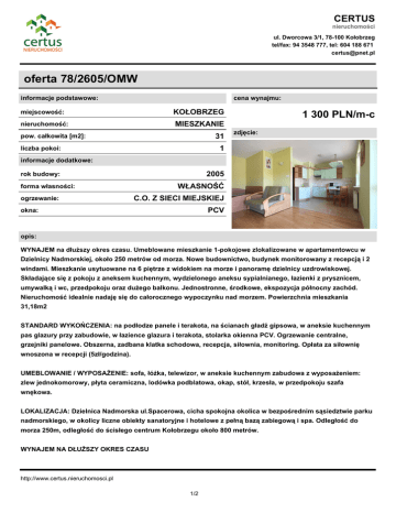 CERTUS nieruchomości ul. Dworcowa 3/1, 78-100 Kołobrzeg tel/fax: 94 3548 777, tel: 604 188 671 [email protected] oferta 78/2605/OMW informacje podstawowe: cena wynajmu: miejscowość: KOŁOBRZEG nieruchomość: MIESZKANIE 31 pow. całkowita [m2]: 1 300 PLN/m-c zdjęcie: 1 liczba pokoi: informacje dodatkowe: 2005 rok budowy: WŁASNOŚĆ forma własności: ogrzewanie: C.O. Z SIECI MIEJSKIEJ PCV okna: opis: WYNAJEM na dłuższy okres czasu. Umeblowane mieszkanie 1-pokojowe zlokalizowane w apartamentowcu w Dzielnicy Nadmorskiej, około 250 metrów od morza. Nowe budownictwo, budynek monitorowany z recepcją i 2 windami. Mieszkanie usytuowane na 6 piętrze z widokiem na morze i panoramę dzielnicy uzdrowiskowej. Składające się z pokoju z aneksem kuchennym, wydzielonego aneksu sypialnianego, łazienki z prysznicem, umywalką i wc, przedpokoju oraz dużego balkonu. Jednostronne, środkowe, ekspozycja północny zachód. Nieruchomość idealnie nadaję się do całorocznego wypoczynku nad morzem. Powierzchnia mieszkania 31,18m2 STANDARD WYKOŃCZENIA: na podłodze panele i terakota, na ścianach gładź gipsowa, w aneksie kuchennym pas glazury przy zabudowie, w łazience glazura i terakota, stolarka okienna PCV. Ogrzewanie centralne, grzejniki panelowe. Obszerna, zadbana klatka schodowa, recepcja, siłownia, monitoring. Opłata za siłownię wnoszona w recepcji (5zł/godzina). UMEBLOWANIE / WYPOSAŻENIE: sofa, łóżka, telewizor, w aneksie kuchennym zabudowa z wyposażeniem: zlew jednokomorowy, płyta ceramiczna, lodówka podblatowa, okap, stół, krzesła, w przedpokoju szafa wnękowa. LOKALIZACJA: Dzielnica Nadmorska ul.Spacerowa, cicha spokojna okolica w bezpośrednim sąsiedztwie parku nadmorskiego, w okolicy liczne obiekty sanatoryjne i hotelowe z pełną bazą zabiegową i spa. Odległość do morza 250m, odległość do ścisłego centrum Kołobrzegu około 800 metrów. WYNAJEM NA DŁUŻSZY OKRES CZASU http://www.certus.nieruchomosci.pl 1/2 CERTUS nieruchomości ul. Dworcowa 3/1, 78-100 Kołobrzeg tel/fax: 94 3548 777, tel: 604 188 671 [email protected] CZYNSZ NAJMU: 1.300zł/m-cznie + opłaty (czynsz adm.173zł, prąd wg. zużycia), 2-miesięczna kaucja. W celu uzyskania szczegółowych informacji o ofercie prosimy o kontakt telefoniczny, bądź mailowy http://www.certus.nieruchomosci.pl 2/2