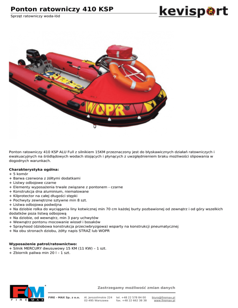 Ponton ratowniczy 410 KSP Sprzęt ratowniczy woda-lód Ponton ratowniczy 410 KSP ALU Full z silnikiem 15KM przeznaczony jest do błyskawicznych działań ratowniczych i ewakuacyjnych na śródlądowych wodach stojących i płynących z uwzględnieniem braku możliwości slipowania w dogodnych warunkach. Charakterystyka ogólna: + 5 komór + Barwa czerwona z żółtymi dodatkami + Listwy odbojowe czarne + Elementy wyposażenia trwale związane z pontonem - czarne + Konstrukcja dna aluminium, niemalowane + Kilprotector na całej długości stępki + Pochwyty zewnętrzne sztywne min 8 szt. + Listwa odbojowa podwójna + Na dziobie rolka do wyciągania liny kotwicznej min 70 cm każdej burty pozbawionej od zewnątrz i od góry wszelkich dodatków poza listwą odbojową + Na dziobie, od wewnątrz, min 3 pary uchwytów + Wewnątrz pontonu mocowanie wioseł i bosaków + Sprayhood (dziobowa konstrukcja przeciwbryzgowa) wsparty na konstrukcji pneumatycznej + Na obu stronach dziobu, żółty napis STRAŻ lub WOPR Wyposażenie patrol/ratownictwo: + Silnik MERCURY dwusuwowy 15 KM (11 KW) – 1 szt. + Zbiornik paliwa min 20 l – 1 szt. Zastrzegamy możliwość zmian danych FIRE - MAX Sp. z o.o. Al. Jerozolimskie 224 02-495 Warszawa tel. +48 22 578 84 00 fax. +48 22 662 38 38 [email protected] www.firemax.pl Ponton ratowniczy 410 KSP Sprzęt ratowniczy woda-lód + + + + + + + + + + + + Linia paliwowa - kpl. Stanowisko sternika z konsolą – kpl. Kierownica z przekładnią i sterociągiem – kpl. Manetka z cięgłami – kpl. Koło ratunkowe – 1 szt. Boja SP – 1 szt. Deska ortopedyczna ze stabilizacją głowy i pięcioma pasami - 1 kpl. Bosak dł. min 200 cm – 2 szt. Wiosła, dulki, gniazda dulek - min 2 kpl. Zasobniki na sprzęt ratownika min 6 l – 2 szt. Pokrowiec – 1 szt. Pompka i zestaw naprawczy – kpl. Zastrzegamy możliwość zmian danych FIRE - MAX Sp. z o.o. Al. Jerozolimskie 224 02-495 Warszawa tel. +48 22 578 84 00 fax. +48 22 662 38 38 [email protected] www.firemax.pl Ponton ratowniczy 410 KSP Sprzęt ratowniczy woda-lód Dane techniczne Waga w wersji z wyposażeniem seryjnym, bez paliwa: 155 kg Wymiary: dł. 410 cm, szer. 180 cm Zastrzegamy możliwość zmian danych FIRE - MAX Sp. z o.o. Al. Jerozolimskie 224 02-495 Warszawa tel. +48 22 578 84 00 fax. +48 22 662 38 38 [email protected] www.firemax.pl