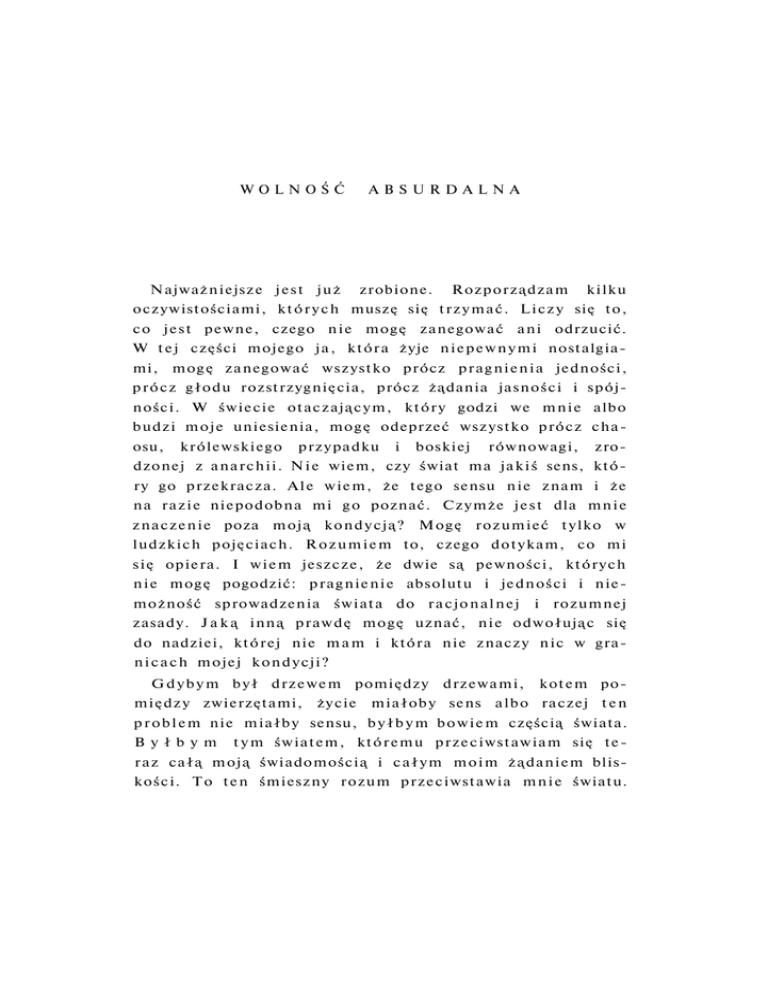 WOLNOŚĆ Najważniejsze jest już ABSURDALNA zrobione. Rozporządzam kilku o c z y w i s t o ś c i a m i , k t ó r y c h muszę się t r z y m a ć . L i c z y się t o , c o j e s t p e w n e , czego n i e m o g ę z a n e g o w a ć a n i odrzucić. W t e j części m o j e g o j a , k t ó r a żyje n i e p e w n y m i nostalgia mi, m o g ę z a n e g o w a ć w s z y s t k o prócz p r a g n i e n i a j e d n o ś c i , p r ó c z g ł o d u r o z s t r z y g n i ę c i a , prócz żądania j a s n o ś c i i s p ó j n o ś c i . W ś w i e c i e o t a c z a j ą c y m , k t ó r y godzi w e m n i e a l b o b u d z i m o j e uniesienia, m o g ę odeprzeć w s z y s t k o p r ó c z c h a osu, królewskiego przypadku i boskiej równowagi, zro d z o n e j z a n a r c h i i . N i e w i e m , czy ś w i a t m a j a k i ś sens, k t ó ry go p r z e k r a c z a . A l e w i e m , że t e g o sensu n i e z n a m i że n a r a z i e n i e p o d o b n a m i g o poznać. C z y m ż e j e s t dla m n i e z n a c z e n i e poza m o j ą k o n d y c j ą ? Mogę rozumieć tylko w l u d z k i c h p o j ę c i a c h . R o z u m i e m to, czego d o t y k a m , c o m i s i ę o p i e r a . I w i e m j e s z c z e , że dwie są p e w n o ś c i , k t ó r y c h n i e m o g ę pogodzić: p r a g n i e n i e a b s o l u t u i j e d n o ś c i i n i e możność sprowadzenia ś w i a t a do r a c j o n a l n e j i rozumnej z a s a d y . J a k ą i n n ą p r a w d ę m o g ę uznać, n i e o d w o ł u j ą c się do nadziei, k t ó r e j n i e m a m i k t ó r a n i e z n a c z y n i c w gra nicach mojej kondycji? G d y b y m b y ł d r z e w e m pomiędzy m i ę d z y zwierzętami, życie drzewami, miałoby sens k o t e m po albo raczej ten p r o b l e m n i e m i a ł b y sensu, b y ł b y m b o w i e m częścią ś w i a t a . B y ł b y m t y m ś w i a t e m , k t ó r e m u p r z e c i w s t a w i a m się t e r a z c a ł ą m o j ą ś w i a d o m o ś c i ą i c a ł y m m o i m ż ą d a n i e m blis kości. To ten śmieszny rozum przeciwstawia m n i e światu. Nie mogę go zanegować j e d n y m pociągnięciem pióra. M u szę w i ę c z a c h o w a ć to, co uważam za p r a w d z i w e . I na c z y m w s p i e r a się t e n k o n f l i k t pomiędzy ś w i a t e m a m o i m umysłem, jeśli nie na mojej świadomości? J e ś l i więc m a m g o z a c h o w a ć , t o t y l k o dzięki ś w i a d o m o ś c i ciągłej, wciąż o d n a w i a n e j , wciąż n a p i ę t e j . Oto, c o n a r a z i e m u s z ę zapa m i ę t a ć . W t y m m o m e n c i e absurd, t a k o c z y w i s t y i t a k trud no osiągalny, powraca do życia człowieka i odnajduje s w o j ą ojczyznę. W t y m m o m e n c i e r ó w n i e ż u m y s ł może po rzucić jałową i wyschniętą drogę przenikliwego wysiłku. Ta d r o g a o t w i e r a się t e r a z n a ż y c i e codzienne. O d n a j d u j e ś w i a t a n o n i m o w e g o „ s i ę " , a l e c z ł o w i e k w k r a c z a d o n i e g o z e swo i m b u n t e m i j a s n o ś c i ą widzenia. Oduczył się nadziei. T o piekło teraźniejszości j e s t wreszcie jego królestwem. Wszy stkim problemom abstrakcyjna przywrócona cofa się Konflikty, duchowe przed jest ostrość. liryzmem ucieleśniają się i Oczywistość form i kolorów. znajdują nędzne i wspaniałe schronienie w sercu człowieka. Żaden z nich n i e j e s t rozstrzygnięty. A l e w s z y s t k i e p r z e k s z t a ł c o n e . Czy c z ł o w i e k u m r z e , w y m k n i e się s k o k i e m , o d b u d u j e d o m idei i f o r m na s w o j ą m i a r ę ? Czy, na odwrót, będzie n a d a l pod trzymywał rozdzierający Uczyńmy jeszcze jeden i cudowny wysiłek i zakład absurdu? wyciągnijmy wszystkie Wnioski. C i a ł o , czułość, twórczość, czyn, s z l a c h e t n o ś ć ludz ka zajmą wówczas n a p o w r ó t s w o j e m i e j s c e w t y m bez s e n s o w n y m ś w i e c i e . I c z ł o w i e k odnajdzie w n i m w r e s z c i e wino absurdu i chleb obojętności, którymi żywi swoją wielkość. P o ł ó ż m y a k c e n t na m e t o d z i e : chodzi o upór. W p e w n y m p u n k c i e s w o j e j drogi c z ł o w i e k a b s u r d a l n y s t a j e się przed m i o t e m zabiegów. H i s t o r i i n i e z b y w a a n i n a r e l i g i a c h , a n i n a p r o r o k a c h , n a w e t b e z bogów. Żądają od niego skoku. M o ż e t y l k o odpowiedzieć, ż e n i e c a ł k i e m r o z u m i e , ż e n i e j e s t t o oczywiste. C h c e r o b i ć j e d y n i e to, c o r o z u m i e d o b r z e . Z a p e w n i a j ą go, ż e t o g r z e c h p y c h y , a l e n i e r o z u m i e pojęcia grzechu; że może piekło j e s t u końca, ale nie ma dość w y o b r a ź n i , b y u j r z e ć t ę osobliwą przyszłość; ż e t r a c i ż y c i e n i e ś m i e r t e l n e , a l e t o wydaje, m u się b ł a h e . C h c i a - n o by, b y u z n a ł s w o j ą w i n ę ; a l e o n c z u j e się n i e w i n n y . Prawdę mówiąc niewinność. To tylko to czuje — swoją nieodwracalną: ona p o z w a l a m u n a w s z y s t k o . żąda o d siebie, b y u m i a ł ż y ć jedynie T a k więc z tym, c o wie, r a d z i ł sobie z t y m , co j e s t , i n i e o d w o ł y w a ł się do n i c z e go, co n i e p e w n e . O d p o w i a d a j ą mu, że n i c n i e j e s t p e w n e . A l e to przynajmniej jest pewnością. Z nią ma sprawę: chce w i e d z i e ć , czy m o ż n a ż y ć n i e s z u k a j ą c o d w o ł a n i a . Mogę teraz przejść do pojęcia samobójstwa. J a s n e było dotąd, j a k i m j e s t r o d z a j e m rozwiązania. T u p r o b l e m zo s t a n i e o d w r ó c o n y . P r z e d t e m chodziło o to, by wiedzieć, c z y ż y c i e m u s i m i e ć sens, żeby j e p r z e ż y ć . T u n a o d w r ó t : t y m lepiej p r z e ż y j e s i ę życie, i m m n i e j b ę d z i e ono m i a ł o sensu. P r z e ż y ć j a k i e ś doświadcze