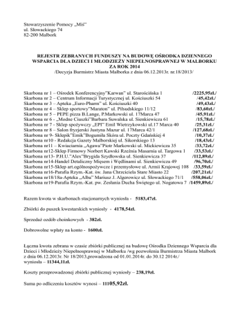 Stowarzyszenie Pomocy „Miś” ul. Słowackiego 74 82-200 Malbork REJESTR ZEBRANYCH FUNDUSZY NA BUDOWĘ OŚRODKA DZIENNEGO WSPARCIA DLA DZIECI I MŁODZIEŻY NIEPEŁNOSPRAWNEJ W MALBORKU ZA ROK 2014 /Decyzja Burmistrz Miasta Malborka z dnia 06.12.2013r. nr.18/2013/ Skarbona nr 1 – Ośrodek Konferencyjny”Karwan” ul. Starościńska 1 /2225,95zł./ Skarbona nr 2 – Centrum Informacji Turystycznej ul. Kościuszki 54 /45,42zł./ Skarbona nr 3 – Apteka „Euro-Pharm” ul. Kościuszki 40 /49,43zł./ Skarbona nr 4 – Sklep sportowy”Maraton” ul. Piłsudskiego 11/12 /83,60zł./ Skarbona nr 5 – PEPE pizza B.Lange, P.Markowski ul. 17Marca 47 /45,91zł./ Skarbona nr 6 - „Modne Ciuszki”Barbara Suwalska ul. Sienkiewicza 61 /15,78zł./ Skarbona nr 7 - Sklep spożywczy „EPI” Emil Wietrzykowski ul.17 Marca 40 /25,31zł./ Skarbona nr 8 – Salon fryzjerski Justyna Mazur ul. 17Marca 42/1 /127,68zł./ Skarbona nr 9- Sklepik”Emik”Bogumiła Skóra ul. Poczty Gdańskiej 4 /10,37zł./ Skarbona nr10 - Redakcja Gazety Malborskiej ul. Sikorskiego 13 /18,43zł./ Skarbona nr11 – Kwiaciarnia „Agawa”Piotr Markowski ul. Mickiewicza 35 /33,72zł./ Skarbona nr12-Sklep Firmowy Norbert Kawski Rzeźnia Masarnia ul. Targowa 1 /33,53zł./ Skarbona nr13- P.H.U.”Alex”Brygida Szydłowska ul. Sienkiewicza 37 /112,89zł./ Skarbona nr14-Handel Detaliczny Mięsem i Wędlinami ul. Sienkiewicza 49 /96,70zł./ Skarbona nr15-Sklep art.ogólnospożywcze i przemysłowe ul. Armii Krajowej 108 /33,59zł./ Skarbona nr16-Parafia Rzym.-Kat. św. Jana Chrzciciela Stare Miasto 22 /207,21zł./ Skarbona nr18/18a-Apteka „Alba” Mariusz J. Algerowicz ul. Słowackiego 71/1 /558,06zł./ Skarbona nr19-Parafia Rzym.-Kat. pw. Zesłania Ducha Świętego ul. Nogatowa 7 /1459,89zł./ Razem kwota w skarbonach stacjonarnych wyniosła - 5183,47zł. Zbiórki do puszek kwestarskich wyniosły - 4178,54zł. Sprzedaż ozdób choinkowych - 382zł. Dobrowolne wpłaty na konto - 1600zł. Łączna kwota zebrana w czasie zbiórki publicznej na budowę Ośrodka Dziennego Wsparcia dla Dzieci i Młodzieży Niepełnosprawnej w Malborku /wg pozwolenia Burmistrza Miasta Malbork z dnia 06.12.2013r. Nr 18/2013,prowadzona od 01.01.2014r. do 30.12 2014r./ wyniosła – 11344,11zł. Koszty przeprowadzonej zbiórki publicznej wyniosły – 238,19zł. Suma po odliczeniu kosztów wynosi – 11105,92zł.