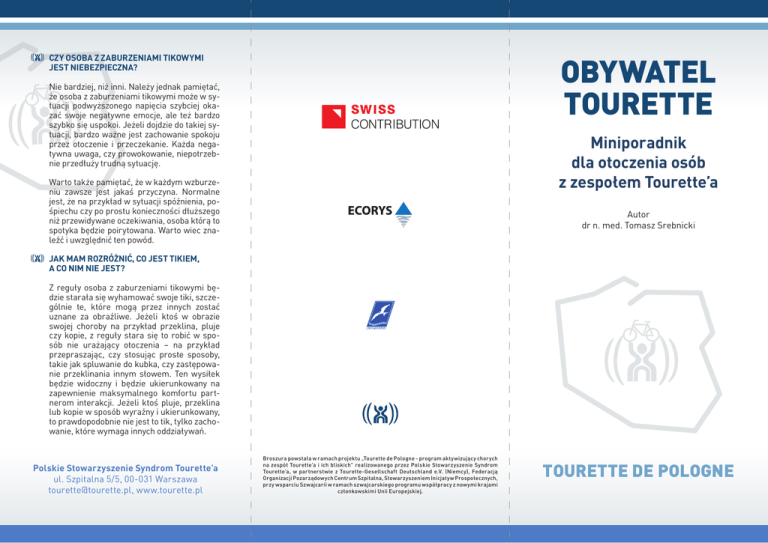 OBYWATEL TOURETTE CZY OSOBA Z ZABURZENIAMI TIKOWYMI JEST NIEBEZPIECZNA? Nie bardziej, niż inni. Należy jednak pamiętać, że osoba z zaburzeniami tikowymi może w sytuacji podwyższonego napięcia szybciej okazać swoje negatywne emocje, ale też bardzo szybko się uspokoi. Jeżeli dojdzie do takiej sytuacji, bardzo ważne jest zachowanie spokoju przez otoczenie i przeczekanie. Każda negatywna uwaga, czy prowokowanie, niepotrzebnie przedłuży trudną sytuację. Miniporadnik dla otoczenia osób z zespołem Tourette’a Warto także pamiętać, że w każdym wzburzeniu zawsze jest jakaś przyczyna. Normalne jest, że na przykład w sytuacji spóźnienia, pośpiechu czy po prostu konieczności dłuższego niż przewidywane oczekiwania, osoba którą to spotyka będzie poirytowana. Warto wiec znaleźć i uwzględnić ten powód. Autor dr n. med. Tomasz Srebnicki JAK MAM ROZRÓŻNIĆ, CO JEST TIKIEM, A CO NIM NIE JEST? Z reguły osoba z zaburzeniami tikowymi będzie starała się wyhamować swoje tiki, szczególnie te, które mogą przez innych zostać uznane za obraźliwe. Jeżeli ktoś w obrazie swojej choroby na przykład przeklina, pluje czy kopie, z reguły stara się to robić w sposób nie urażający otoczenia – na przykład przepraszając, czy stosując proste sposoby, takie jak spluwanie do kubka, czy zastępowanie przeklinania innym słowem. Ten wysiłek będzie widoczny i będzie ukierunkowany na zapewnienie maksymalnego komfortu partnerom interakcji. Jeżeli ktoś pluje, przeklina lub kopie w sposób wyraźny i ukierunkowany, to prawdopodobnie nie jest to tik, tylko zachowanie, które wymaga innych oddziaływań. Polskie Stowarzyszenie Syndrom Tourette’a ul. Szpitalna 5/5, 00-031 Warszawa [email protected], www.tourette.pl Broszura powstała w ramach projektu „Tourette de Pologne - program aktywizujący chorych na zespół Tourette’a i ich bliskich” realizowanego przez Polskie Stowarzyszenie Syndrom Tourette’a, w partnerstwie z Tourette-Gesellschaft Deutschland e.V. (Niemcy), Federacją Organizacji Pozarządowych Centrum Szpitalna, Stowarzyszeniem Inicjatyw Prospołecznych, przy wsparciu Szwajcarii w ramach szwajcarskiego programu współpracy z nowymi krajami członkowskimi Unii Europejskiej. TOURETTE DE POLOGNE CZYM SĄ TIKI? Tiki to nawracające i nagłe skurcze mięśni pozostające poza kontrolą osoby na nie cierpiącej. Rozróżnia się tiki proste takie jak mruganie oczami, pochrząkiwanie, potrząsanie głową oraz złożone, które mogą sprawiać na otoczeniu wrażenie działań celowych takie jak podskakiwanie, dotykanie, wąchanie, kopanie, pogwizdywanie a nawet przeklinanie czy wykonywanie ruchów powszechnie uznanych za obsceniczne (choć zdarza się to dość rzadko). Inny podział tików dzieli je na ruchowe i wokalne, czyli te powiązane z wydawaniem dźwięków. Najcięższą postacią choroby tikowej jest Zespół Gilles de la Touretta. Osoba cierpiąca na to zaburzenie ujawnia zarówno tiki wokalne jak i ruchowe złożone. Początek choroby przypada na wczesny wiek dziecięcy. Wraz z dojrzewaniem nasilenie tików zmniejsza się u większości osób dotkniętych tym zaburzeniem. JAK ZACHOWUJE SIĘ OSOBA CIERPIĄCA NA ZABURZENIA TIKOWE, W TYM ZESPÓŁ GILLES DE LA TOURETTA? Osoby cierpiące na zaburzenia tikowe niezwykle często starają się ukryć swój problem, ponieważ zazwyczaj są w pełni jego świadomi. Niektórzy wypracowują różne sposoby na to, aby były one jak najmniej widoczne dla otoczenia. Warto jednak pamiętać, że długotrwała obecność tików powoduje także „przyzwyczajenie się” do nich i po prostu niezauważanie momentu, w którym się pojawiają. Zdarzają się przypadki, w których nasilenie tików jest tak duże, że trudno pozostać niewidocznym dla otoczenia. Z tego powodu niezwykle ważne jest odpowiednie podejście i zrozumienie w kontakcie z osobą dotkniętą tym zaburzeniem. Co istotne, nasilenie tików bardzo często powiązane jest z napięciem, którego przyczyną może być proste zdenerwowanie, czy stres wywołany przez czynniki zewnętrzne. Inaczej mówiąc, im więcej uwagi poświęca się tikom, tym większe prawdopodobieństwo ich nasilenia. Zdenerwowane osoby bez tików pocą się, krzyczą, czy czerwienią. U osoby z tikami dodatkowo zwiększy się ich nasilenie. Przyczyny tików nie są do końca rozpoznane, choć dużą rolę przypisuje się czynnikom genetycznym oraz zaburzeniom komunikacji niektórych obszarów mózgu. CZY MOŻNA PYTAĆ O TO, CZY KTOŚ MA TIKI? Elementem radzenia sobie z tikami jest informowanie otoczenia o swoim problemie. Jednak podobnie jak wszyscy inni, także osoby z tikami, mogą mieć z tym problem z powodu skrępowania lub po prostu dlatego, że obecność tików w niczym im nie przeszkadza. Nieraz jednak w celu „oczyszczenia” atmosfery warto zapytać, czy prezentowane przez daną osobę zachowania przypadkiem nie są spowodowane tikami - wtedy obu stronom rozmowy po prostu będzie łatwiej. CZY TE OSOBY SĄ „NIENORMALNE”? Absolutnie nie. Aby to zrozumieć, warto przytoczyć przykład napadów czkawki, które u większości pojawiają się nagle i najczęściej w najmniej odpowiednim momencie. Obecność czkawki nie zamienia w „nienormalnych”, choć istotnie przyczynia się do tego, że trudniej jest komunikować się z otoczeniem, a otoczeniu trudniej porozumieć się z nami. Czkawka nie minie, kiedy usłyszymy „przestań czkać” lub ktoś wyjdzie z pomieszczenia z powodu odczuwanego dyskomfortu. Podobnie jest z tikami. A zatem można mieć tiki i być grzecznym, dobrze wychowanym, jak i niemiłym lub impertynenckim. Pamiętajmy, że osoby z tikami nie są pozbawione praw obywatelskich ale też, że nie są „zwolnione z życia”. Jeżeli ktoś jest nieuprzejmy i ma tiki, to nie dlatego, że ma tiki, tylko że jest nieuprzejmy. JAK ZACHOWYWAĆ SIĘ W KONTAKCIE Z OSOBĄ Z ZABURZENIAMI TIKOWYMI? Bardzo podobnie jak zachowujemy się w stosunku do 