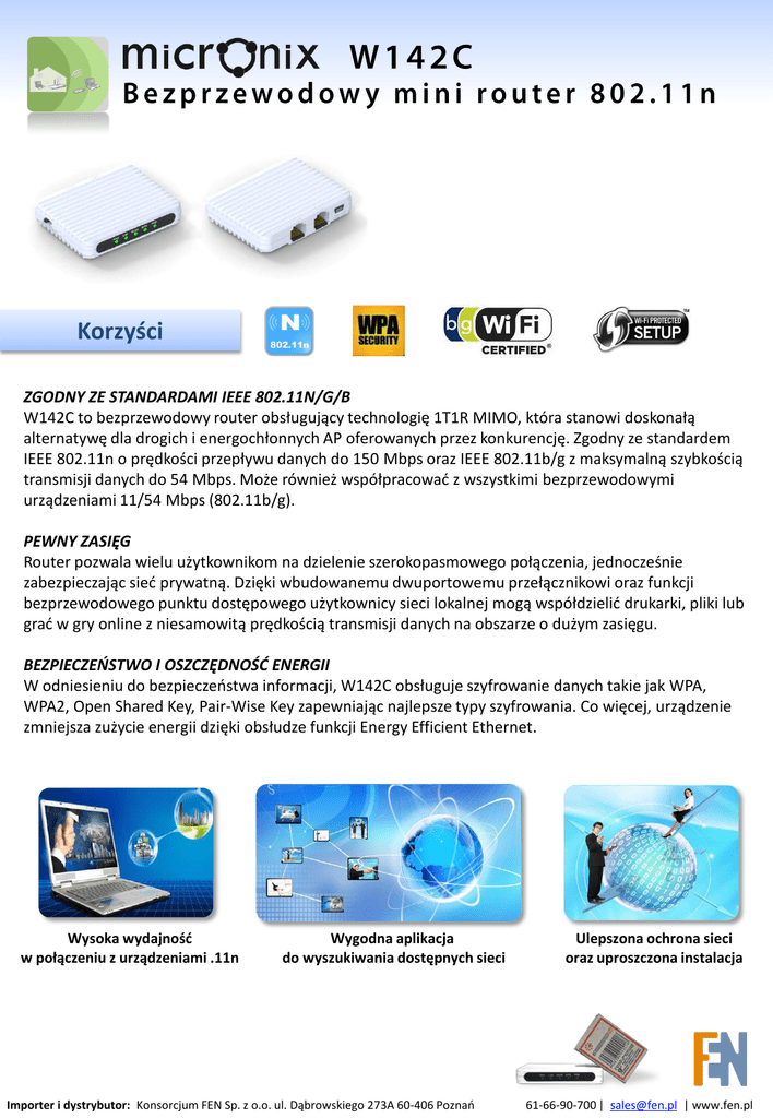 Korzyści ZGODNY ZE STANDARDAMI IEEE 802.11N/G/B W142C to bezprzewodowy router obsługujący technologię 1T1R MIMO, która stanowi doskonałą alternatywę dla drogich i energochłonnych AP oferowanych przez konkurencję. Zgodny ze standardem IEEE 802.11n o prędkości przepływu danych do 150 Mbps oraz IEEE 802.11b/g z maksymalną szybkością transmisji danych do 54 Mbps. Może również współpracować z wszystkimi bezprzewodowymi urządzeniami 11/54 Mbps (802.11b/g). PEWNY ZASIĘG Router pozwala wielu użytkownikom na dzielenie szerokopasmowego połączenia, jednocześnie zabezpieczając sieć prywatną. Dzięki wbudowanemu dwuportowemu przełącznikowi oraz funkcji bezprzewodowego punktu dostępowego użytkownicy sieci lokalnej mogą współdzielić drukarki, pliki lub grać w gry online z niesamowitą prędkością transmisji danych na obszarze o dużym zasięgu. BEZPIECZEŃSTWO I OSZCZĘDNOŚĆ ENERGII W odniesieniu do bezpieczeństwa informacji, W142C obsługuje szyfrowanie danych takie jak WPA, WPA2, Open Shared Key, Pair-Wise Key zapewniając najlepsze typy szyfrowania. Co więcej, urządzenie zmniejsza zużycie energii dzięki obsłudze funkcji Energy Efficient Ethernet. Wysoka wydajność w połączeniu z urządzeniami .11n Wygodna aplikacja do wyszukiwania dostępnych sieci Importer i dystrybutor: Konsorcjum FEN Sp. z o.o. ul. Dąbrowskiego 273A 60-406 Poznań Ulepszona ochrona sieci oraz uproszczona instalacja 61-66-90-700 | [email protected] | www.fen.pl Główne cechy Niewielki rozmiar urządzenia 2 porty 10/100Mbps Ethernet (1 x WAN oraz 1 x LAN) Zgodny ze standardami IEEE 802.11n oraz IEEE802.11b/g Pasmo 2.4GHz oraz 1T1R Szybkość przesyłu danych do 150Mbps Specyfikacja techniczna Obsługa funkcji: auto-MDI/MDI-X, backpressure, flow control Obsługa funkcji klonowania adresu MAC Interfejs IEEE802.3, IEEE 802.3u IEEE802.11b IEEE 802.11g IEEE802.11n IEEE802.1x IEEE802.1p QoS IEEE802.3x Flow Control LAN: 1 port 10/100Mbps RJ-45 WAN: 1 port RJ-45 Obsługa wielu AP (do 4 AP SSIDs) Antena wewnętrzna Obsługa kontroli dostępu IEEE802.1x port-based oraz MAC-based Obsługa opcji uwierzytelniania: WEP, WPA TKIP oraz WPA2 AES PSK Standardy Obsługa funkcji Static IP, DHCP Client, PPPoE, Firewall oraz NAT IP Sharing Obsługa automatycznego wyboru kanału bezprzewodowego Obsługa funkcji WMM oraz WMM-APSD Obsługa WPS dla trybów AP oraz Client Czułość odbioru Kanał Obsługa funkcji statystyk, VPN Pass-through, System Log Przycisk WPS/RESET Przełącznik na obudowie AP/Router/Client Schemat zastosowania Moc nadawania Temperatura Wilgotność Zasięg Wymiary Materiał Certyfikaty Importer i dystrybutor: Konsorcjum FEN Sp. z o.o. ul. Dąbrowskiego 273A 60-406 Poznań 150Mbps Typical-68dBm 54Mbps Typical-73dBm 11Mbps Typical-84dBm USA 11, Europa 13, Japonia 14 16dBm typically @ 802.11b 14dBm typically @ 802.11g 13dBm typically @ 802.11n Praca: 0°C ~ 40°C Przechowywanie: -20°C ~ 70°C Praca: 10% ~ 90% RH, bez kondensacji, Przechowywanie: 5%~90% RH, bez kondensacji wewnątrz: 35~100m zewnątrz: 100~300 m szer. 72mm | gł. 56 mm | wys. 14 mm Tworzywo sztuczne FCC, CE, VCCI Class B 61-66-90-700 | [email protected] | www.fen.pl