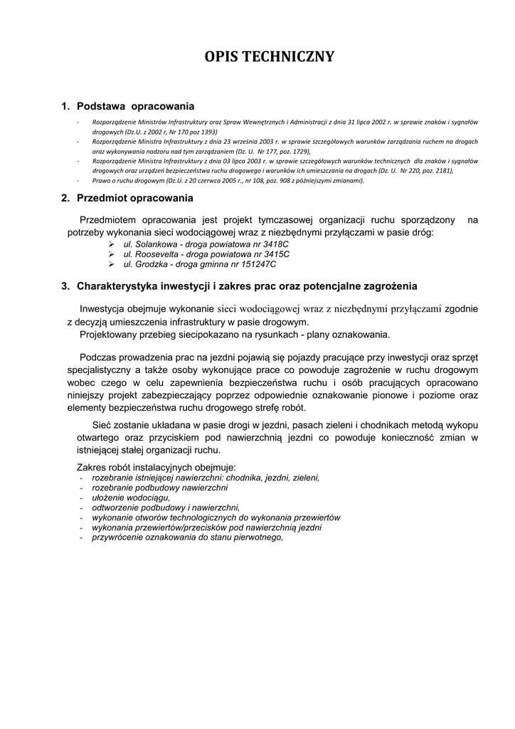 OPIS TECHNICZNY 1. Podstawa opracowania - Rozporządzenie Ministrów Infrastruktury oraz Spraw Wewnętrznych i Administracji z dnia 31 lipca 2002 r. w sprawie znaków i sygnałów drogowych (Dz.U. z 2002 r, Nr 170 poz 1393) Rozporządzenie Ministra Infrastruktury z dnia 23 września 2003 r. w sprawie szczegółowych warunków zarządzania ruchem na drogach oraz wykonywania nadzoru nad tym zarządzaniem (Dz. U. Nr 177, poz. 1729), Rozporządzenie Ministra Infrastruktury z dnia 03 lipca 2003 r. w sprawie szczegółowych warunków technicznych dla znaków i sygnałów drogowych oraz urządzeń bezpieczeństwa ruchu drogowego i warunków ich umieszczania na drogach (Dz. U. Nr 220, poz. 2181), Prawo o ruchu drogowym (Dz.U. z 20 czerwca 2005 r., nr 108, poz. 908 z późniejszymi zmianami). - 2. Przedmiot opracowania Przedmiotem opracowania jest projekt tymczasowej organizacji ruchu sporządzony potrzeby wykonania sieci wodociągowej wraz z niezbędnymi przyłączami w pasie dróg: na ul. Solankowa - droga powiatowa nr 3418C ul. Roosevelta - droga powiatowa nr 3415C ul. Grodzka - droga gminna nr 151247C 3. Charakterystyka inwestycji i zakres prac oraz potencjalne zagrożenia Inwestycja obejmuje wykonanie sieci wodociągowej wraz z niezbędnymi przyłączami zgodnie z decyzją umieszczenia infrastruktury w pasie drogowym. Projektowany przebieg siecipokazano na rysunkach - plany oznakowania. Podczas prowadzenia prac na jezdni pojawią się pojazdy pracujące przy inwestycji oraz sprzęt specjalistyczny a także osoby wykonujące prace co powoduje zagrożenie w ruchu drogowym wobec czego w celu zapewnienia bezpieczeństwa ruchu i osób pracujących opracowano niniejszy projekt zabezpieczający poprzez odpowiednie oznakowanie pionowe i poziome oraz elementy bezpieczeństwa ruchu drogowego strefę robót. Sieć zostanie układana w pasie drogi w jezdni, pasach zieleni i chodnikach metodą wykopu otwartego oraz przyciskiem pod nawierzchnią jezdni co powoduje konieczność zmian w istniejącej stałej organizacji ruchu. Zakres robót instalacyjnych obejmuje: - rozebranie istniejącej nawierzchni: chodnika, jezdni, zieleni, rozebranie podbudowy nawierzchni ułożenie wodociągu, odtworzenie podbudowy i nawierzchni, wykonanie otworów technologicznych do wykonania przewiertów wykonania przewiertów/przecisków pod nawierzchnią jezdni przywrócenie oznakowania do stanu pierwotnego, 4. Stan istniejący-opis drogi i ruchu Obszar inwestycji obejmuje drogi gminne i powiatowe zlokalizowane w obszarze zabudowanym w granicach administracyjnych miasta Inowrocław. ul. Solankowa - droga powiatowa nr 3418C Ulica posiada jezdnię o nawierzchni bitumicznej szerokości zgodnie z wymiarami na planach oznakowania z obustronnymi chodnikami oddzielonymi od jezdni lokalnie krawężnikiem i terenem zielonym. Ulica ta charakteryzuje się dużymi natężeniami ruchu kołowego o charakterze tranzytowym (niewielka ilość punktów ruchu docelowego na przedmiotowym odcinku drogi) przy niewielkim udziale pojazdów ciężarowych. Po stronie lewej wyznaczono pas postojowy oznakowaniem poziomym i pionowym. ul. Roosevelta - droga powiatowa nr 3415C Ulica posiada dwie jezdnię o nawierzchni bitumicznej szerokości zgodnie z wymiarami na planach oznakowania z obustronnymi chodnikami oddzielonymi od jezdni lokalnie krawężnikiem i terenem zielonym. Ulica ta charakteryzuje się dużymi natężeniami ruchu kołowego o charakterze tranzytowym przy znaczącym udziale pojazdów ciężarowych. ul. Grodzka - droga gminna nr 151247C Ulica posiada jezdnię o nawierzchni bitumicznej szerokości zgodnie z wymiarami na planach oznakowania z obustronnymi chodnikami oddzielonymi od jezdni lokalnie krawężnikiem i terenem zielonym. Ulica ta charakteryzuje się niewielkimi natężeniami ruchu kołowego o charakterze tranzytowym przy znikomym udziale pojazdów ciężarowych. Przedmiotowy odcinek drogi znajduje się w strefie płatnego parkowania i posiada wyznaczone pasy postojowe za pomocą oznakowania poziomego i pionowego Ul. Roosevelta jest ulicą nadrzędną w stosunku do ulicySolankowej. Natomiast ulica Grodzka jest ulica jednokierunkowa na którą następuje wjazd od strony ul. Solankowej Ulica Solankowa tworzy skrzyżowanie z ul. Roosevelta o ograniczonych relacjach ruchowych (brak możliwości kierunku na wprost. Istniejące oznakowanie poziome i pionowe zostało przedstawione na planach oznakowania. UWAGA: Z uwagi na zachowanie czytelności planów oznakowania nie nasiono na oznakowania U-3c/d na skrzyżowaniu ul. Solankowej z Roosevelta na wysokości istniejących donic z kwiatami ozdobnymi 5. Projektowana czasowa organizacja ruchu Niniejsze opracowanie zakłada oznakowanie robót w zakresie inwestycji z podziałem na etapy w celu zapewnienia bezpieczeństwa użytkowników dróg oraz osób pracujących przy przebudowie przy jednoczesnym zminimalizowaniu ingerencji w ruch pojazdów i pieszych. Każdy z etapów prac wymaga prawidłowego oznakowania zgodnie z załączonymi planami oznakowania Podział etapów prac wskazano na rysunku nr 2 Wszelkie uwagi przekazane przez zarządców dróg oraz zarządców ruchu należy uwzględnić i wprowadzić na etapie wykonawstwa Założenia ogólne do projektu: o o o o o o dopuszcza się zmianę kolejności wykonywania etapów prac w zależności od przyjętego przez wykonawcę harmonogramu prac pojazdy prowadzące roboty przy drogach w "godzinach szczytu" nie mogą zajmować powierzchni większej niż wskazana na planach dla danego etapu prac. Poza "godzinami szczytu" pojazdy te mogą zająć na krótki okres czasu (np. w celu załadunku bądź rozładunku materiałów, itp.) większą powierzchnię niż wyznaczona w planach oznakowania winny być pod nadzorem osób uprawnionych do sterowania ruchem oraz wyposażone w ostrzegawczy sygnał świetlny błyskowy barwy żółtej, widoczny od strony nadjeżdżających pojazdów z odległości co najmniej 500 m, przy dobrej przejrzystości powietrza. urządz