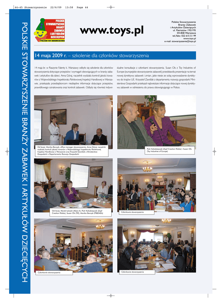 44-45 Stowarzyszenie 22/6/09 13:58 Page 44 POLSKIE STOWARZYSZENIE BRAN˚Y ZABAWEK I ARTYKU¸ÓW DZIECI¢CYCH Polskie Stowarzyszenie Bran˝y Zabawek i Artyku∏ów Dzieci´cych ul. Patriotów 193/195 04-858 Warszawa tel./faks: 022 615 51 99 www.toys.pl e-mail: [email protected] www.toys.pl 14 maja 2009 r. – szkolenie dla cz∏onków stowarzyszenia 14 maja br. w Raszynie Falenty k. Warszawy odby∏o si´ szkolenie dla cz∏onków stowarzyszenia dotyczàce przepisów i wymagaƒ obowiàzujàcych w bran˝y zabawek i artyku∏ów dla dzieci. Anna Góraj, naczelnik wydzia∏u kontroli jakoÊci towarów z Wojewódzkiego Inspektoratu Paƒstwowej Inspekcji Handlowej w Warszawie, przekaza∏a przedsi´biorcom niezb´dne informacje dotyczàce przepisów, prawid∏owego oznakowania oraz kontroli zabawek. Odby∏y si´ równie˝ indywi- dualne konsultacje z cz∏onkami stowarzyszenia. Susan Ols z Toy Industries of Europe (europejskie stowarzyszenie zabawek) przedstawi∏a prezentacje na temat nowej dyrektywy zabawek i zmian, jakie niesie ze sobà wprowadzenie dyrektywy do krajów UE. Krzysztof ZawiÊlak z departamentu rozwoju gospodarki Ministerstwa Gospodarki przekaza∏ najÊwie˝sze informacje dotyczàce nowej dyrektywy zabawek w odniesieniu do prawa obowiàzujàcego w Polsce. Od lewej: Monika Barczyk, office manager stowarzyszenia, Anna Góraj, naczelnik wydzia∏u kontroli jakoÊci towarów z Wojewódzkiego Inspektoratu Paƒstwowej Inspekcji Handlowej w Warszawie oraz Krzysztof ZawiÊlak z Ministerstwa Gospodarki z Departamentu Rozwoju Gospodarki Od lewej: Marek ¸ukasik (Alexis II), Piotr Ko∏odziejczak (Zapf Creation Polska), Susan Ols (TIE), Monika Barczyk (PSBZiADz) Cz∏onkowie stowarzyszenia Piotr Ko∏odziejczak (Zapf Creation Polska) i Susan Ols (Toy Industries of Europe) Cz∏onkowie stowarzyszenia Cz∏onkowie stowarzyszenia 44-45 Stowarzyszenie 22/6/09 Page 45 www.toys.pl Marek ¸ukasik (Alexis II) Obrady zarzàdu i rady nadzorczej stowarzyszenia G∏osowanie cz∏onków stowarzyszenia Cz∏onkowie stowarzyszenia 14 maja 2009 r. - VIII zwyczajne walne zgromadzenie cz∏onków stowarzyszenia 14 maja br. w Raszynie Falenty k. Warszawy odby∏o si´ VIII zwyczajne walne zgromadzenie cz∏onków. Mia∏o ono charakter wyborczy i sprawozdawczy. Podczas walnego zgromadzenia zosta∏y wybrane nowe w∏adze. Sk∏ad nowej rady nadzorczej stowarzyszenia: Marcin Woêniak – przewodniczàcy rady nadzorczej; Zbigniew Kowalski – wiceprzewodniczàcy rady nadzorczej; Krzysztof Piwko – cz∏onek rady nadzorczej. Sk∏ad nowego zarzàdu stowarzyszenia: Monika Barczyk – prezes zarzàdu; Marek ¸ukasik – wiceprezes zarzàdu; Pawe∏ Go∏da – cz∏onek zarzàdu. Siedziba biura stowarzyszenia i wszystkie dane kontaktowe pozostajà bez zmian. Robert PodleÊ (Cobi SA) Cz∏onkowie stowarzyszenia POLSKIE STOWARZYSZENIE BRAN˚Y ZABAWEK I ARTYKU¸ÓW DZIECI¢CYCH Polskie Stowarzyszenie Bran˝y Zabawek i Artyku∏ów Dzieci´cych ul. Patriotów 193/195 04-858 Warszawa tel./faks: 022 615 51 99 www.toys.pl e-mail: [email protected] 14:00
