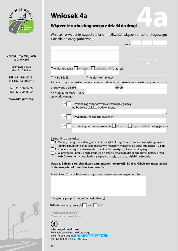 4a Zarząd Dróg Miejskich w Gliwicach Wniosek 4a Włączenie ruchu drogowego z działki do drogi Wniosek o wydanie uzgodnienia o możliwości włączenia ruchu drogowego z działki do drogi publicznej. dnia 1234567890 31 30 29 28 27 26 25 24 23 22 21 20 19 18 17 16 15 14 13 12 11 Zarząd Dróg Miejskich w Gliwicach ul. Płowiecka 31 44-121 Gliwice NIP: 631-244-02-61 REGON: 240009251 tel. (32) 300-86-00 fax (32) 300-86-99 www.zdm.gliwice.pl ¯ 1234567890 12 11 ¯ 2020 2019 2018 2017 2016 2015 2014 2013 2012 pole do dyspozycji ZDM (wnioskodawca: inwestor / (NIP / PESEL) pełnomocnik*), (adres) (telefon kontaktowy) Zwracam się z wnioskiem o wydanie uzgodnienia w zakresie możliwości włączenia ruchu drogowego z działki obręb do drogi publicznej – ulicy spowodowanego: 1.** – zmianą zagospodarowania terenu polegającą na budowie obiektu budowlanego: 2.** – wykonaniu robót budowlanych: 3.** – zmianą sposobu użytkowania , obiektu / , części obiektu* polegającą na: Załączniki do wniosku: 1. Mapa sytuacyjno-ewidencyjna z naniesioną lokalizacją działki, proponowaną trasą dojazdu do drogi publicznej oraz proponowanym miejscem włączenia do drogi publicznej − 2 egz. 2. Koncepcja zagospodarowania działki, opis inwestycji, bilans parkingowy. 3. W przypadku braku bezpośredniego dostępu działki do drogi publicznej należy przedłożyć dokumenty potwierdzające prawo przejazdu przez działki pośrednie. Uwaga. Zależnie od charakteru zamierzonej inwestycji, ZDM w Gliwicach może żądać dodatkowych dokumentów i materiałów. Prawidłowość danych na wniosku potwierdzam własnoręcznym podpisem: (czytelny podpis i pieczęć wnioskodawcy) Odbiór osobisty decyzji: tak / nie* * niepotrzebne skreślić ** zaznaczyć prawidłowe i Informacje kontaktowe: Referat Inżynierii ruchu drogowego pokój nr 204, 206 II PIĘTRO – STREFA NIEBIESKA tel. (32) 300-86-72, (32) 300-86-68 15.v3 4a Zarząd Dróg Miejskich w Gliwicach JAK ZAŁATWIĆ SPRAWĘ 1. O czym należy wiedzieć: – każde włączenie działki do drogi publicznej wymaga uzgodnienia z ZDM w Gliwicach, – w celu uzgodnienia możliwości włączenia ruchu drogowego z terenu planowanej inwestycji do drogi publicznej należy złożyć wniosek 4a. Zarząd Dróg Miejskich w Gliwicach ul. Płowiecka 31 44-121 Gliwice NIP: 631-244-02-61 REGON: 240009251 tel. (32) 300-86-00 fax (32) 300-86-99 www.zdm.gliwice.pl 2. Jak i gdzie załatwić sprawę: – wypełniony wniosek należy złożyć w ZDM w Gliwicach lub przesłać pocztą, – wniosek składa wnioskodawca, inwestor lub pełnomocnik, – odpowiedź na wniosku zostaje wysłana pocztą (na wniosku jest możliwość zaznaczenia odbioru osobistego), – informacji udziela: Referat Inżynierii ruchu drogowego: Barbara Durczok – Główny Specjalista pokój nr 204 II PIĘTRO – STREFA NIEBIESKA tel. (32) 300-86-68 Michał Działach – Podinspektor pokój nr 206 II PIĘTRO – STREFA NIEBIESKA tel. (32) 300-86-72 3. Załączniki: – mapa sytuacyjno-ewidencyjna z naniesioną lokalizacją działki, proponowaną trasą dojazdu do drogi publicznej oraz proponowanym miejscem włączenia do drogi publicznej − 2 egz., – koncepcja zagospodarowania działki, opis inwestycji, bilans parkingowy, – w przypadku braku bezpośredniego dostępu działki do drogi publicznej należy przedłożyć dokumenty potwierdzające prawo przejazdu przez działki pośrednie. 4. Opłaty: – wydana w drugim etapie zgoda na lokalizację zjazdu podlega opłacie skarbowej w wysokości 82 zł płatne z chwilą złożenia wniosku na konto Urzędu Miejskiego w Gliwicach: ING 51 1050 0099 5261 0410 0000 0055, – za zajęcie pasa ruchu drogowego naliczane są opłaty zgodnie z obowiązującymi Uchwałami, – gdy wniosek składa pełnomocnik należy dołączyć pełnomocnictwo w oryginale lub urzędowo poświadczony odpis pełnomocnictwa i opłatę skarbową w wysokości 17 zł. Opłaty skarbowe należy wpłacić na konto Urzędu Miejskiego w Gliwicach: ING 51 1050 0099 5261 0410 0000 0055 lub w kasie Urzędu Miejskiego w Gliwicach (art. 1 ust. 1 pkt. 2 ustawy o opłacie skarbowej z dnia 16.11.2006 r. Dz.U. z 2006 r. Nr 225 poz.1635).
