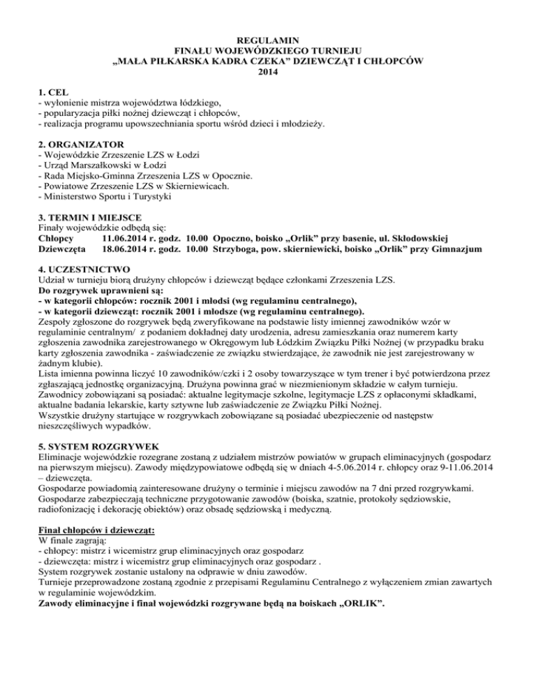 REGULAMIN FINAŁU WOJEWÓDZKIEGO TURNIEJU „MAŁA PIŁKARSKA KADRA CZEKA” DZIEWCZĄT I CHŁOPCÓW 2014 1. CEL - wyłonienie mistrza województwa łódzkiego, - popularyzacja piłki noŜnej dziewcząt i chłopców, - realizacja programu upowszechniania sportu wśród dzieci i młodzieŜy. 2. ORGANIZATOR - Wojewódzkie Zrzeszenie LZS w Łodzi - Urząd Marszałkowski w Łodzi - Rada Miejsko-Gminna Zrzeszenia LZS w Opocznie. - Powiatowe Zrzeszenie LZS w Skierniewicach. - Ministerstwo Sportu i Turystyki 3. TERMIN I MIEJSCE Finały wojewódzkie odbędą się: Chłopcy 11.06.2014 r. godz. 10.00 Opoczno, boisko „Orlik” przy basenie, ul. Skłodowskiej Dziewczęta 18.06.2014 r. godz. 10.00 Strzyboga, pow. skierniewicki, boisko „Orlik” przy Gimnazjum 4. UCZESTNICTWO Udział w turnieju biorą druŜyny chłopców i dziewcząt będące członkami Zrzeszenia LZS. Do rozgrywek uprawnieni są: - w kategorii chłopców: rocznik 2001 i młodsi (wg regulaminu centralnego), - w kategorii dziewcząt: rocznik 2001 i młodsze (wg regulaminu centralnego). Zespoły zgłoszone do rozgrywek będą zweryfikowane na podstawie listy imiennej zawodników wzór w regulaminie centralnym/ z podaniem dokładnej daty urodzenia, adresu zamieszkania oraz numerem karty zgłoszenia zawodnika zarejestrowanego w Okręgowym lub Łódzkim Związku Piłki NoŜnej (w przypadku braku karty zgłoszenia zawodnika - zaświadczenie ze związku stwierdzające, Ŝe zawodnik nie jest zarejestrowany w Ŝadnym klubie). Lista imienna powinna liczyć 10 zawodników/czki i 2 osoby towarzyszące w tym trener i być potwierdzona przez zgłaszającą jednostkę organizacyjną. DruŜyna powinna grać w niezmienionym składzie w całym turnieju. Zawodnicy zobowiązani są posiadać: aktualne legitymacje szkolne, legitymacje LZS z opłaconymi składkami, aktualne badania lekarskie, karty sztywne lub zaświadczenie ze Związku Piłki NoŜnej. Wszystkie druŜyny startujące w rozgrywkach zobowiązane są posiadać ubezpieczenie od następstw nieszczęśliwych wypadków. 5. SYSTEM ROZGRYWEK Eliminacje wojewódzkie rozegrane zostaną z udziałem mistrzów powiatów w grupach eliminacyjnych (gospodarz na pierwszym miejscu). Zawody międzypowiatowe odbędą się w dniach 4-5.06.2014 r. chłopcy oraz 9-11.06.2014 – dziewczęta. Gospodarze powiadomią zainteresowane druŜyny o terminie i miejscu zawodów na 7 dni przed rozgrywkami. Gospodarze zabezpieczają techniczne przygotowanie zawodów (boiska, szatnie, protokoły sędziowskie, radiofonizację i dekorację obiektów) oraz obsadę sędziowską i medyczną. Finał chłopców i dziewcząt: W finale zagrają: - chłopcy: mistrz i wicemistrz grup eliminacyjnych oraz gospodarz - dziewczęta: mistrz i wicemistrz grup eliminacyjnych oraz gospodarz . System rozgrywek zostanie ustalony na odprawie w dniu zawodów. Turnieje przeprowadzone zostaną zgodnie z przepisami Regulaminu Centralnego z wyłączeniem zmian zawartych w regulaminie wojewódzkim. Zawody eliminacyjne i finał wojewódzki rozgrywane będą na boiskach „ORLIK”. GRUPY ELIMINACYJNE: CHŁOPCY: grupa 1. Łowicz (Andrzej Myczka tel. 600347215), Kutno, Łęczyca, Rawa Maz., Sieradz, Skierniewice, Zgierz grupa 2. Piotrków Tryb. (Zdzisław Wawrzewski tel. 604526667), Bełchatów, Opoczno, Pajęczno, Radomsko, Wieluń grupa 3. Opoczno – gospodarz (Sławomir Zieliński tel. 512088456) DZIEWCZĘTA: grupa 1. Bełchatów (Szczepan Krajda tel. 669511500), Kutno, Piotrków Tryb., Sieradz, Wieluń. grupa 2. Radomsko (Janusz Kamiński tel. 502111305), Opoczno, Pajęczno, Rawa Maz., Zgierz. grupa 3. Skierniewice – gospodarz (Tadeusz Kruk tel. 607068944) 6. ZASADY FINANSOWANIA - koszty przejazdu, diet jednostki delegujące - koszty organizacyjne pokrywa organizator 7. NAGRODY - za zajęcie I–III m-ca zawodnicy otrzymują medale, druŜyny - puchary, do V m-ca dyplomy. - mistrzowskie druŜyny reprezentować będą województwo łódzkie w zawodach centralnych 8. POSTANOWIENIA KOŃCOWE Zawody odbywają się zgodnie z: w pierwszej kolejności: wg regulaminu wojewódzkiego, w drugiej kolejności: wg regulaminu centralnego, w trzeciej kolejności: wg przepisów PZPN - organizator nie ponosi odpowiedzialności za rzeczy zagubione podczas trwania mistrzostw. - w sprawach nie ujętych w regulaminie decyduje WZ LZS Łódź w konsultacji z Sędzią Głównym - uczestnicy zawodów muszą być ubezpieczeni od NW. - proponujemy Ŝeby przy remisach wykonywać rzuty karne, które liczone będą w punktacji końcowej - protesty na zawodach eliminacyjnych rozpatruje organizator, odwołania na piśmie po wpłaceniu wadium 500 zł do WZ LZS w Łodzi. WZ LZS w Łodzi