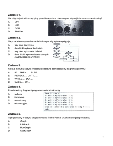 Zadanie 1. Na zdjęciu jest widoczny tylny panel komputera. Jak nazywa się wejście oznaczone strzałką? A. LPT B. USB C. COM D. FireWire Zadanie 2. Na przedstawionym schemacie blokowym algorytmu występują A. trzy bloki decyzyjne. B. dwa bloki wykonania działań. C. D. trzy bloki wykonania działań. dwa bloki wprowadzania danych /wyprowadzania wyników. Zadanie 3. Którą z instrukcji języka Pascal przedstawia zamieszczony diagram algorytmu? A. IF....THEN .... ELSE.... B. REPEAT.... UNTIL.... C. WHILE.... DO.... D. CASE.... OF.. Zadanie 4. Przedstawiony fragment programu zawiera instrukcję A. B. wyboru. iteracyjną. C. warunkową. D. rekurencyjną. Zadanie 5. Tryb graficzny w języku programowania Turbo Pascal uruchamiany jest procedurą A. Graph B. InitGraph C. RunGraph D. StartGraph 1 Zadanie 6. Które ze złączy oznaczonych strzałkami na schemacie monitora jest wejściem cyfrowym? A. Złącze 1. B. Złącze 2. C. Złącza 1 i 2. D. śadne ze złączy. Zadanie 7. Jaką funkcję pełni układ zaznaczony strzałką na schemacie karty graficznej? A. Oblicza kolory kaŜdego wyświetlanego piksela. B. Ustala widoczność i przesłanianie się obiektów na ekranie. C. Wykonuje kalkulacje oświetlenia, uwzględniając połoŜenie światła. D. Oblicza wygląd i połoŜenie wielokątów, z których zbudowany jest obiekt. 2 Zadanie 8. Rysunek przedstawia schemat blokowy karty dźwiękowej. Jaką funkcję pełni układ oznaczony cyfrą 1 ? A. Wzmacnia sygnał wejściowy. B. Wzmacnia sygnał wyjściowy, C. Zamienia sygnał analogowy na cyfrowy. D. Zamienia sygnał cyfrowy na analogowy. Zadanie 9. Proces optymalizacji relacyjnej powtarzających się danych, to A. relacja. B. redukcja. C. planowanie. D. normalizacja. bazy danych, mający na celu eliminację Zadanie 10. Active Directory w systemach MS Windows Server 2000 i MS Windows Server 2003 to A. baza danych zawierająca informacje o uŜytkownikach sieci, ich hasłach dostępu i uprawnieniach. B. logiczna grupa komputerów, które mają moŜliwość komunikowania się w sieci i wzajemnego udostępniania zasobów. C. grupa komputerów połączonych w sieć, składająca się z serwera pełniącego rolę kontrolera oraz stacji roboczych - klientów. D. usługa katalogowa, która przechowuje informacje dotyczące obiektów w sieci i udostępnia je uŜytkownikom oraz administratorom sieci. 3 Zadanie 11. Podstawowym elementem bazy danych zawierającym kompletny opis jednego obiektu bazy jest A. plik. B. pole. C. rekord. D. tabela. Zadanie 12. POP3 jest A. protokołem wysyłania e-mail. B. protokołem odbierania e-mail. C. programem pocztowym. D. serwerem pocztowym. Zadanie 13. Procesor RISC to procesor A. z pełną listą rozkazów. B. z główną listą rozkazów. C. z kompleksową listą rozkazów. D. ze zredukowaną listą rozkazów. Zadanie 14. W dokumentacji systemu operacyjnego Windows rozszerzeniem .dll. Rozszerzenie to dotyczy pliku A. biblioteki. B. uruchamialnego. C. inicjalizacyjnego. D. dziennika zdarzeń. XP opisane są pliki z Zadanie 15. Licencja OEM to A. dokument, który zezwala na uŜywanie oprogramowania na dowolnym sprzęcie komputerowym w określonej w niej ilości stanowisk, bez instalacyjnych dyskietek, czy krąŜków CD. B. licencja czyniąca z oprogramowania własność ogółu, w myśl której autor lub autorzy oprogramowania zrzekają się praw do upowszechniania oprogramowania na rzecz ogółu uŜytkowników. C. licencja oprogramowania wyłącznie na system komputerowy, na którym zostało oryginalnie zainstalowane, dotyczy oprogramowania sprzedawanego z nowymi komputerami lub odpowiednimi częściami. D. licencja uprawniająca uŜytkownika do zainstalowania nabytego oprogramowania tylko w jednym komputerze, obejmująca zakaz udostępniania takiego programowania w sieci oraz na innych wolnostojących komputerach. 4 Zadanie 16. W opisie programu C++ Builder jest wymieniona biblioteka VCL Co oznacza ten skrót? A. Visual Command Label B. Virtual Command Label C. Visual Component Library D. Virtual Component Library Zadanie 17. Procesor Athlon 2800+ to A. procesor firmy Intel taktowany częstotliwością 2,8 GB. B. procesor firmy AMD taktowany częstotliwością 2,8 GB. C. procesor firmy AMD o wydajności podobnej do procesora Pentium 4 taktowanego częstotliwością 2,8 GHz. D. procesor firmy Intel o wydajności podobnej do procesora Pentium 4 taktowanego częstotliwością 2,8 GHz. Zadanie 18. Przełącznik sieciowy standardu Fast Ethernet umoŜliwia transmisję danych z maksymalną prędkością A. 100Mbps B. 100 MB/s C. 10Mbps D. 10 MB/s Zadanie 19. Najbardziej zaawansowany tryb pracy portu równoległego standardu IEEE-1284 tworzący dwukierunkową magistralę 8-bitową mogącą przesyłać zarówno dane, jak i adresy z maksymalną szybkością transmisji do 2,3 MB/s, pozwalający na podłączenie do 64 urządzeń, to A. EPPMode. B. ByteMode. C. Nibble Modę. D. Compatilibility Mode. 5 Zadanie 20. Zamieszczona lista kroków przedstawia algorytm sortowania A. szybkiego. B. przez wybór. C. D. bąbelkowego. przez wstawienie. Zadanie 21. Przedstawiony w postaci listy kroków algorytm przypisuje A. wartość O wszystkim elementom macierzy. B. wartość 1 wszystkim elementom macierzy. C. wartość O elementom na przekątnej macierzy. D. wartość 1 elementom na przekątnej macierzy. Zadanie 22. Jaka będzie wyświetlona wartość zmiennej K po wykonaniu załączonego fragmentu programu? A. 30 B. 31 C. 32 D. 34 6 Zadanie 23. W wyniku wykonania przedstawionej instrukcji iteracyjnej wyświetlone zostaną liczby A. parzyste 0-98 B. parzyste O-100 C. D. nieparzyste 1-99 nieparzyste 1-101 Zadanie 24. Gdzie w edytorze tekstu wprowadza się informację lub ciąg znaków, który ma pojawić się na wszystkich stronach dokumentu? A. W polu tekstowym. B. W przypisach dolnych. C. W nagłówku lub stopce. D. W przypisach końcowych. Zadanie 25. JeŜeli w komórce arkusza kalkulacyjnego MS Excel, zamiast cyfr pojawiają się zna