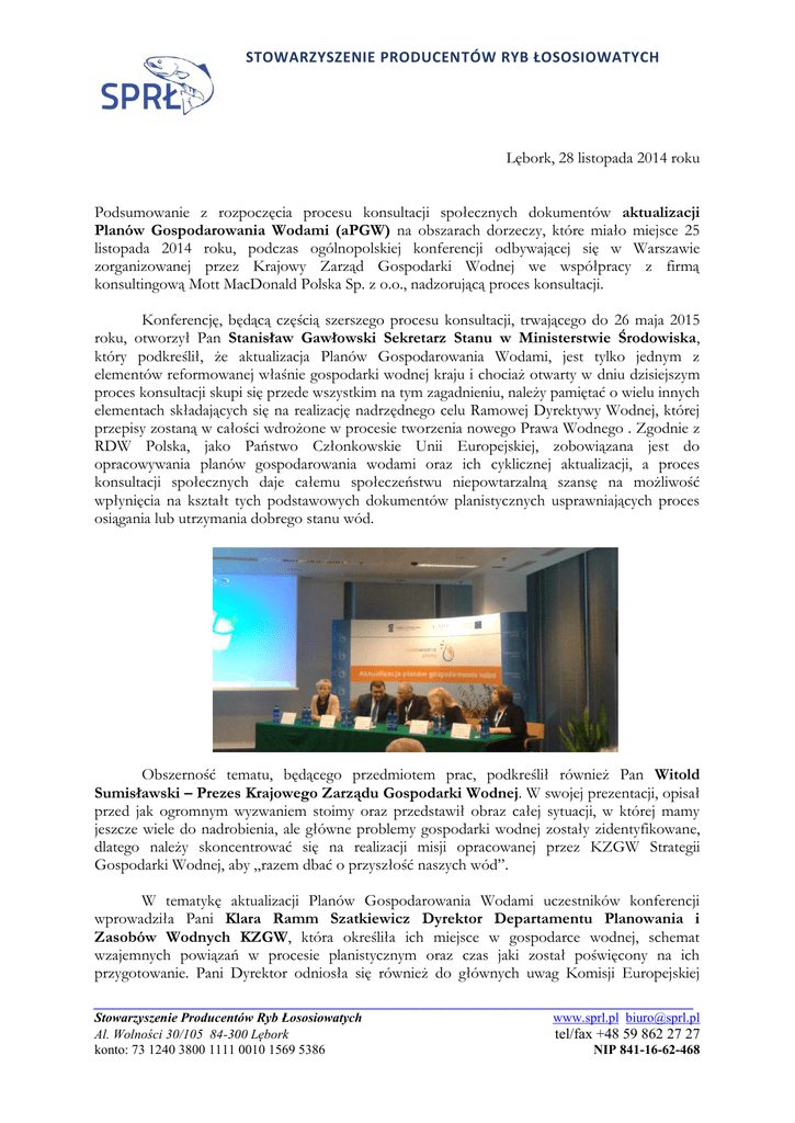STOWARZYSZENIE PRODUCENTÓW RYB ŁOSOSIOWATYCH Lębork, 28 listopada 2014 roku Podsumowanie z rozpoczęcia procesu konsultacji społecznych dokumentów aktualizacji Planów Gospodarowania Wodami (aPGW) na obszarach dorzeczy, które miało miejsce 25 listopada 2014 roku, podczas ogólnopolskiej konferencji odbywającej się w Warszawie zorganizowanej przez Krajowy Zarząd Gospodarki Wodnej we współpracy z firmą konsultingową Mott MacDonald Polska Sp. z o.o., nadzorującą proces konsultacji. Konferencję, będącą częścią szerszego procesu konsultacji, trwającego do 26 maja 2015 roku, otworzył Pan Stanisław Gawłowski Sekretarz Stanu w Ministerstwie Środowiska, który podkreślił, że aktualizacja Planów Gospodarowania Wodami, jest tylko jednym z elementów reformowanej właśnie gospodarki wodnej kraju i chociaż otwarty w dniu dzisiejszym proces konsultacji skupi się przede wszystkim na tym zagadnieniu, należy pamiętać o wielu innych elementach składających się na realizację nadrzędnego celu Ramowej Dyrektywy Wodnej, której przepisy zostaną w całości wdrożone w procesie tworzenia nowego Prawa Wodnego . Zgodnie z RDW Polska, jako Państwo Członkowskie Unii Europejskiej, zobowiązana jest do opracowywania planów gospodarowania wodami oraz ich cyklicznej aktualizacji, a proces konsultacji społecznych daje całemu społeczeństwu niepowtarzalną szansę na możliwość wpłynięcia na kształt tych podstawowych dokumentów planistycznych usprawniających proces osiągania lub utrzymania dobrego stanu wód. Obszerność tematu, będącego przedmiotem prac, podkreślił również Pan Witold Sumisławski – Prezes Krajowego Zarządu Gospodarki Wodnej. W swojej prezentacji, opisał przed jak ogromnym wyzwaniem stoimy oraz przedstawił obraz całej sytuacji, w której mamy jeszcze wiele do nadrobienia, ale główne problemy gospodarki wodnej zostały zidentyfikowane, dlatego należy skoncentrować się na realizacji misji opracowanej przez KZGW Strategii Gospodarki Wodnej, aby „razem dbać o przyszłość naszych wód”. W tematykę aktualizacji Planów Gospodarowania Wodami uczestników konferencji wprowadziła Pani Klara Ramm Szatkiewicz Dyrektor Departamentu Planowania i Zasobów Wodnych KZGW, która określiła ich miejsce w gospodarce wodnej, schemat wzajemnych powiązań w procesie planistycznym oraz czas jaki został poświęcony na ich przygotowanie. Pani Dyrektor odniosła się również do głównych uwag Komisji Europejskiej __________________________________________________________________________________________ Stowarzyszenie Producentów Ryb Łososiowatych www.sprl.pl [email protected] Al. Wolności 30/105 84-300 Lębork tel/fax +48 59 862 27 27 konto: 73 1240 3800 1111 0010 1569 5386 NIP 841-16-62-468 STOWARZYSZENIE PRODUCENTÓW RYB ŁOSOSIOWATYCH sformułowanych w ramach oceny pierwszych planów. Po raz kolejny zostało podkreślone znaczenie konsultacji społecznych, które będą odbywały się na poziomie krajowym i regionalnym a ponadto zostaną wzbogacone o organizację w Warszawie – Krajowego Forum Wodnego w dniach 25 – 26 marca 2015 roku. Projekt aktualizacji Programu Wodno – Środowiskowego Kraju omówiły Panie Katarzyna Banaszak i Marta Saracyn. Zgodnie z Ramową Dyrektywą Wodną wypełnieniem zobowiązania dotyczącego wspólnotowego działania w dziedzinie polityki wodnej, jest Program Wodno – Środowiskowy Kraju (PWŚK) stanowiący kluczowy element planów gospodarowania wodami. Programy działań w ramach PWŚK mają zapewnić osiągnięcie ustalonych celów środowiskowych. Na działania realizowane w podziale na poszczególne Jednolite Części Wód (JCW) zostanie przeznaczonych blisko 28 mld zł. Pani Agnieszka Hobot prezentując informacje na temat projektu aktualizacji Planów Gospodarowania Wodami podkreśliła, że powinny w nich zostać zaimplementowane działania ze wszystkich dyrektyw UE z zakresu polityki wodnej. Ponieważ już wiemy, że do 2015 roku nie osiągniemy wystarczającej poprawy stanu wód, będziemy musieli starać się o odstępstwa, dlatego też omówione zostały ich rodzaje oraz warunki zastosowania derogacji. Znaczna część prezentacji dotyczyła także oceny wpływu realizowanych inwestycji na wody, ponieważ w planach będą umieszczane tylko te z nich wpływające na stan wód. Będzie także możliwe zgłaszanie nowych inwestycji w trakcie aktualizacji PGW, czego nie można było robić do tej pory. Kolejna część konferencji poświęcona została planom zarządzania ryzykiem powodziowym w kontekście planów gospodarowania wodami. Pracownicy IMGW – PIB Pani Marta Bedryj oraz Pan Andrzej Tiukało w swoich prezentacjach odnieśli się do głównego celu zarządzania ryzykiem powodziowym, czyli ograniczenia potencjalnych negatywnych skutków powodzi dla życia i zdrowia ludzi, środowiska, dziedzictwa kulturowego oraz działalności gospodarczej. Pani Marta Bedryj omówiła między innymi wzajemne powiązania pomiędzy Ramową Dyrektywą Wodną i Dyrektywą Powodziową, a Pan Andrzej Tiukało odniósł się do metodyki opracowania Planów Zarządzania Ryzykiem Powodziowym (PZRP). PODSUMOWANIE Konferencja krajowa rozpoczynająca proces konsultacji, toczących się na niespotykaną dotąd skalę oraz w zdecydowanie dłuższym okresie czasu (6 miesięcy, 25 listopada 2014 roku – 26 maja 2015 roku), stworzyła nam możliwość wyobrażenia sobie kształtu konsultacji planowanych również na poziomie regionalnym. W najbliższym czasie planowany jest cykl spotkań, w których przedstawiciele hodowców ryb na pewno powinni brać udział, a ich terminy wyglądają następująco: 13 stycznia 2015 roku – Warszawa – Konferencja, na której zostaną przedstawione Plany Zarządzania Ryzykiem Przeciwpowodziowym; 3 lutego 2015 roku - Warszawa – spotkanie dotyczące Planów Gospodarowania Wodami oraz Planów Zarządzania Ryzykiem Przeciwpowodziowym; 9 marca 2015 roku – Poznań – spotkanie
