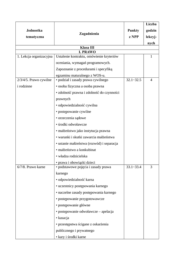 Liczba Jednostka Zagadnienia tematyczna Punkty godzin z NPP lekcyjnych Klasa III I. PRAWO 1. Lekcja organizacyjna Ustalenie kontraktu, omówienie kryteriów 1 oceniania, wymagań programowych. Zapoznanie z procedurami i specyfiką 2/3/4/5. Prawo cywilne egzaminu maturalnego z WOS-u. • podział i zasady prawa cywilnego i rodzinne • osoba fizyczna a osoba prawna 32.1−32.5 4 33.1−33.4 3 • zdolność prawna i zdolność do czynności prawnych • odpowiedzialność cywilna • postępowanie cywilne • orzeczenia sądowe • środki odwoławcze • małżeństwo jako instytucja prawna • warunki i skutki zawarcia małżeństwa • ustanie małżeństwa (rozwód) i separacja • małżeństwo a konkubinat • władza rodzicielska 6/7/8. Prawo karne • prawa i obowiązki dzieci • podstawowe pojęcia i zasady prawa karnego • odpowiedzialność karna • uczestnicy postępowania karnego • naczelne zasady postępowania karnego • postępowanie przygotowawcze • postępowanie główne • postępowanie odwoławcze – apelacja • kasacja • przestępstwa ścigane z oskarżenia publicznego i prywatnego • kary i środki karne • prawa przysługujące ofierze, oskarżonemu 9/10. Prawo i świadkowi • akt administracyjny i inne dokumenty administracyjne • kryteria ważności aktu administracyjnego 34.1−34.3 2 35.1−35.3 1 • sądownictwo administracyjne w Polsce • typy postępowania administracyjnego • uczestnicy postępowania administracyjnego • przebieg postępowania administracyjnego • decyzje i postanowienia • odwołanie i zażalenie • skarga do wojewódzkiego sądu administracyjnego • skarga kasacyjna do Naczelnego Sądu 11. Obywatel wobec Administracyjnego • pomoc prawna prawa • pozew w sprawie cywilnej • nieprocesowy tryb spraw cywilnych • zawiadomienie o popełnieniu przestępstwa • odwołanie od decyzji administracyjnej • prawa konsumentów 12/13. Podsumowanie 2 wiadomości – prawo. 14. Sprawdzian 1 wiadomości – prawo. 15/16/17. Stosunki II. STOSUNKI MIĘDZYNARODOWE • podmioty stosunków międzynarodowych i międzynarodowe w prawa międzynarodowego 40.3−40.4, wymiarze globalnym • międzynarodowe prawo publiczne 44.2, 44.4 • społeczność międzynarodowa • ład międzynarodowy i jego typy • stosunki międzynarodowe w perspektywie historycznej • ład westfalski, wersalski, jałtański i postzimnowojenny • nowe osie podziału świata • bogata Północ i biedne Południe 40.1, 3 • przyczyny dysproporcji pomiędzy Północą a Południem 18/19. Globalizacja • pomoc rozwojowa dla krajów Południa • istota globalizacji współczesnego świata • etapy globalizacji 41.1−41.3 2 40.2, 3 • gospodarczy, polityczny, komunikacyjny, ekologiczny i kulturowy wymiar globalizacji • skutki globalizacji • najważniejsi aktorzy globalizacji • Światowa Organizacja Handlu • Bank Światowy • Międzynarodowy Fundusz Walutowy • Organizacja Współpracy Gospodarczej i Rozwoju • korporacje międzynarodowe • organizacje pozarządowe i media 20/21/22. Współczesne • ruch alterglobalistyczny • istota konfliktów międzynarodowych konflikty • przyczyny konfliktów zbrojnych w międzynarodowe przeszłości 40.5−40.8 • współczesne konflikty zbrojne • przyczyny konfliktów w XXI w. • podział konfliktów • terroryzm • metody działań terrorystów • rodzaje terroryzmu ze względu na motywacje sprawców • strategie walki z terroryzmem • pacyfizm • metody pokojowego rozstrzygania sporów 23/24. Organizacja • Pokojowa Nagroda Nobla • Liga Narodów Narodów • Karta atlantycka i Deklaracja Narodów Zjednoczonych Zjednoczonych • konferencja w San Francisco – Karta 42.1−42.3 2 Narodów Zjednoczonych • cele i zasady działania ONZ • organy ONZ – ich kompetencje i sposób działania • System Narodów Zjednoczonych • organizacje wyspecjalizowane Narodów Zjednoczonych • rola ONZ po II wojnie światowej i zakończeniu zimnej wojny 25/26/27/28. • reforma ONZ • bezpieczeństwo międzynarodowe Międzynarodowy • operacje pokojowe ONZ system bezpieczeństwa • sposoby zapewniania bezpieczeństwa 42.4−42.6, 4 43.8 międzynarodowego • Organizacja Paktu Północnoatlantyckiego – geneza, cele i struktura • relacje między państwami NATO a państwami nieczłonkowskimi • współczesne zadania NATO • Organizacja Bezpieczeństwa i Współpracy w Europie • koncepcja bezpieczeństwa OBWE • wybrane regionalne systemy 29/30/31/32/33. bezpieczeństwa i współpracy na świecie • idea zjednoczeniowa w historii Europy Integracja europejska • Paneuropa po II wojnie światowej • droga ku współczesnej integracji • plan Marshalla • koncepcje integracji • początek procesu integracji – powstanie EWWiS • ojcowie założyciele zjednoczonej Europy • pogłębianie integracji – EWG i Euratom • poszerzanie integracji • traktat z Maastricht • rozszerzenie UE 43.1, 43.6−43.8 5 • Rada Europy i OBWE a integracja europejska 34/35/36/37. Jak • traktaty europejskie funkcjonuje Unia • zasady ustrojowe UE Europejska? • Parlament Europejski 43.2−43.5 4 44.1, 44.3 1 39.1−39.5 3 • Rada Europejska • Rada Unii Europejskiej • Komisja Europejska • Trybunał Sprawiedliwości UE • Trybunał Obrachunkowy UE • Europejski Bank Centralny • organy doradcze UE • Unia Gospodarcza i Walutowa • polityka regionalna (spójności) • proces legislacyjny w UE 38. Europa wśród • budżet roczny UE • specyfika Unii Europejskiej światowych mocarstw • fiasko Konstytucji dla Europy • społeczeństwo europejskie • koncepcja europeizacji horyzontalnej • Europa a świat w XX w. • Unia Europejska w epoce globalnych 39/40/41. Polska przemian • istota polityki zagranicznej polityka zagraniczna • racja stanu • cele polityki zagranicznej • metody i środki realizacji polityki zagranicznej • dyplomacja • uwarunkowania polityki zagranicznej 
